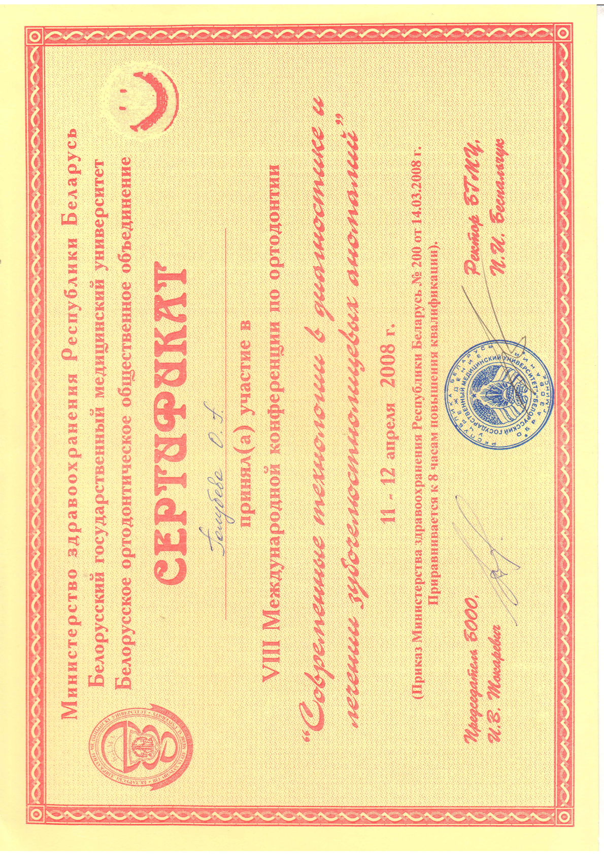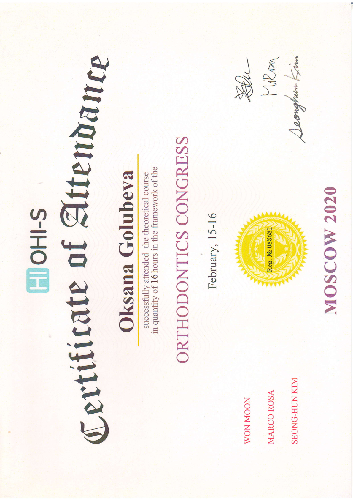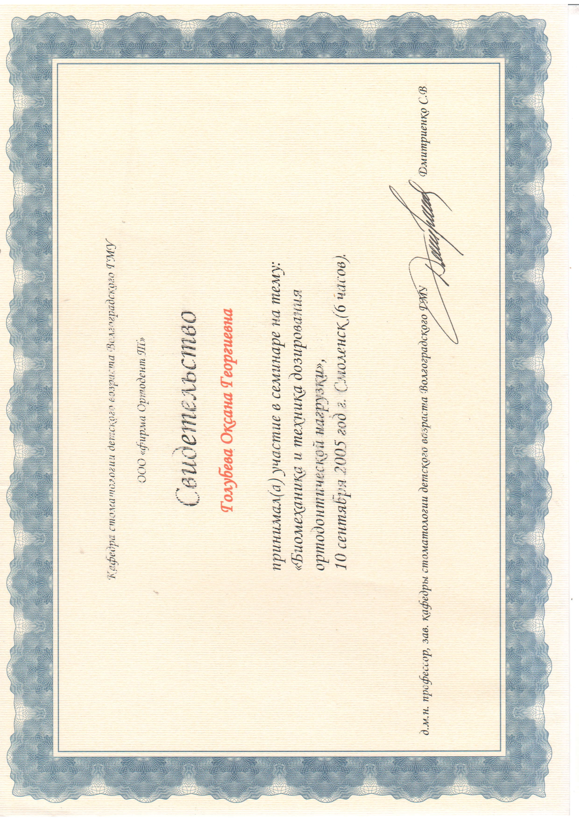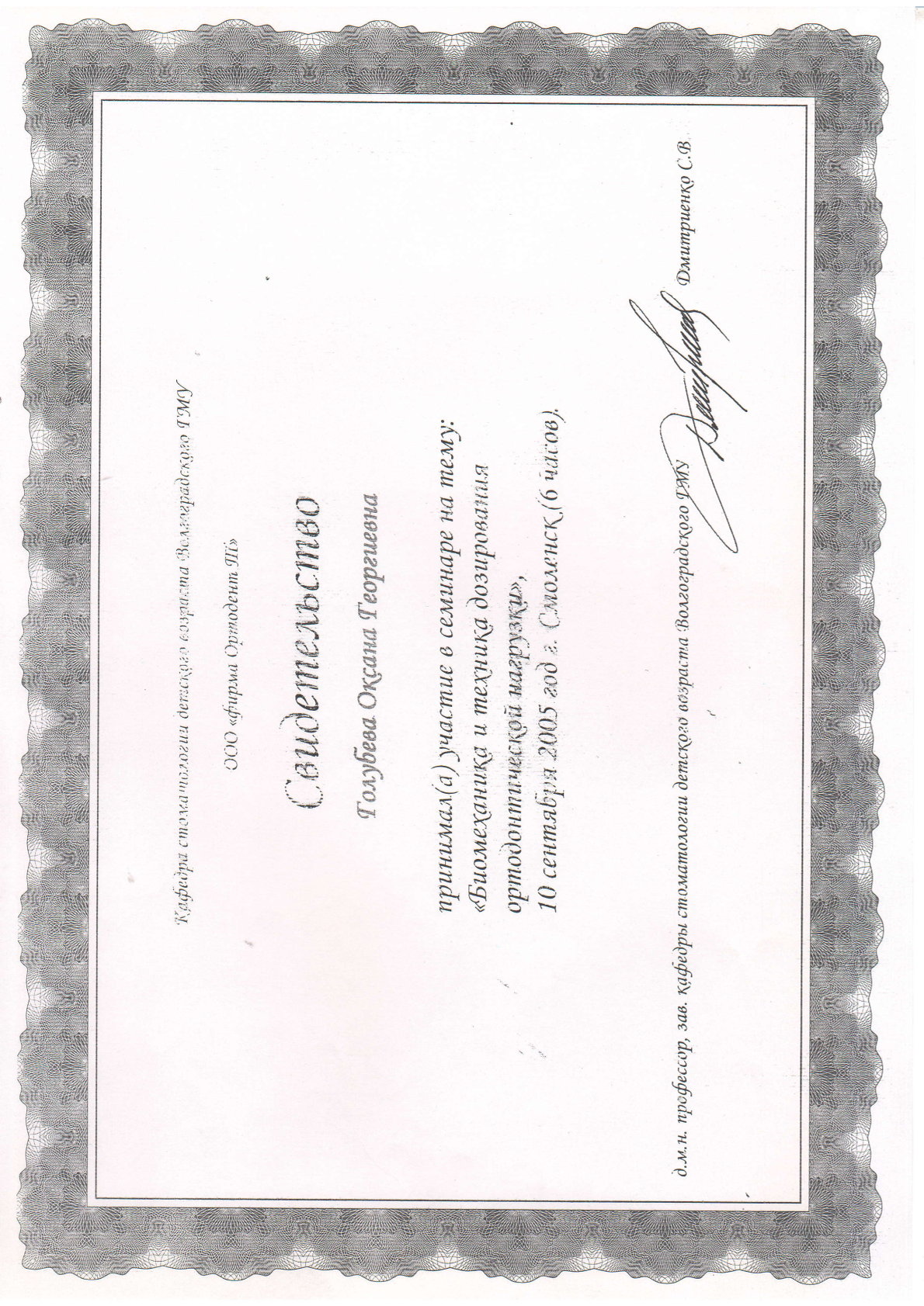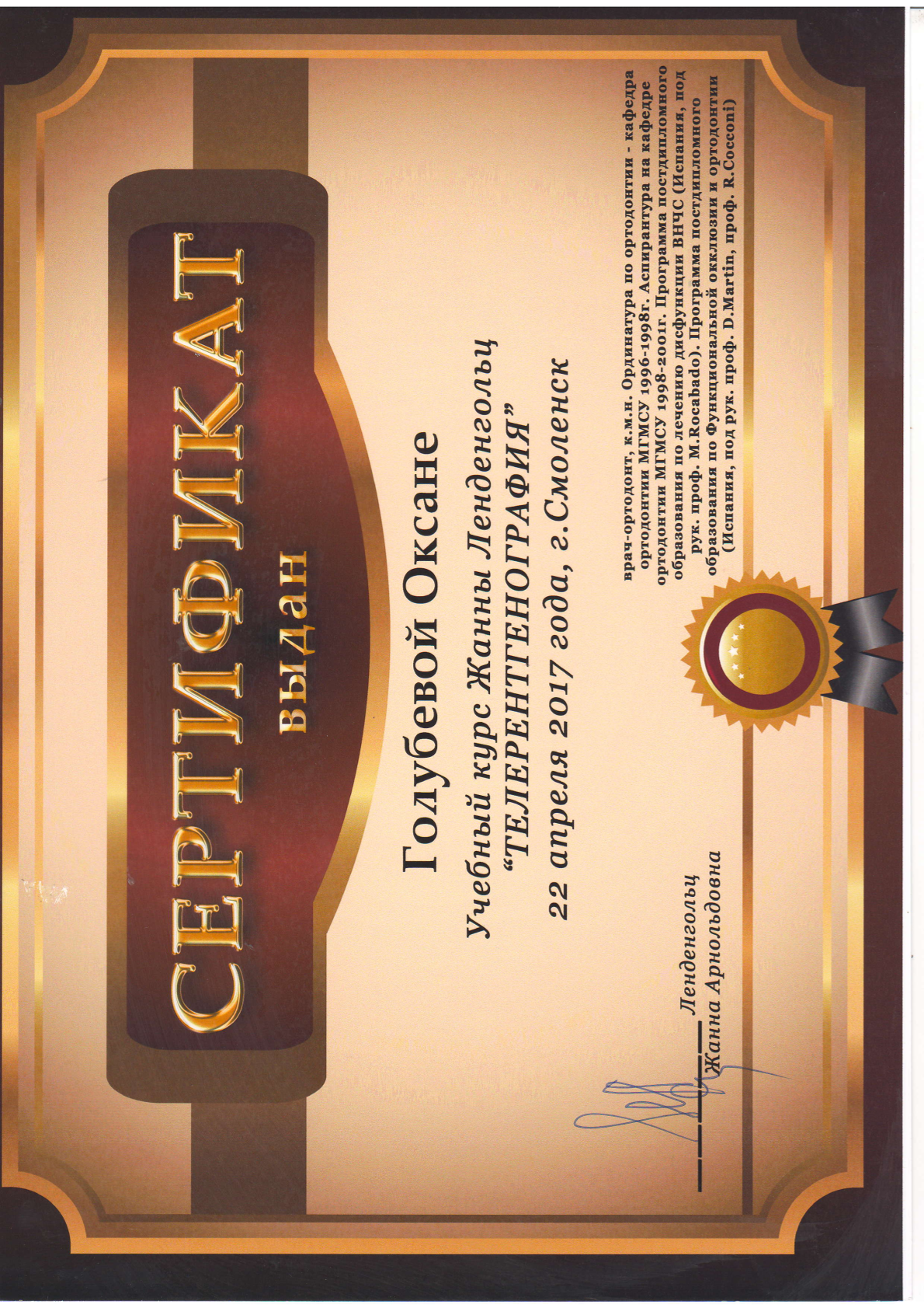 Высшее медицинское образование. Смоленский государственный медицинский институт, диплом №044812 24.06.1993 г., специальность «Стоматология» Интернатура: Смоленский государственный медицинский институт, специальность «Стоматология» 1.09.1993 — 28.08.1994 гг. Клиническая ординатура: 1995-1997 гг., специальность «Ортодонтия» Сертификат специалиста 1177181093149 от 30.11.2020г. «Ортодонтия». Удостоверение о повышении квалификации 771802730156 рег. номер 11/20-У9388 от 30.11.2020г. «Ортодонтия». Сведения о прохождении аккредитации специалиста: № 7725033695875 от 25.11.2025 года «Ортодонтия» • ВСЕРОССИЙСКАЯ КОНФЕРЕНЦИЯ "Стоматология в новых условиях хозяйствования", 29 сентября -4 октября 1997 года • 3M Unitek Seminar: NEW CONCEPTION IN ORTHODONTIC TREATMENT MECHANICS. MBT SYSTEM, 17-18 апреля 2004 года (Dr. Lars Christensen) • Участие в работе VII съезда ортодонтов России, 8-11 октября 2003 года • Участие в работе VI-го съезда ортодонтов России, 12-13 октября 2001 года • Семинар на тему: «Биомеханика и техника дозирования ортодонтической нагрузки», 10 сентября 2005 год года (Дмитриенко С. В.) • Micro Implant Anchorage Orthodontics The First International Conference "Microimplantation - future of Orthodontics" (Russian MIA). At support of company DENTOS Inc. - Worldwide Pioneers and Leaders in Microimplant Anchorage. Conducted at NORTA Co. Ltd, 28-29 октября 2009 года (Jae-Hyun Sung, Seong-Min Bae, Hee Moen Kyung • Training program on myofunctional correction products: TRAINER SYSTEM MYOBRACE SYSTEM TMJ SYSTEM POWRGARD SYSTEM developed and manufactured by MYOFUNCTIONAL RESEARCH Co. • Семинар на тему: «Физиологические и клинические аспекты лечения технологией ультраслабых сил», 14 октября 2006 года • Участие в работе VIII съезда ортодонтов России, 8-11 октября 2003 года • Курс: "Клиника боли лица и челюстей", 5 июня 2016 года (Granot Igal) • Участие в работе XVI Съезда ортодонтов России, 9-11 октября 2014 года • Учебный курс Жанны Ленденгольц "ТЕЛЕРЕНТГЕНОГРАФИЯ", 22 апреля 2017 года • Участие в VIII Международной конференции по ортодонтии "Современные технологии в диагностике и лечении зубочелостнолицевых аномалий", 11 - 12 апреля 2008 года • Тheoretical course ORTHODONTICS CONGRESS, 15-16 февраля 2020 года (WON MOON, MARCO ROSA, SEONG-HUN KIM)