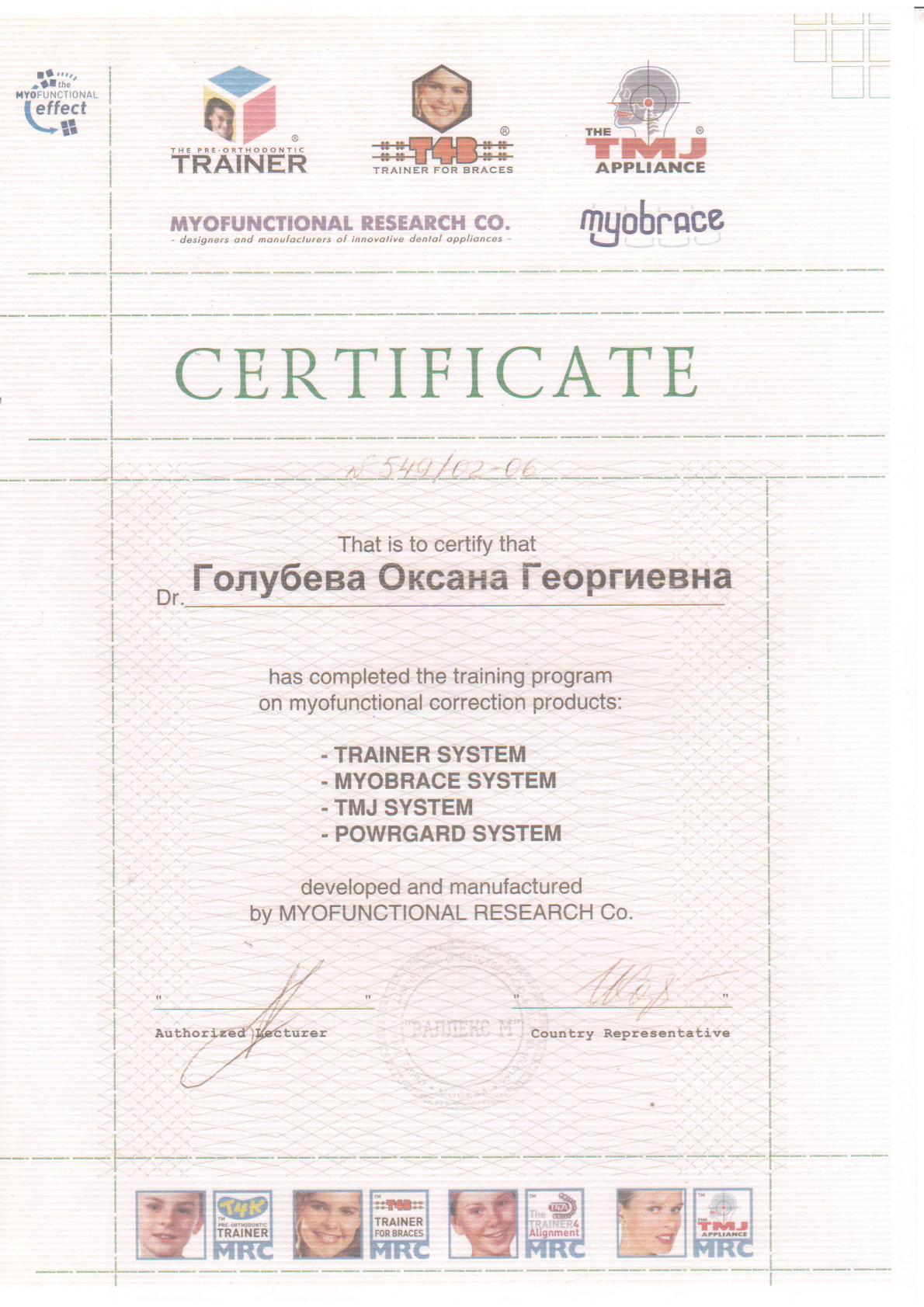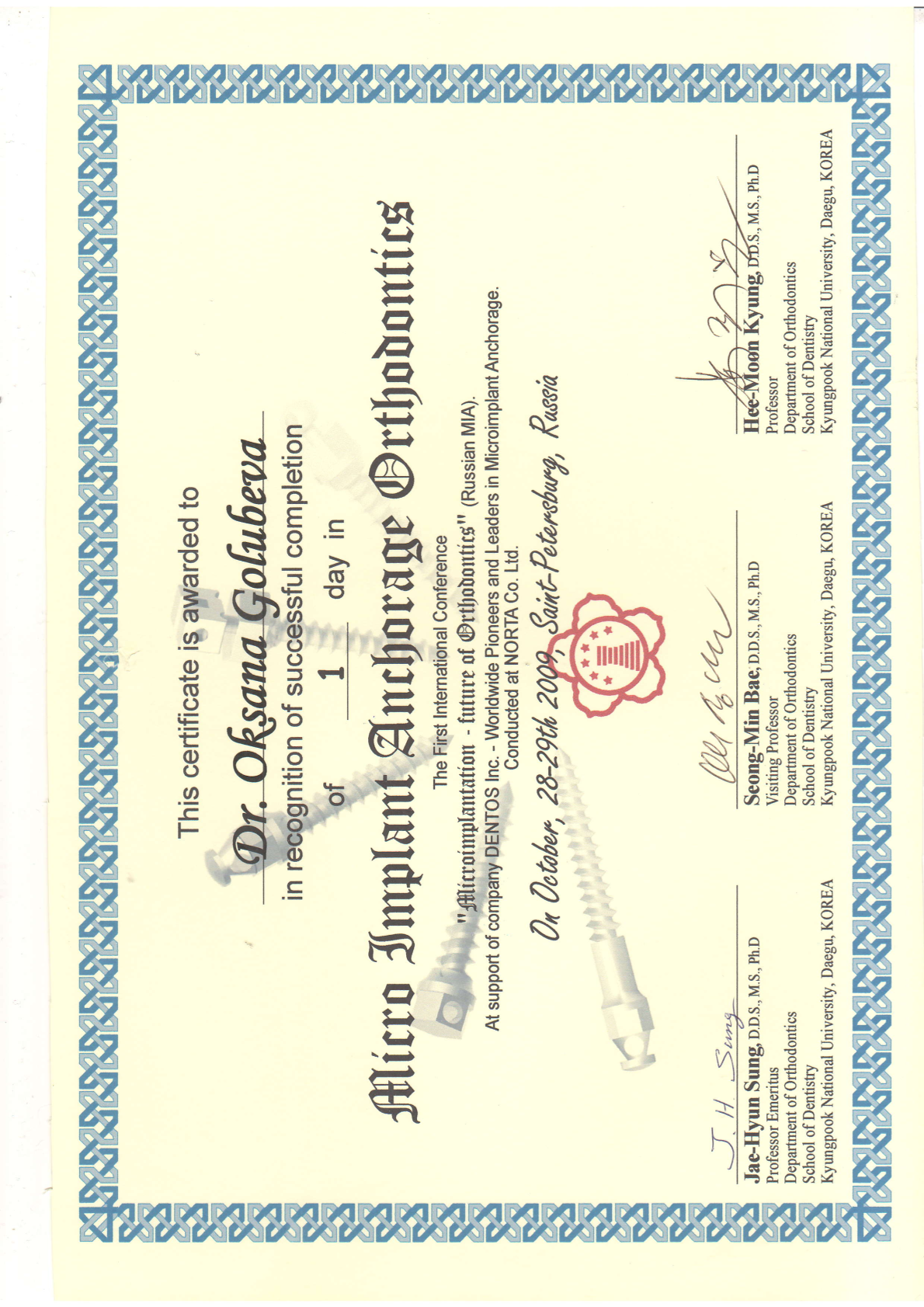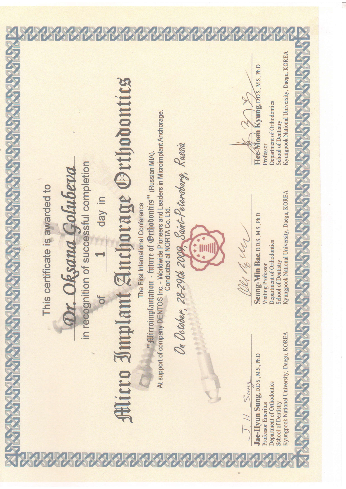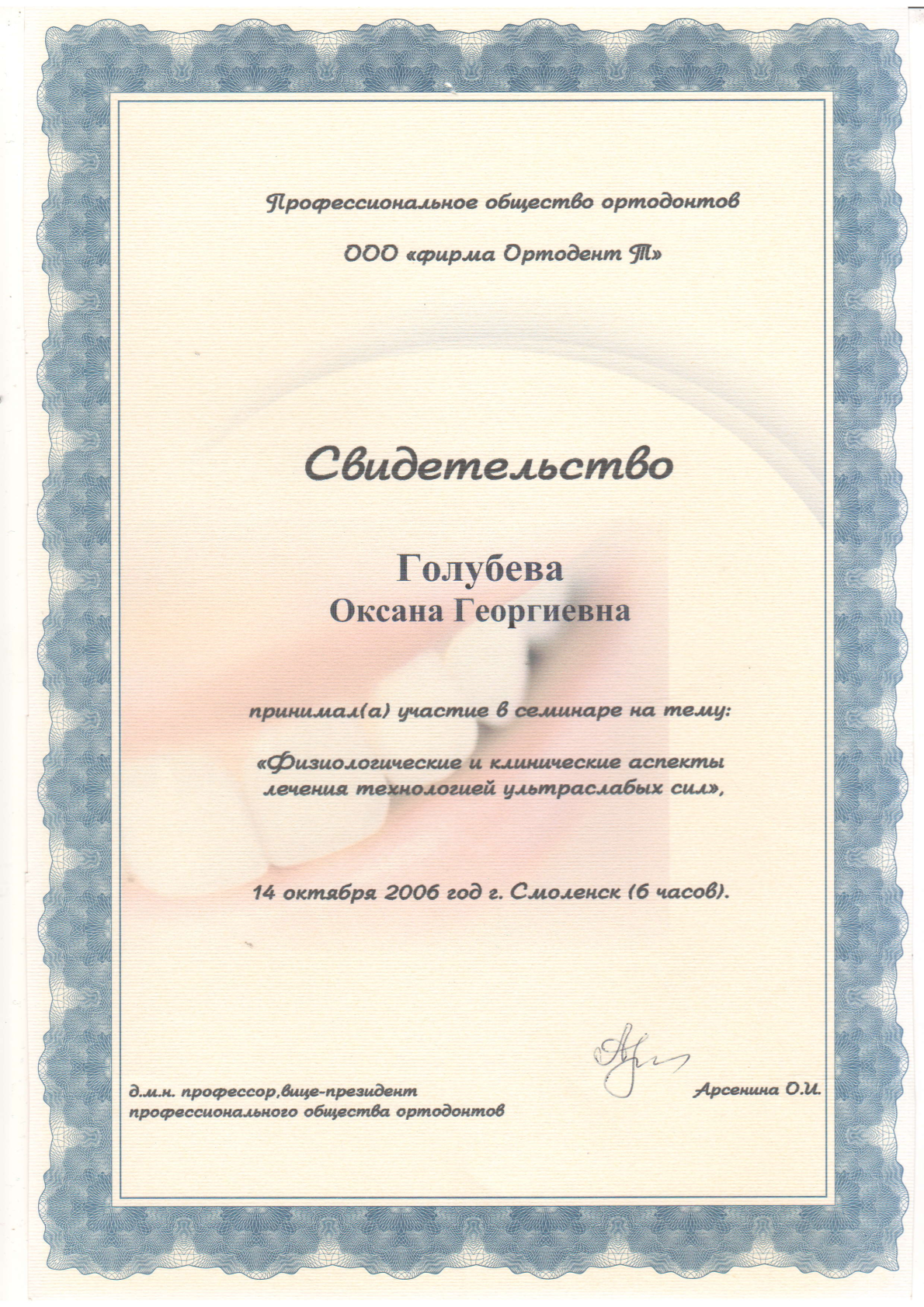 Высшее медицинское образование. Смоленский государственный медицинский институт, диплом №044812 24.06.1993 г., специальность «Стоматология» Интернатура: Смоленский государственный медицинский институт, специальность «Стоматология» 1.09.1993 — 28.08.1994 гг. Клиническая ординатура: 1995-1997 гг., специальность «Ортодонтия» Сертификат специалиста 1177181093149 от 30.11.2020г. «Ортодонтия». Удостоверение о повышении квалификации 771802730156 рег. номер 11/20-У9388 от 30.11.2020г. «Ортодонтия». Сведения о прохождении аккредитации специалиста: № 7725033695875 от 25.11.2025 года «Ортодонтия» • ВСЕРОССИЙСКАЯ КОНФЕРЕНЦИЯ "Стоматология в новых условиях хозяйствования", 29 сентября -4 октября 1997 года • 3M Unitek Seminar: NEW CONCEPTION IN ORTHODONTIC TREATMENT MECHANICS. MBT SYSTEM, 17-18 апреля 2004 года (Dr. Lars Christensen) • Участие в работе VII съезда ортодонтов России, 8-11 октября 2003 года • Участие в работе VI-го съезда ортодонтов России, 12-13 октября 2001 года • Семинар на тему: «Биомеханика и техника дозирования ортодонтической нагрузки», 10 сентября 2005 год года (Дмитриенко С. В.) • Micro Implant Anchorage Orthodontics The First International Conference "Microimplantation - future of Orthodontics" (Russian MIA). At support of company DENTOS Inc. - Worldwide Pioneers and Leaders in Microimplant Anchorage. Conducted at NORTA Co. Ltd, 28-29 октября 2009 года (Jae-Hyun Sung, Seong-Min Bae, Hee Moen Kyung • Training program on myofunctional correction products: TRAINER SYSTEM MYOBRACE SYSTEM TMJ SYSTEM POWRGARD SYSTEM developed and manufactured by MYOFUNCTIONAL RESEARCH Co. • Семинар на тему: «Физиологические и клинические аспекты лечения технологией ультраслабых сил», 14 октября 2006 года • Участие в работе VIII съезда ортодонтов России, 8-11 октября 2003 года • Курс: "Клиника боли лица и челюстей", 5 июня 2016 года (Granot Igal) • Участие в работе XVI Съезда ортодонтов России, 9-11 октября 2014 года • Учебный курс Жанны Ленденгольц "ТЕЛЕРЕНТГЕНОГРАФИЯ", 22 апреля 2017 года • Участие в VIII Международной конференции по ортодонтии "Современные технологии в диагностике и лечении зубочелостнолицевых аномалий", 11 - 12 апреля 2008 года • Тheoretical course ORTHODONTICS CONGRESS, 15-16 февраля 2020 года (WON MOON, MARCO ROSA, SEONG-HUN KIM)