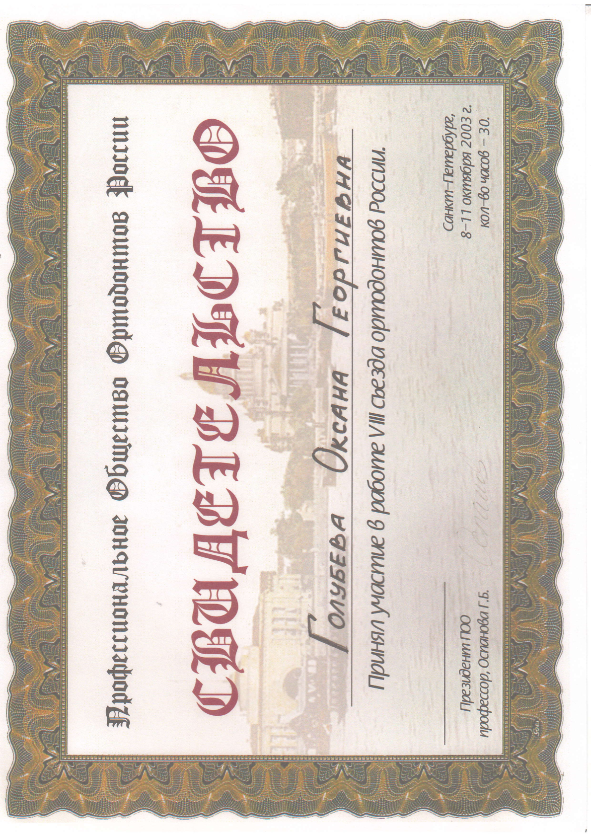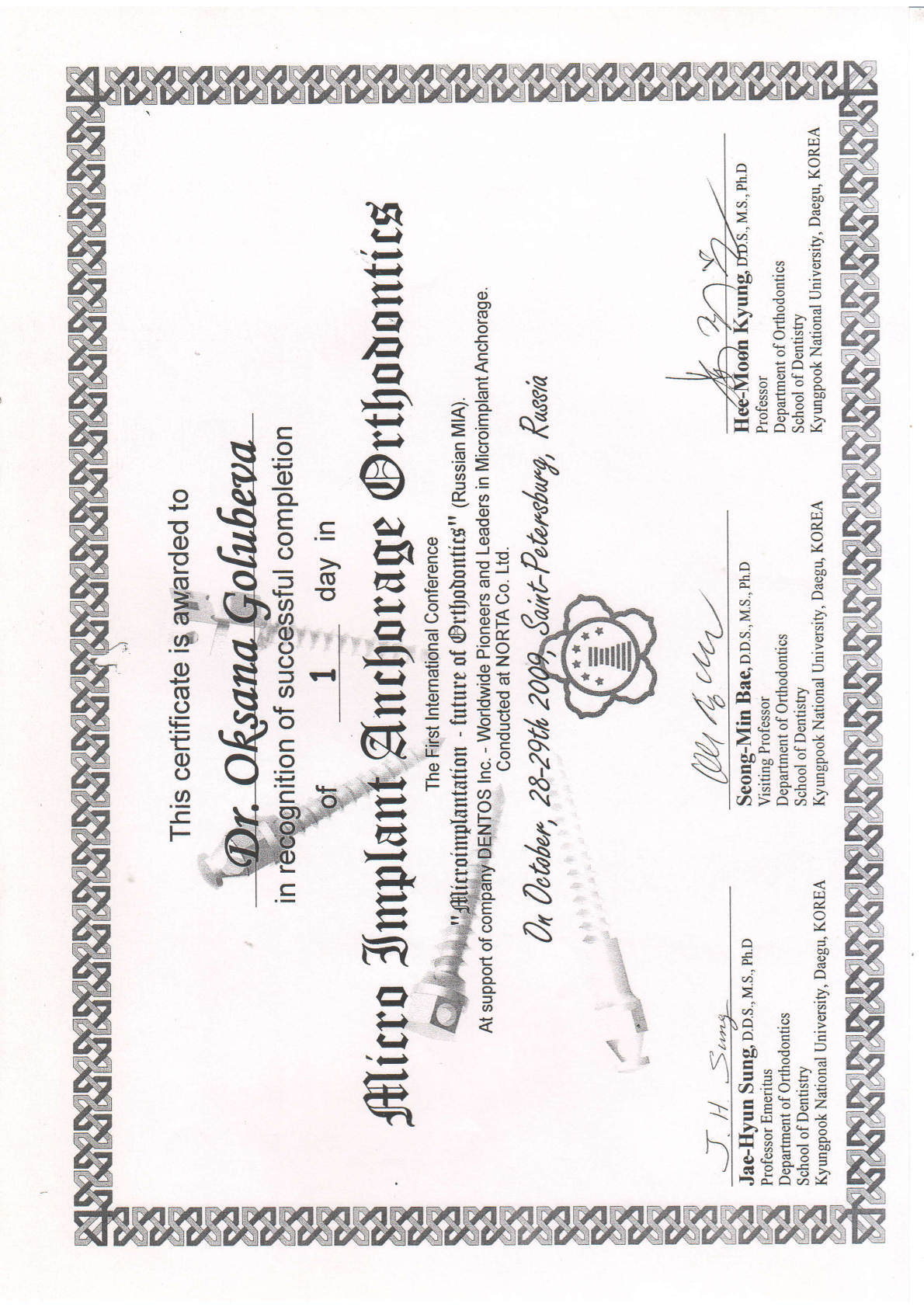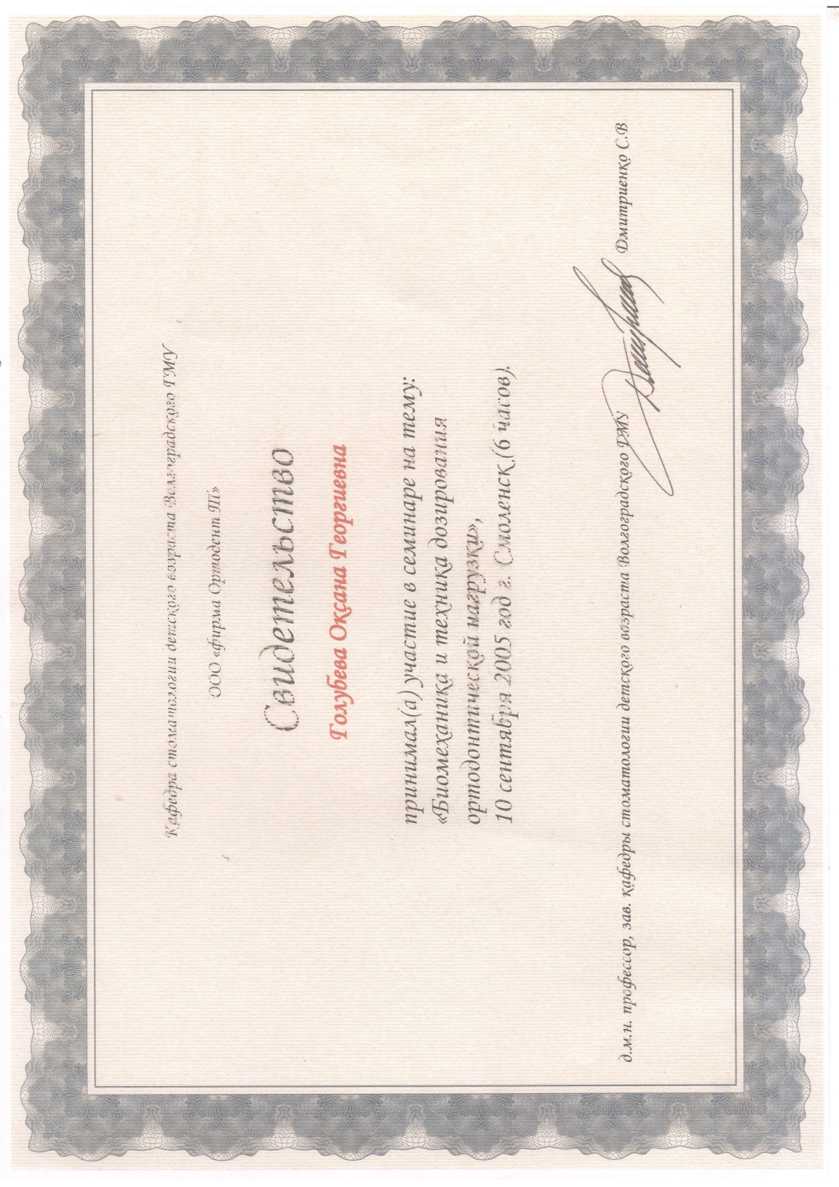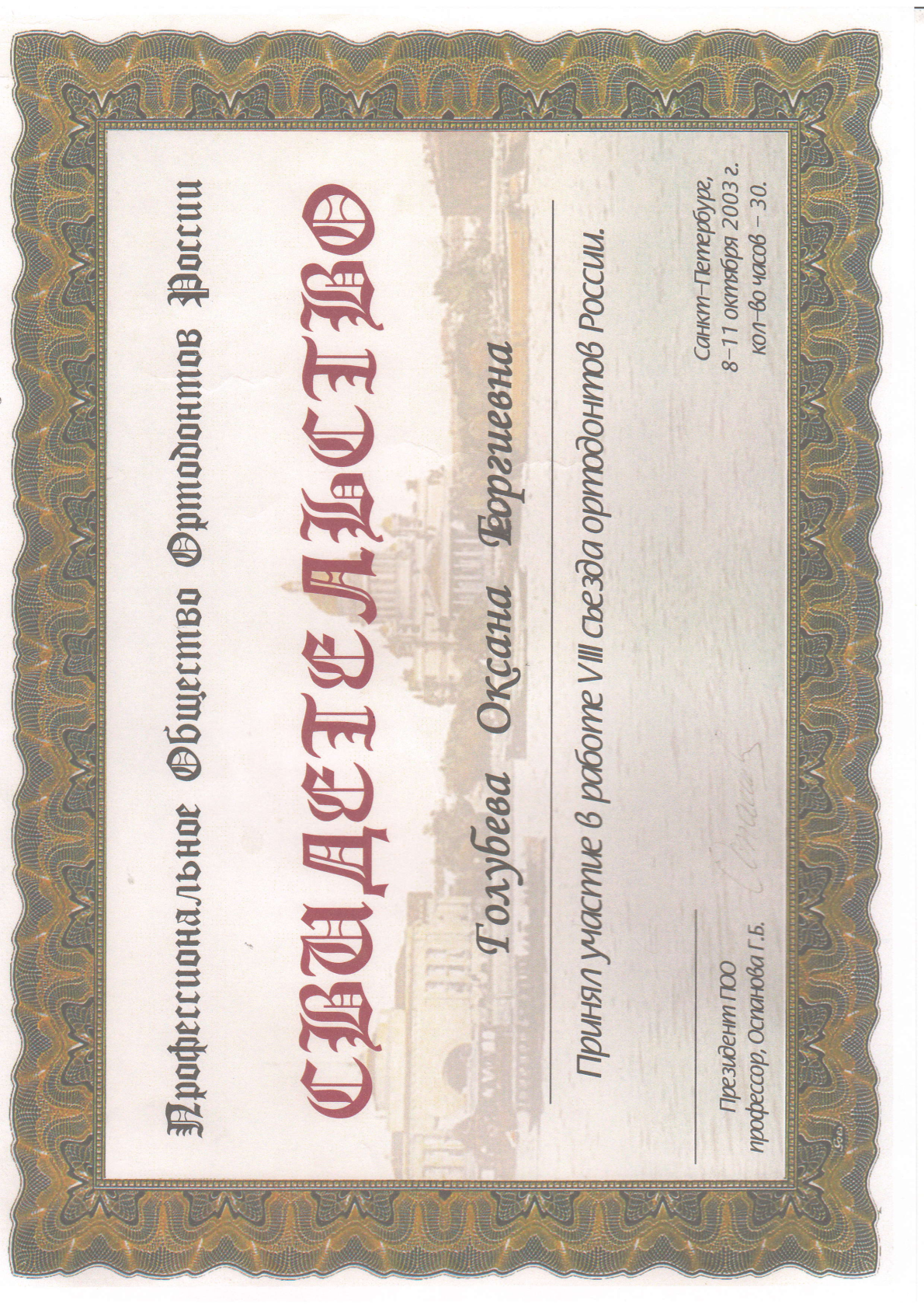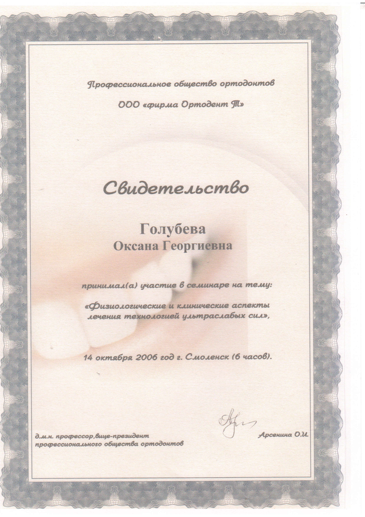 Высшее медицинское образование. Смоленский государственный медицинский институт, диплом №044812 24.06.1993 г., специальность «Стоматология» Интернатура: Смоленский государственный медицинский институт, специальность «Стоматология» 1.09.1993 — 28.08.1994 гг. Клиническая ординатура: 1995-1997 гг., специальность «Ортодонтия» Сертификат специалиста 1177181093149 от 30.11.2020г. «Ортодонтия». Удостоверение о повышении квалификации 771802730156 рег. номер 11/20-У9388 от 30.11.2020г. «Ортодонтия». Сведения о прохождении аккредитации специалиста: № 7725033695875 от 25.11.2025 года «Ортодонтия» • ВСЕРОССИЙСКАЯ КОНФЕРЕНЦИЯ "Стоматология в новых условиях хозяйствования", 29 сентября -4 октября 1997 года • 3M Unitek Seminar: NEW CONCEPTION IN ORTHODONTIC TREATMENT MECHANICS. MBT SYSTEM, 17-18 апреля 2004 года (Dr. Lars Christensen) • Участие в работе VII съезда ортодонтов России, 8-11 октября 2003 года • Участие в работе VI-го съезда ортодонтов России, 12-13 октября 2001 года • Семинар на тему: «Биомеханика и техника дозирования ортодонтической нагрузки», 10 сентября 2005 год года (Дмитриенко С. В.) • Micro Implant Anchorage Orthodontics The First International Conference "Microimplantation - future of Orthodontics" (Russian MIA). At support of company DENTOS Inc. - Worldwide Pioneers and Leaders in Microimplant Anchorage. Conducted at NORTA Co. Ltd, 28-29 октября 2009 года (Jae-Hyun Sung, Seong-Min Bae, Hee Moen Kyung • Training program on myofunctional correction products: TRAINER SYSTEM MYOBRACE SYSTEM TMJ SYSTEM POWRGARD SYSTEM developed and manufactured by MYOFUNCTIONAL RESEARCH Co. • Семинар на тему: «Физиологические и клинические аспекты лечения технологией ультраслабых сил», 14 октября 2006 года • Участие в работе VIII съезда ортодонтов России, 8-11 октября 2003 года • Курс: "Клиника боли лица и челюстей", 5 июня 2016 года (Granot Igal) • Участие в работе XVI Съезда ортодонтов России, 9-11 октября 2014 года • Учебный курс Жанны Ленденгольц "ТЕЛЕРЕНТГЕНОГРАФИЯ", 22 апреля 2017 года • Участие в VIII Международной конференции по ортодонтии "Современные технологии в диагностике и лечении зубочелостнолицевых аномалий", 11 - 12 апреля 2008 года • Тheoretical course ORTHODONTICS CONGRESS, 15-16 февраля 2020 года (WON MOON, MARCO ROSA, SEONG-HUN KIM)