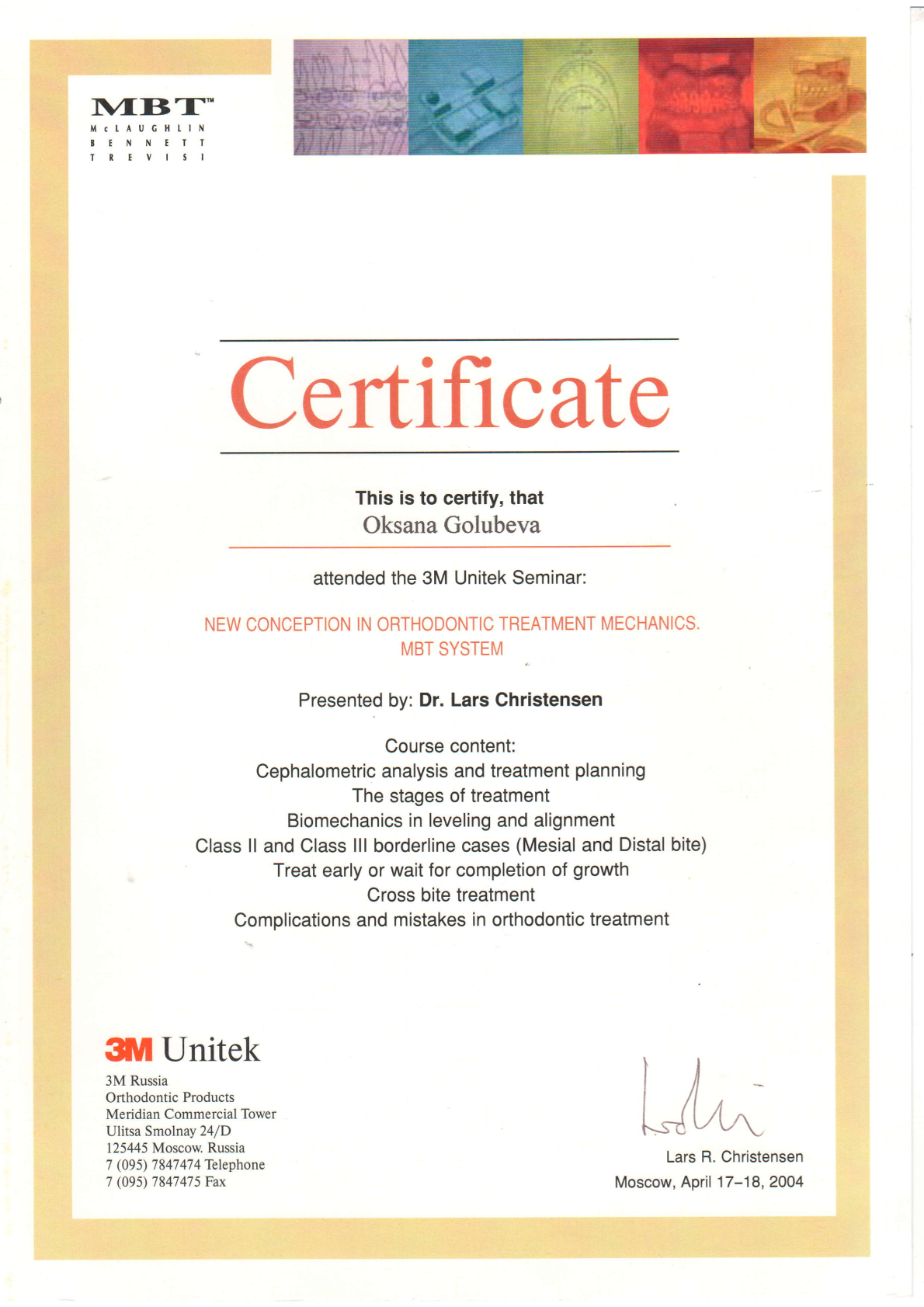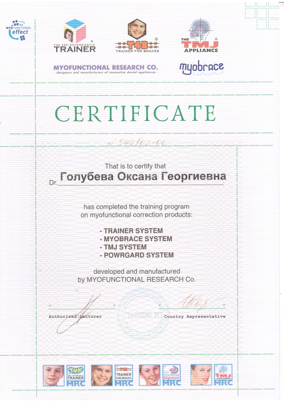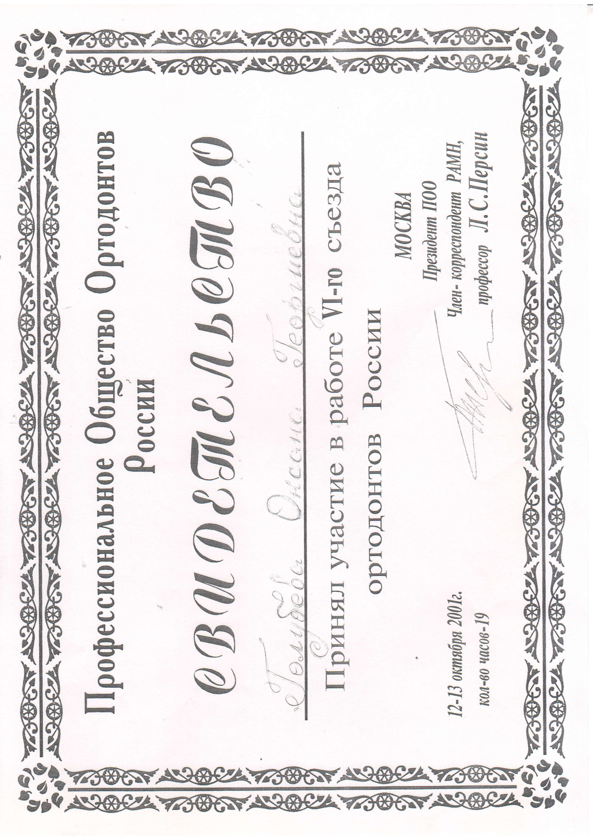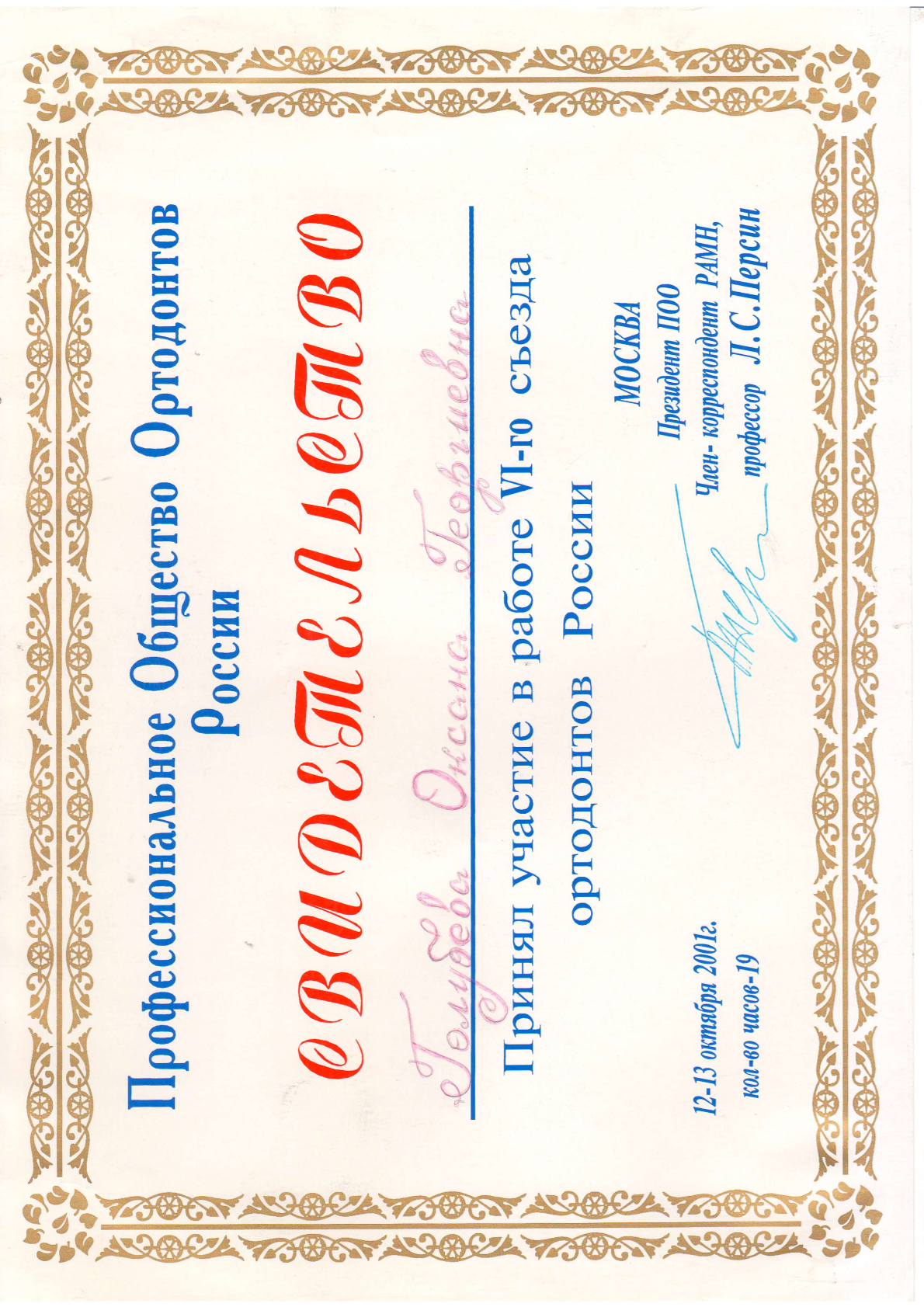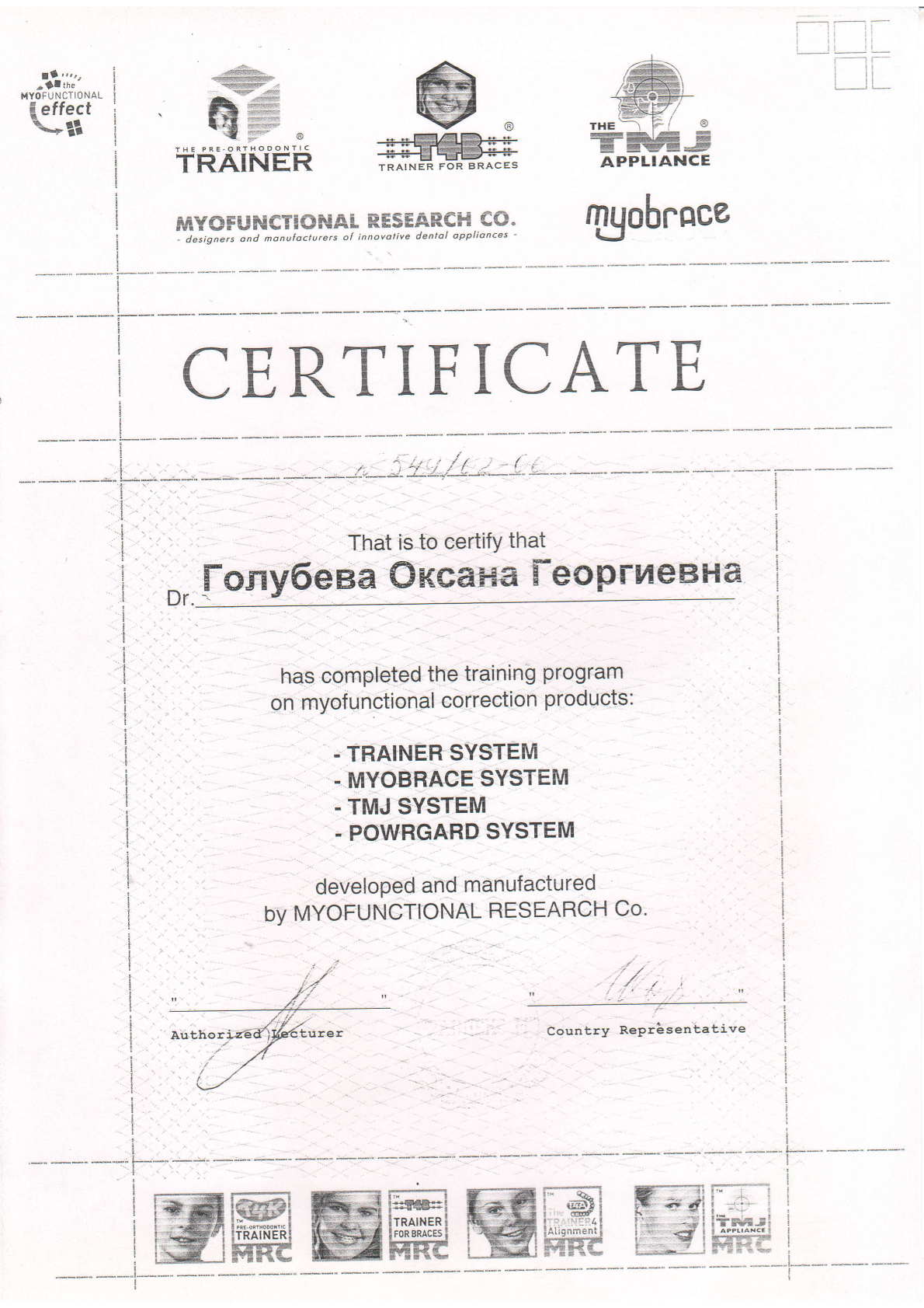 Высшее медицинское образование. Смоленский государственный медицинский институт, диплом №044812 24.06.1993 г., специальность «Стоматология» Интернатура: Смоленский государственный медицинский институт, специальность «Стоматология» 1.09.1993 — 28.08.1994 гг. Клиническая ординатура: 1995-1997 гг., специальность «Ортодонтия» Сертификат специалиста 1177181093149 от 30.11.2020г. «Ортодонтия». Удостоверение о повышении квалификации 771802730156 рег. номер 11/20-У9388 от 30.11.2020г. «Ортодонтия». Сведения о прохождении аккредитации специалиста: № 7725033695875 от 25.11.2025 года «Ортодонтия» • ВСЕРОССИЙСКАЯ КОНФЕРЕНЦИЯ "Стоматология в новых условиях хозяйствования", 29 сентября -4 октября 1997 года • 3M Unitek Seminar: NEW CONCEPTION IN ORTHODONTIC TREATMENT MECHANICS. MBT SYSTEM, 17-18 апреля 2004 года (Dr. Lars Christensen) • Участие в работе VII съезда ортодонтов России, 8-11 октября 2003 года • Участие в работе VI-го съезда ортодонтов России, 12-13 октября 2001 года • Семинар на тему: «Биомеханика и техника дозирования ортодонтической нагрузки», 10 сентября 2005 год года (Дмитриенко С. В.) • Micro Implant Anchorage Orthodontics The First International Conference "Microimplantation - future of Orthodontics" (Russian MIA). At support of company DENTOS Inc. - Worldwide Pioneers and Leaders in Microimplant Anchorage. Conducted at NORTA Co. Ltd, 28-29 октября 2009 года (Jae-Hyun Sung, Seong-Min Bae, Hee Moen Kyung • Training program on myofunctional correction products: TRAINER SYSTEM MYOBRACE SYSTEM TMJ SYSTEM POWRGARD SYSTEM developed and manufactured by MYOFUNCTIONAL RESEARCH Co. • Семинар на тему: «Физиологические и клинические аспекты лечения технологией ультраслабых сил», 14 октября 2006 года • Участие в работе VIII съезда ортодонтов России, 8-11 октября 2003 года • Курс: "Клиника боли лица и челюстей", 5 июня 2016 года (Granot Igal) • Участие в работе XVI Съезда ортодонтов России, 9-11 октября 2014 года • Учебный курс Жанны Ленденгольц "ТЕЛЕРЕНТГЕНОГРАФИЯ", 22 апреля 2017 года • Участие в VIII Международной конференции по ортодонтии "Современные технологии в диагностике и лечении зубочелостнолицевых аномалий", 11 - 12 апреля 2008 года • Тheoretical course ORTHODONTICS CONGRESS, 15-16 февраля 2020 года (WON MOON, MARCO ROSA, SEONG-HUN KIM)