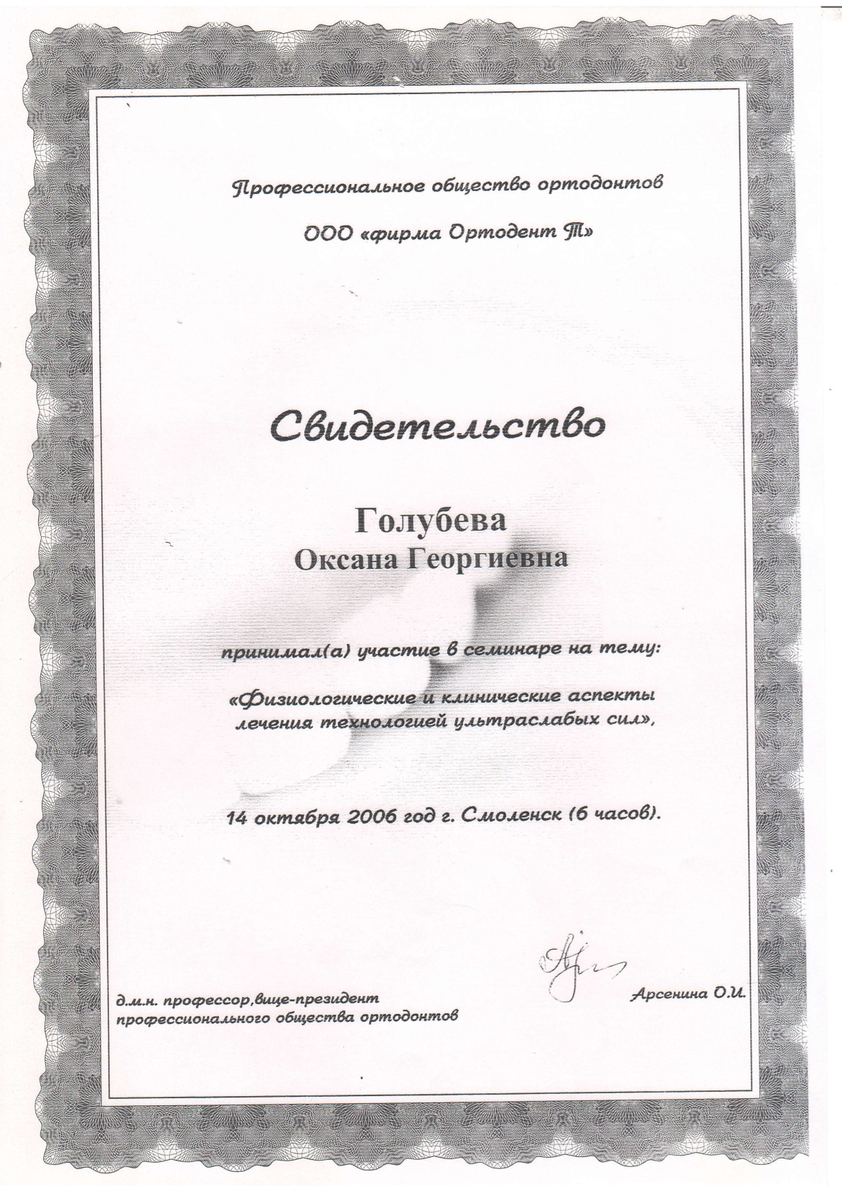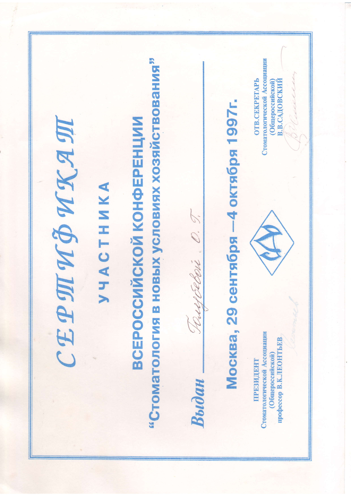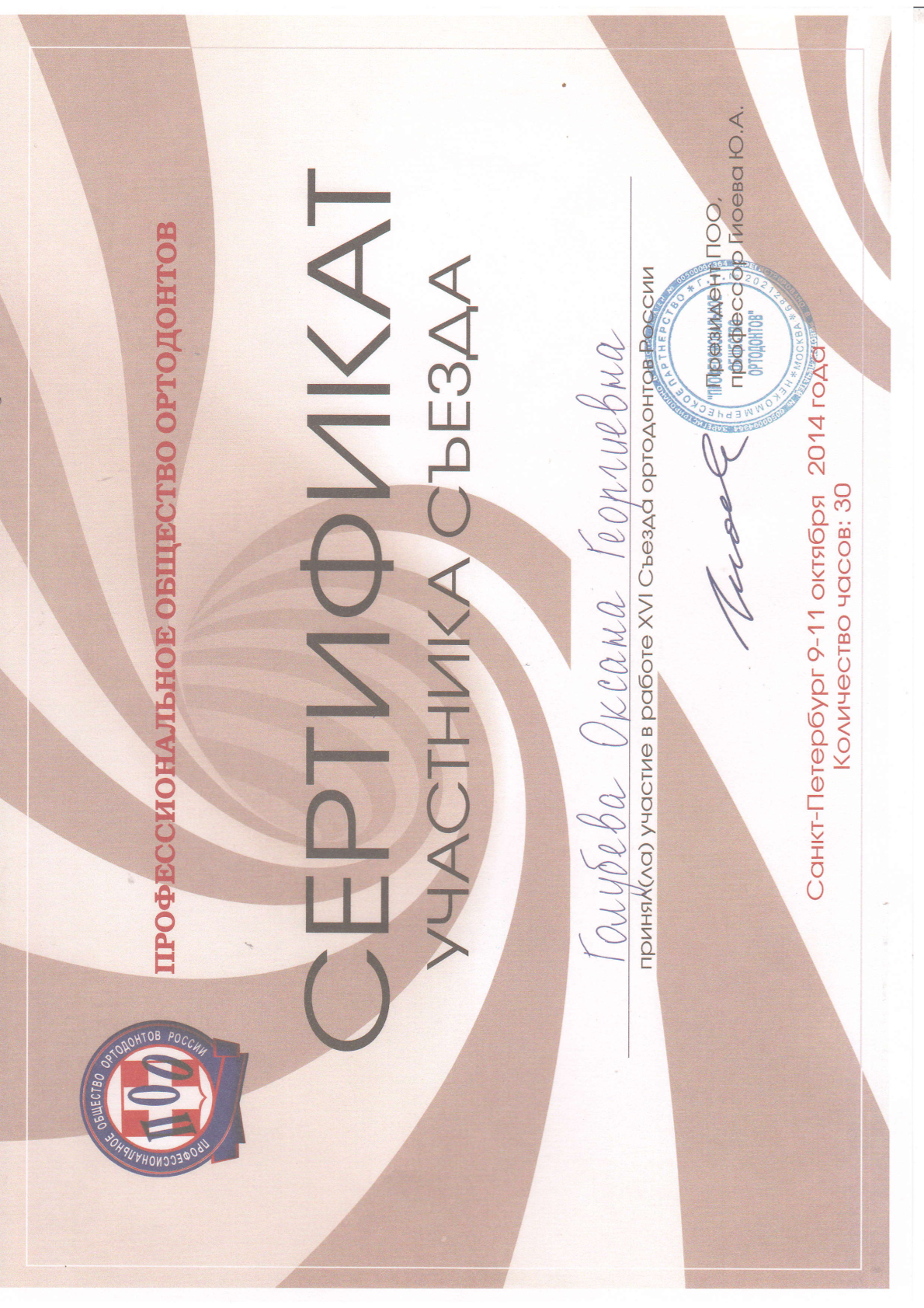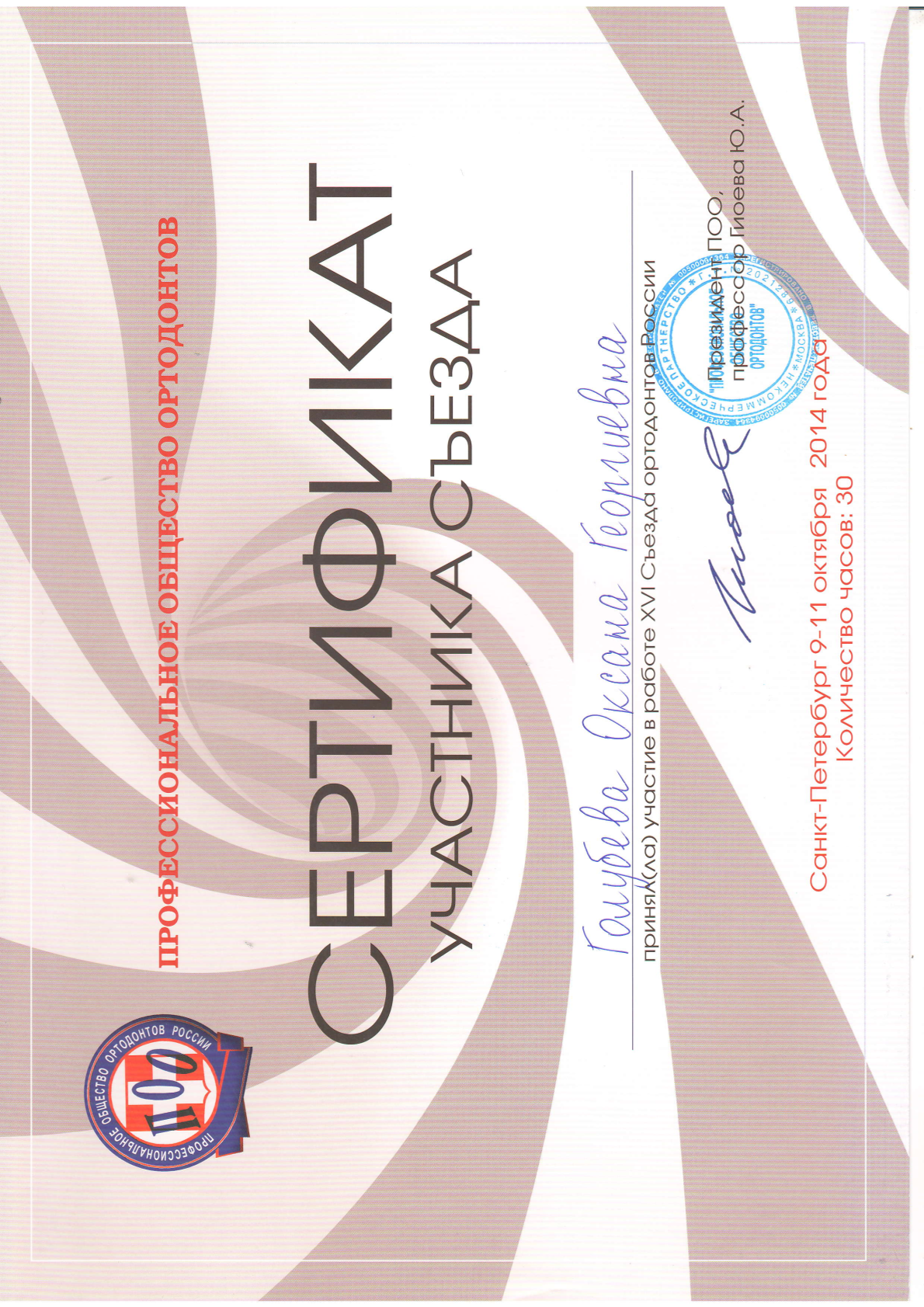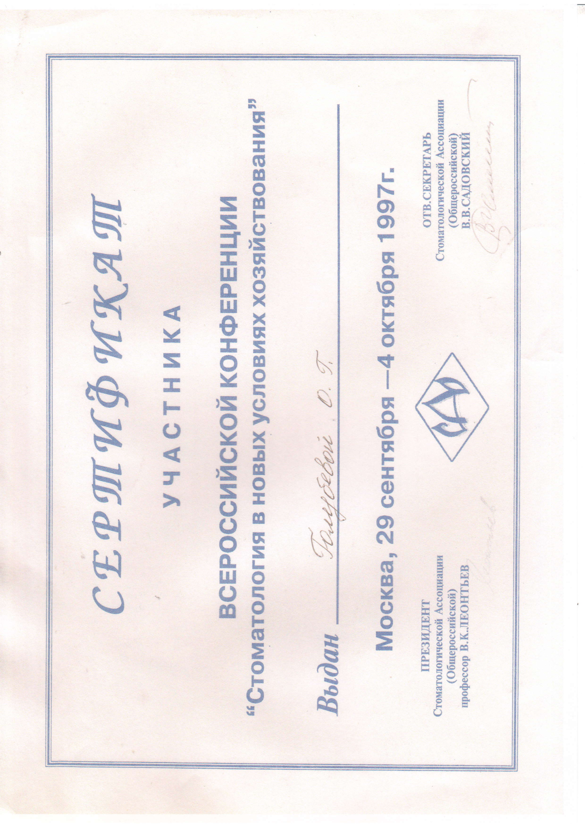 Высшее медицинское образование. Смоленский государственный медицинский институт, диплом №044812 24.06.1993 г., специальность «Стоматология» Интернатура: Смоленский государственный медицинский институт, специальность «Стоматология» 1.09.1993 — 28.08.1994 гг. Клиническая ординатура: 1995-1997 гг., специальность «Ортодонтия» Сертификат специалиста 1177181093149 от 30.11.2020г. «Ортодонтия». Удостоверение о повышении квалификации 771802730156 рег. номер 11/20-У9388 от 30.11.2020г. «Ортодонтия». Сведения о прохождении аккредитации специалиста: № 7725033695875 от 25.11.2025 года «Ортодонтия» • ВСЕРОССИЙСКАЯ КОНФЕРЕНЦИЯ "Стоматология в новых условиях хозяйствования", 29 сентября -4 октября 1997 года • 3M Unitek Seminar: NEW CONCEPTION IN ORTHODONTIC TREATMENT MECHANICS. MBT SYSTEM, 17-18 апреля 2004 года (Dr. Lars Christensen) • Участие в работе VII съезда ортодонтов России, 8-11 октября 2003 года • Участие в работе VI-го съезда ортодонтов России, 12-13 октября 2001 года • Семинар на тему: «Биомеханика и техника дозирования ортодонтической нагрузки», 10 сентября 2005 год года (Дмитриенко С. В.) • Micro Implant Anchorage Orthodontics The First International Conference "Microimplantation - future of Orthodontics" (Russian MIA). At support of company DENTOS Inc. - Worldwide Pioneers and Leaders in Microimplant Anchorage. Conducted at NORTA Co. Ltd, 28-29 октября 2009 года (Jae-Hyun Sung, Seong-Min Bae, Hee Moen Kyung • Training program on myofunctional correction products: TRAINER SYSTEM MYOBRACE SYSTEM TMJ SYSTEM POWRGARD SYSTEM developed and manufactured by MYOFUNCTIONAL RESEARCH Co. • Семинар на тему: «Физиологические и клинические аспекты лечения технологией ультраслабых сил», 14 октября 2006 года • Участие в работе VIII съезда ортодонтов России, 8-11 октября 2003 года • Курс: "Клиника боли лица и челюстей", 5 июня 2016 года (Granot Igal) • Участие в работе XVI Съезда ортодонтов России, 9-11 октября 2014 года • Учебный курс Жанны Ленденгольц "ТЕЛЕРЕНТГЕНОГРАФИЯ", 22 апреля 2017 года • Участие в VIII Международной конференции по ортодонтии "Современные технологии в диагностике и лечении зубочелостнолицевых аномалий", 11 - 12 апреля 2008 года • Тheoretical course ORTHODONTICS CONGRESS, 15-16 февраля 2020 года (WON MOON, MARCO ROSA, SEONG-HUN KIM)