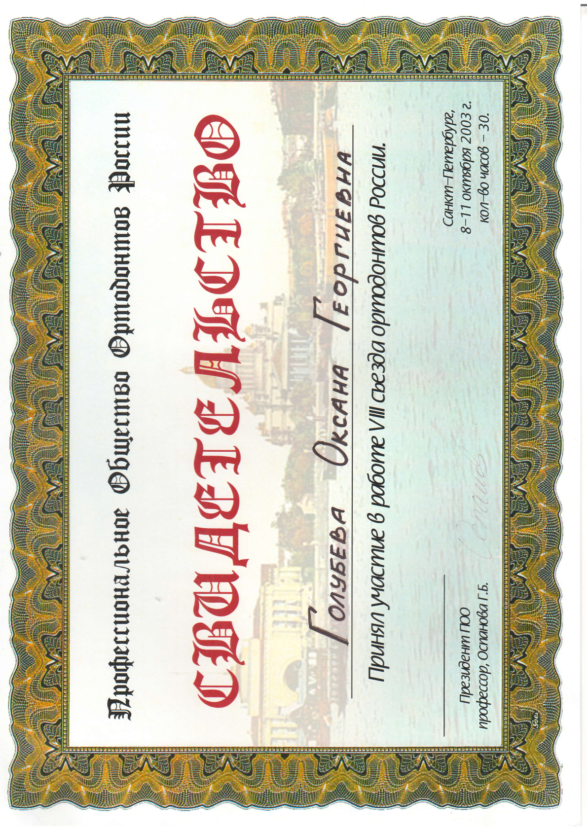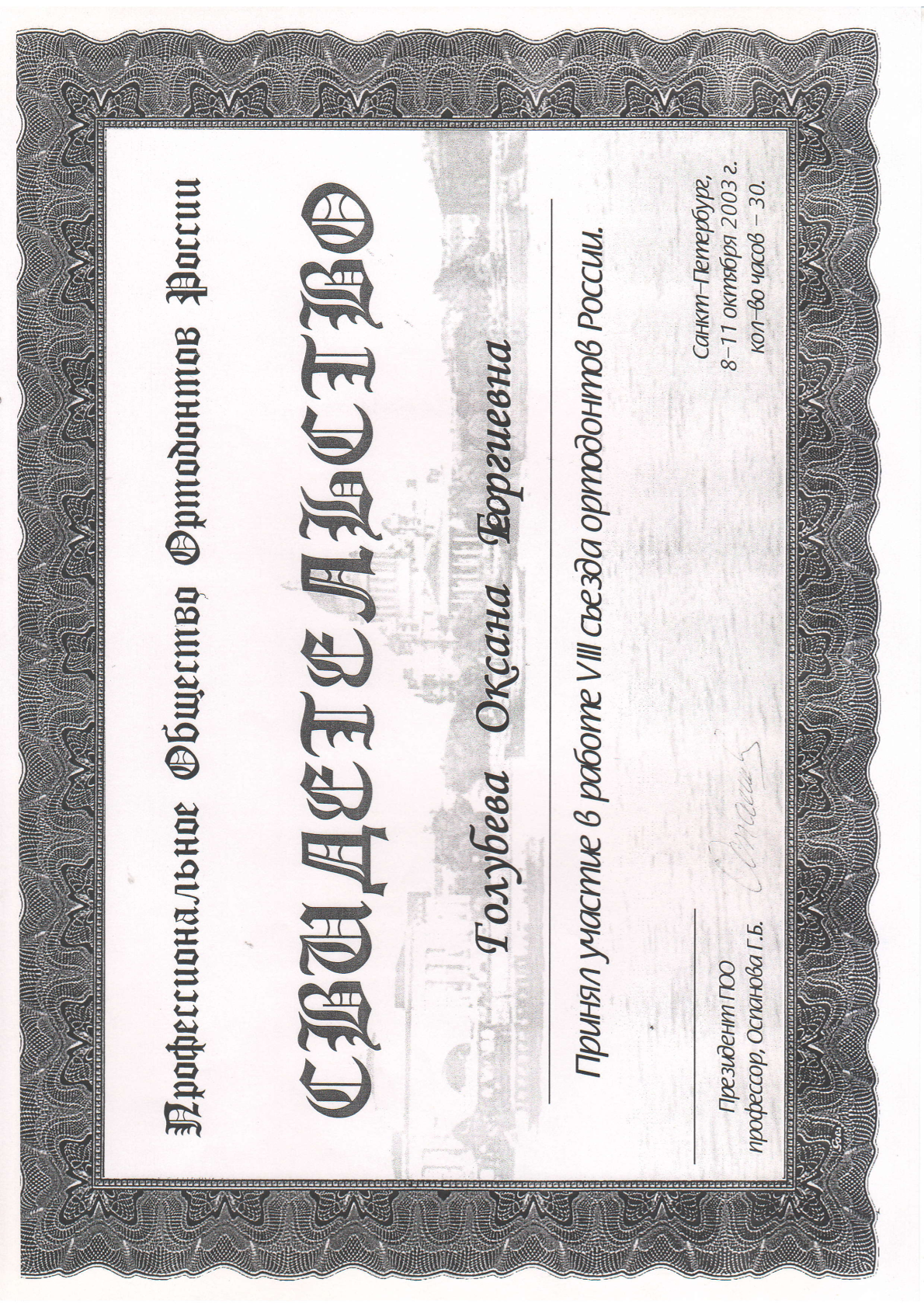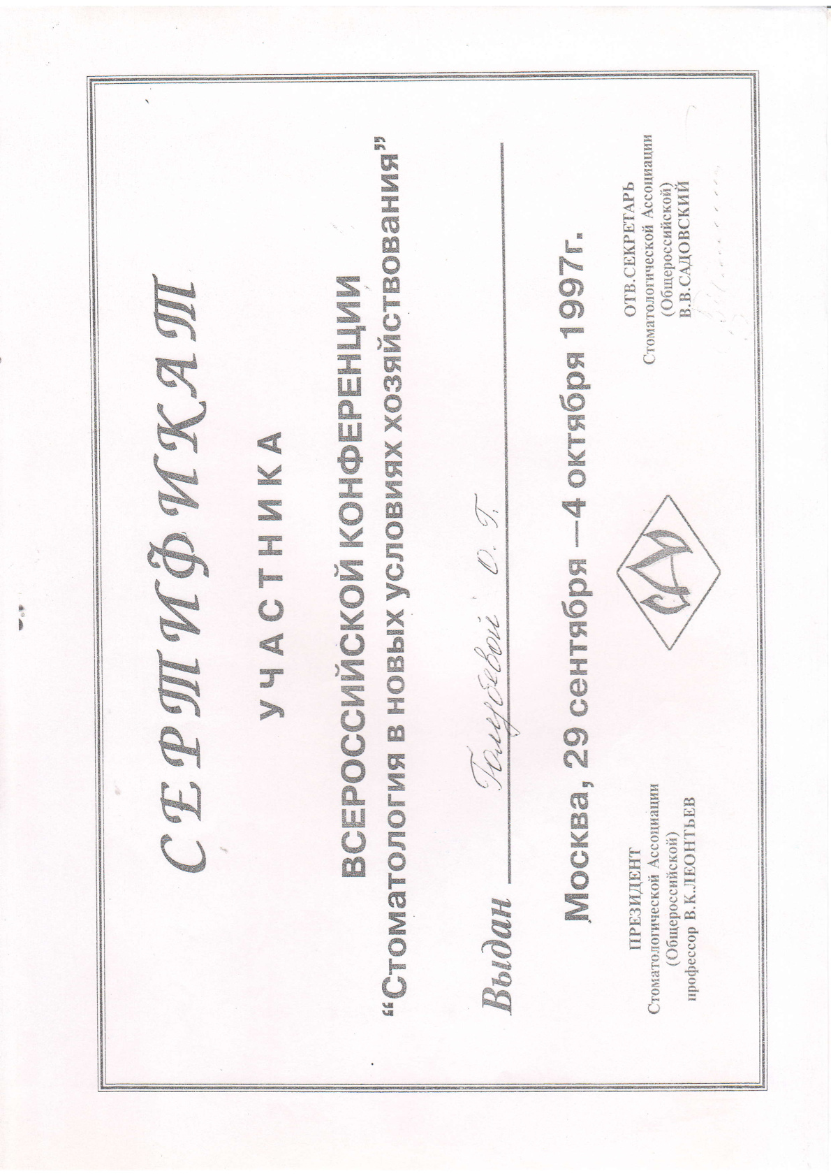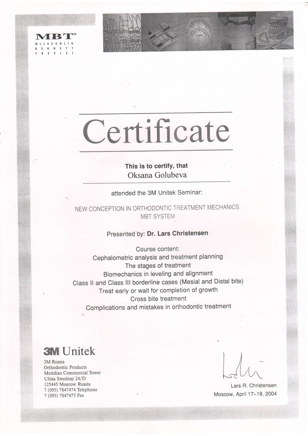 Высшее медицинское образование. Смоленский государственный медицинский институт, диплом №044812 24.06.1993 г., специальность «Стоматология» Интернатура: Смоленский государственный медицинский институт, специальность «Стоматология» 1.09.1993 — 28.08.1994 гг. Клиническая ординатура: 1995-1997 гг., специальность «Ортодонтия» Сертификат специалиста 1177181093149 от 30.11.2020г. «Ортодонтия». Удостоверение о повышении квалификации 771802730156 рег. номер 11/20-У9388 от 30.11.2020г. «Ортодонтия». Сведения о прохождении аккредитации специалиста: № 7725033695875 от 25.11.2025 года «Ортодонтия» • ВСЕРОССИЙСКАЯ КОНФЕРЕНЦИЯ "Стоматология в новых условиях хозяйствования", 29 сентября -4 октября 1997 года • 3M Unitek Seminar: NEW CONCEPTION IN ORTHODONTIC TREATMENT MECHANICS. MBT SYSTEM, 17-18 апреля 2004 года (Dr. Lars Christensen) • Участие в работе VII съезда ортодонтов России, 8-11 октября 2003 года • Участие в работе VI-го съезда ортодонтов России, 12-13 октября 2001 года • Семинар на тему: «Биомеханика и техника дозирования ортодонтической нагрузки», 10 сентября 2005 год года (Дмитриенко С. В.) • Micro Implant Anchorage Orthodontics The First International Conference "Microimplantation - future of Orthodontics" (Russian MIA). At support of company DENTOS Inc. - Worldwide Pioneers and Leaders in Microimplant Anchorage. Conducted at NORTA Co. Ltd, 28-29 октября 2009 года (Jae-Hyun Sung, Seong-Min Bae, Hee Moen Kyung • Training program on myofunctional correction products: TRAINER SYSTEM MYOBRACE SYSTEM TMJ SYSTEM POWRGARD SYSTEM developed and manufactured by MYOFUNCTIONAL RESEARCH Co. • Семинар на тему: «Физиологические и клинические аспекты лечения технологией ультраслабых сил», 14 октября 2006 года • Участие в работе VIII съезда ортодонтов России, 8-11 октября 2003 года • Курс: "Клиника боли лица и челюстей", 5 июня 2016 года (Granot Igal) • Участие в работе XVI Съезда ортодонтов России, 9-11 октября 2014 года • Учебный курс Жанны Ленденгольц "ТЕЛЕРЕНТГЕНОГРАФИЯ", 22 апреля 2017 года • Участие в VIII Международной конференции по ортодонтии "Современные технологии в диагностике и лечении зубочелостнолицевых аномалий", 11 - 12 апреля 2008 года • Тheoretical course ORTHODONTICS CONGRESS, 15-16 февраля 2020 года (WON MOON, MARCO ROSA, SEONG-HUN KIM)
