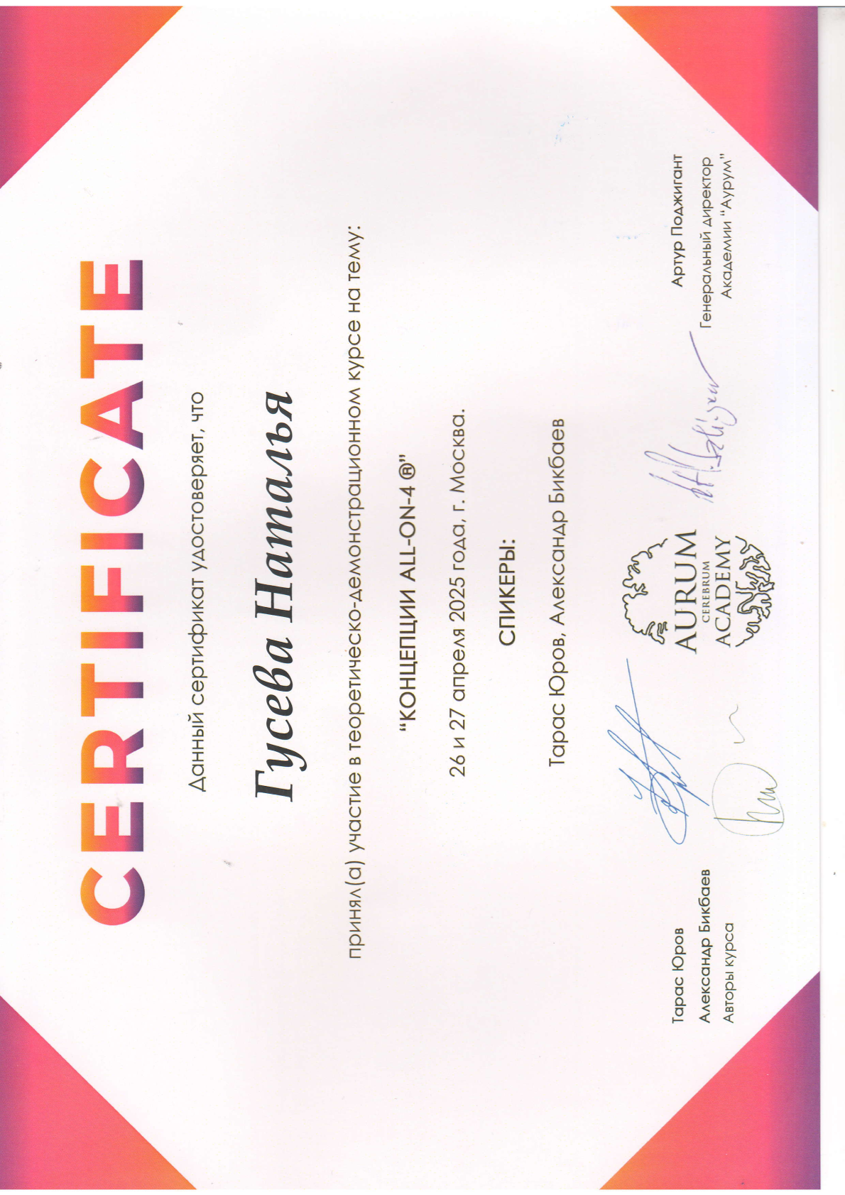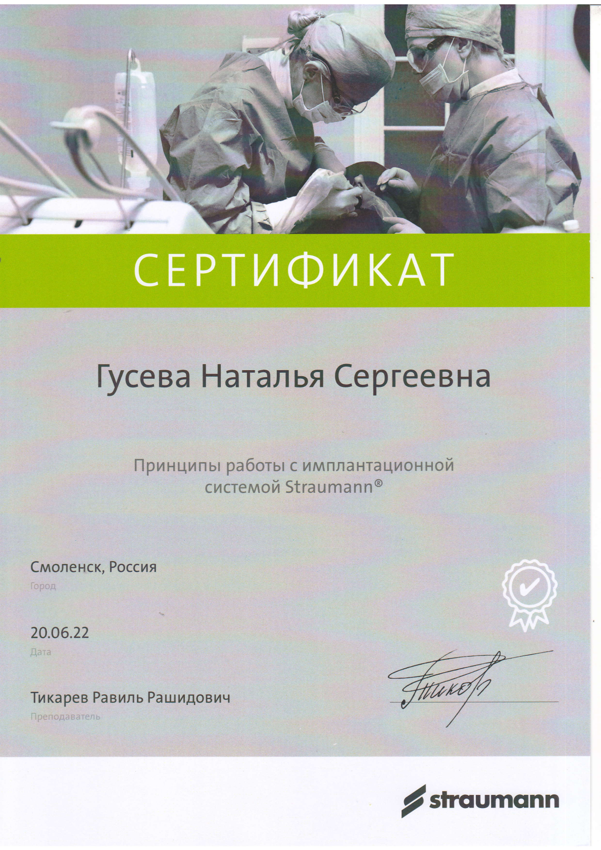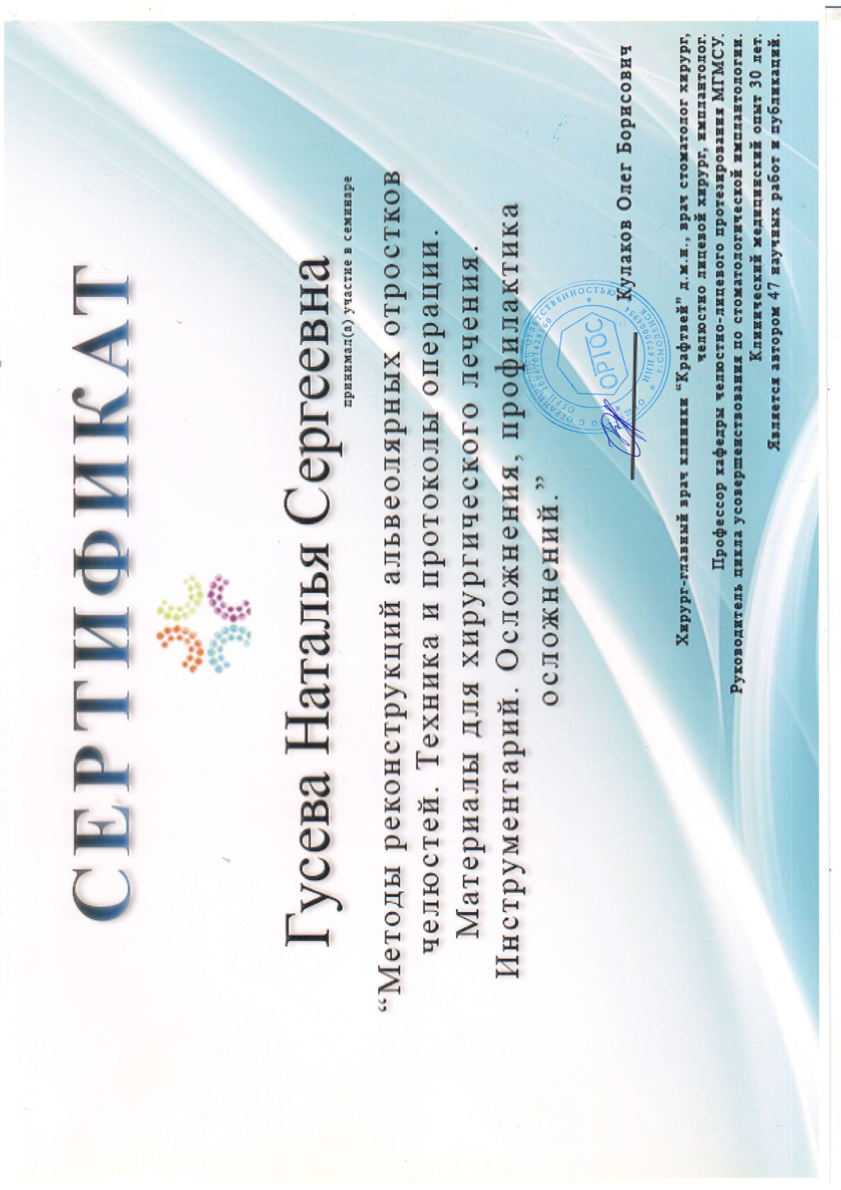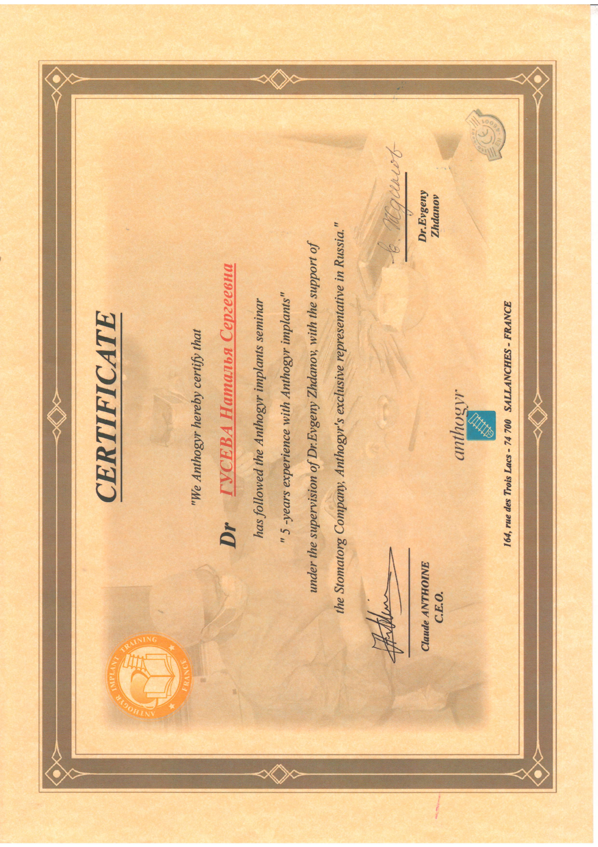 Высшее медицинское образование. Смоленская государственная медицинская академия, диплом АВС № 0970405 выдан 24.06.1998г., специальность – стоматология. Удостоверение о повышении квалификации №670400016783 рег.номер 620 выдано 11.03.2020 г. «Стоматология хирургическая». Сведения о прохождении аккредитации специалиста: № 7725 032628503 от 25.02.2025 года «Стоматология хирургическая» • Принципы работы с имплантационной системой Straumann, 20 июня 2022 года, (Тикарев Р.Р.) • Учебный курс "ХИРУРГИЧЕСКАЯ ЭНДОДОНТИЯ", 4-5 июня 2015 года (М. Приямпольская) • Семинар "Методы реконструкций альвеолярных отростков челюстей. Техника и протоколы операции. Материалы для хирургического лечения. Инструментарий. Осложнения, профилактика осложнений." (Кулаков О.Б.) • Вводный курс по имплантационной системе Medentika: хирургия, 5 февраля 2024 года (Р. Тикарев) • Мастер класс «Основы междисциплинарного планирования при комплексной стоматологической реабилитации», 7-11 октября 2011 года (А. Давидян) • VII КОНГРЕСС СТОМАТОЛОГОВ СНГ, 7-11 октября 2011 года • Учебный курс «ХИРУРГИЧЕСКИЕ МЕТОДЫ ЛЕЧЕНИЯ ВОСПАЛИТЕЛЬНЫХ ЗАБОЛЕВАНИЙ ПАРОДОНТА» КЛАССИЧЕСКАЯ ПАРОДОНТАЛЬНАЯ ХИРУРГИЯ. НАПРАВЛЕННАЯ ТКАННАЯ РЕГЕНЕРАЦИЯ. ОПЕРАЦИИ НА ПРЕДДВЕРИИ ПОЛОСТИ РТА. РЕКОНСТРУКЦИЯ ПАРОДОНТАЛЬНЫХ ДЕФЕКТОВ. (ПРОДВИНУТЫЙ УРОВЕНЬ), 12 октября 2014 года (Нейзберг Д.М.) • Практический курс "Менеджмент твердых тканей", 22 мая 2014 года (Dr. Thomas Hanser) • Курс лекций, проведенных компанией ООО "Дентекс" г. Москва, по следующим темам: Основные требования при проведении профилактики перекрестной инфекции в стоматологическом учреждении. Использование ультразвукового аппарата Vector при лечении заболеваний пародонта. Чистый и сухой воздух - залог здоровья и качества печения. Современные технологии в лечении воспалительно-диструктивных процессов ткани пародонта, 16 – 17 октября 2004 года (Модина Т.Н.) • Теоретическо-демонстрационный курс на тему: "КОНЦЕПЦИИ ALL-ON-4", 26 и 27 апреля 2025 года (Т. Юров, А. Бикбаев) • Seminar «5-years’ experience with Anthogyr implants" under the supervision of Dr. Evgeny Zhdanov, with the support of the Stomatorg Company, Anthogyr's exclusive representative in Russia." (Е. Жданов)