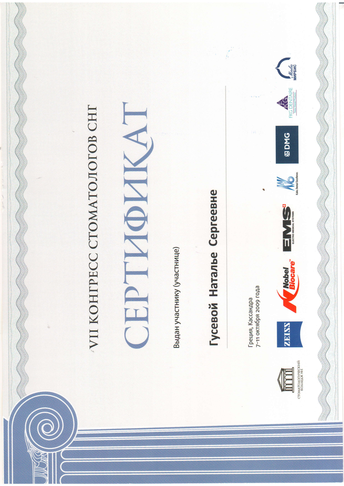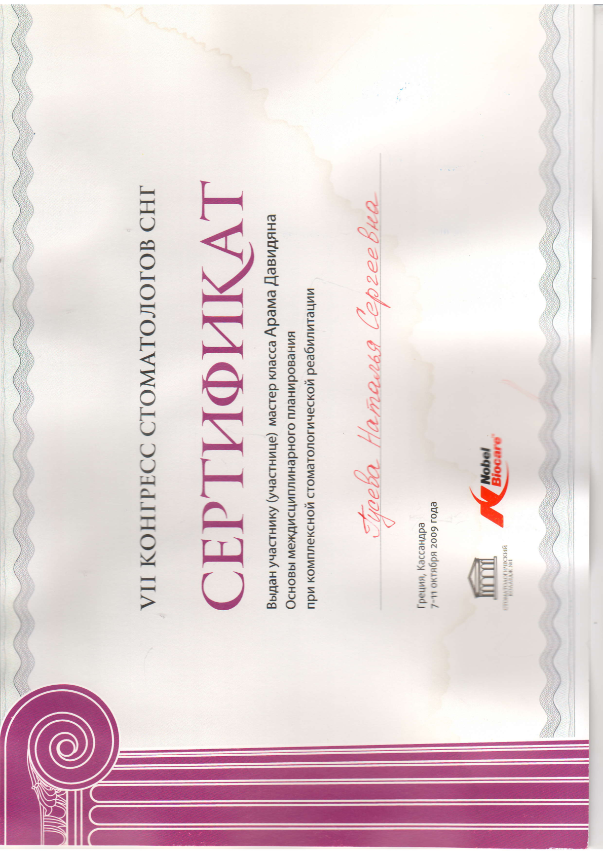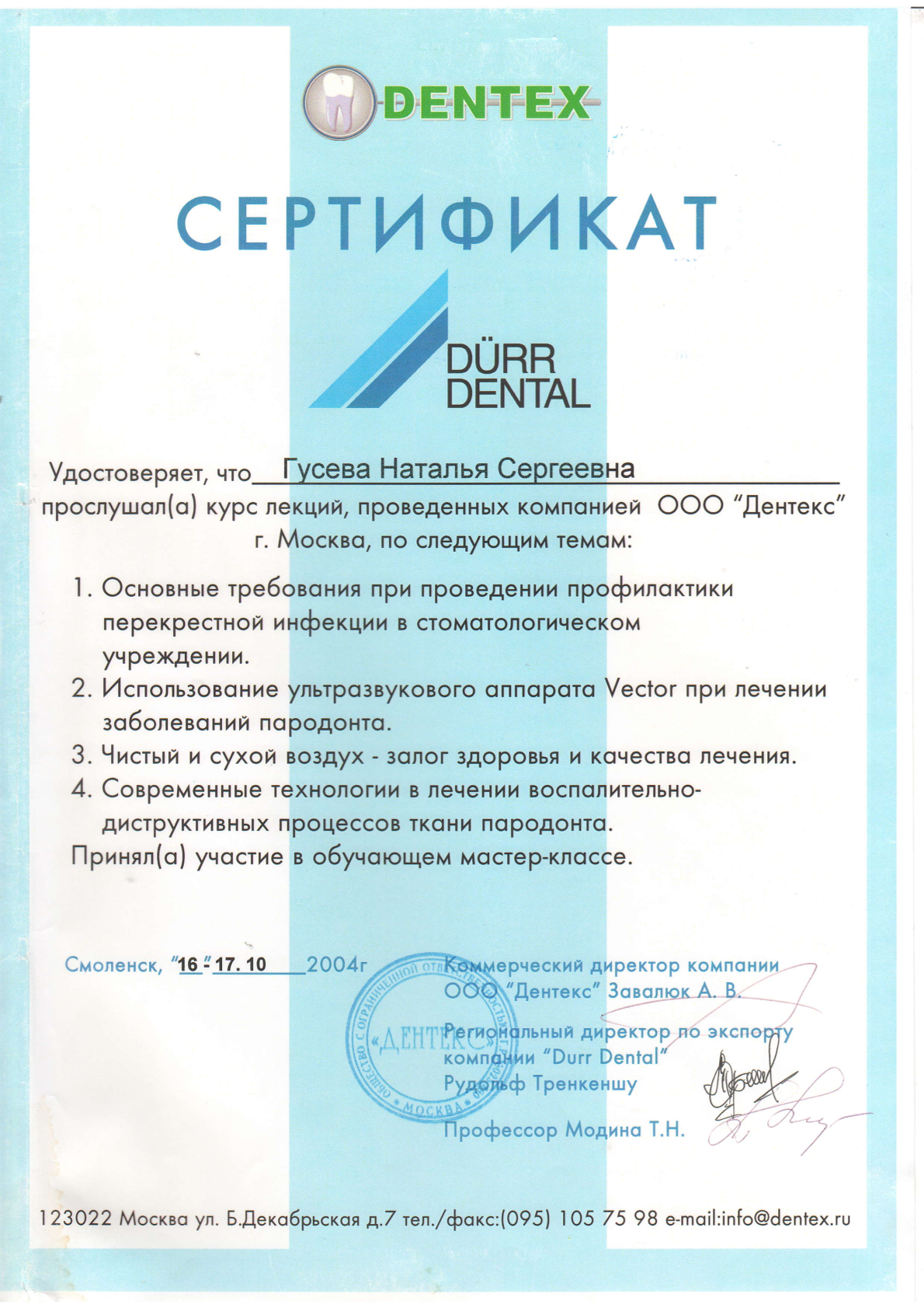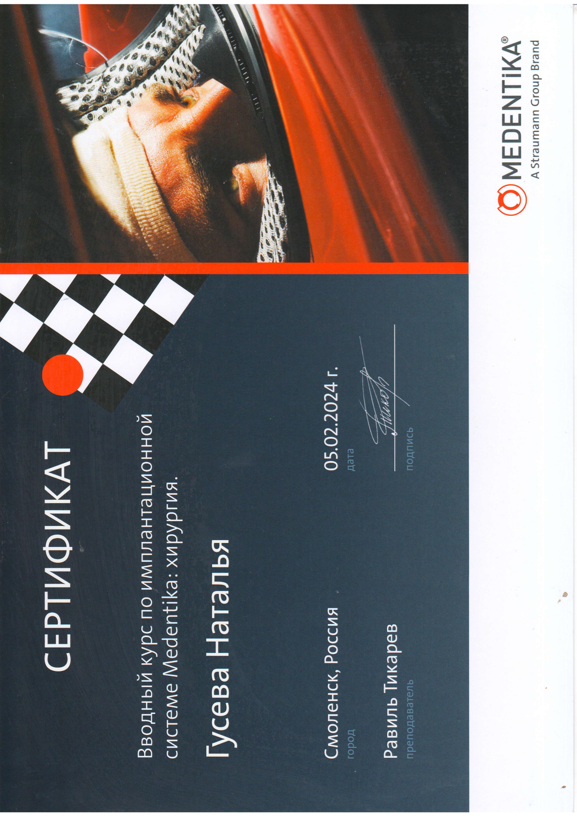 Высшее медицинское образование. Смоленская государственная медицинская академия, диплом АВС № 0970405 выдан 24.06.1998г., специальность – стоматология. Удостоверение о повышении квалификации №670400016783 рег.номер 620 выдано 11.03.2020 г. «Стоматология хирургическая». Сведения о прохождении аккредитации специалиста: № 7725 032628503 от 25.02.2025 года «Стоматология хирургическая» • Принципы работы с имплантационной системой Straumann, 20 июня 2022 года, (Тикарев Р.Р.) • Учебный курс "ХИРУРГИЧЕСКАЯ ЭНДОДОНТИЯ", 4-5 июня 2015 года (М. Приямпольская) • Семинар "Методы реконструкций альвеолярных отростков челюстей. Техника и протоколы операции. Материалы для хирургического лечения. Инструментарий. Осложнения, профилактика осложнений." (Кулаков О.Б.) • Вводный курс по имплантационной системе Medentika: хирургия, 5 февраля 2024 года (Р. Тикарев) • Мастер класс «Основы междисциплинарного планирования при комплексной стоматологической реабилитации», 7-11 октября 2011 года (А. Давидян) • VII КОНГРЕСС СТОМАТОЛОГОВ СНГ, 7-11 октября 2011 года • Учебный курс «ХИРУРГИЧЕСКИЕ МЕТОДЫ ЛЕЧЕНИЯ ВОСПАЛИТЕЛЬНЫХ ЗАБОЛЕВАНИЙ ПАРОДОНТА» КЛАССИЧЕСКАЯ ПАРОДОНТАЛЬНАЯ ХИРУРГИЯ. НАПРАВЛЕННАЯ ТКАННАЯ РЕГЕНЕРАЦИЯ. ОПЕРАЦИИ НА ПРЕДДВЕРИИ ПОЛОСТИ РТА. РЕКОНСТРУКЦИЯ ПАРОДОНТАЛЬНЫХ ДЕФЕКТОВ. (ПРОДВИНУТЫЙ УРОВЕНЬ), 12 октября 2014 года (Нейзберг Д.М.) • Практический курс "Менеджмент твердых тканей", 22 мая 2014 года (Dr. Thomas Hanser) • Курс лекций, проведенных компанией ООО "Дентекс" г. Москва, по следующим темам: Основные требования при проведении профилактики перекрестной инфекции в стоматологическом учреждении. Использование ультразвукового аппарата Vector при лечении заболеваний пародонта. Чистый и сухой воздух - залог здоровья и качества печения. Современные технологии в лечении воспалительно-диструктивных процессов ткани пародонта, 16 – 17 октября 2004 года (Модина Т.Н.) • Теоретическо-демонстрационный курс на тему: "КОНЦЕПЦИИ ALL-ON-4", 26 и 27 апреля 2025 года (Т. Юров, А. Бикбаев) • Seminar «5-years’ experience with Anthogyr implants" under the supervision of Dr. Evgeny Zhdanov, with the support of the Stomatorg Company, Anthogyr's exclusive representative in Russia." (Е. Жданов)