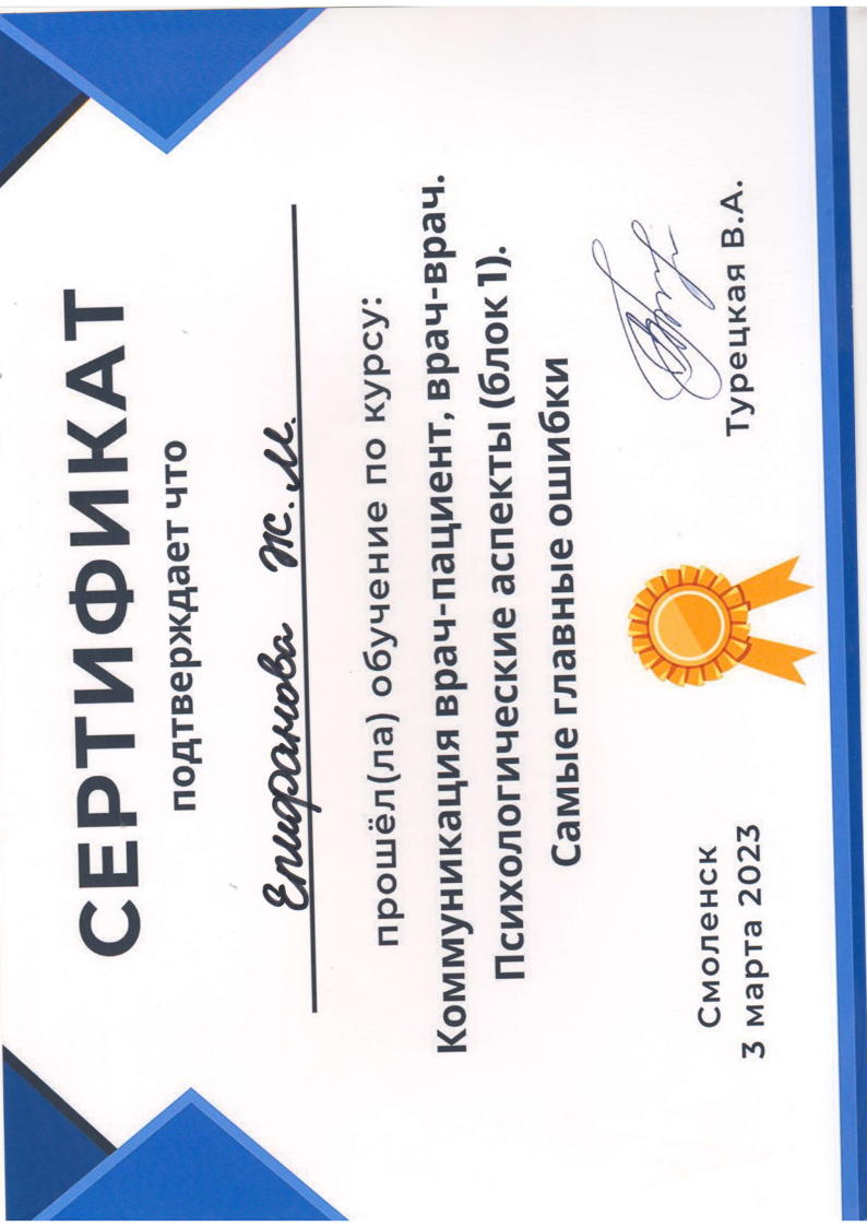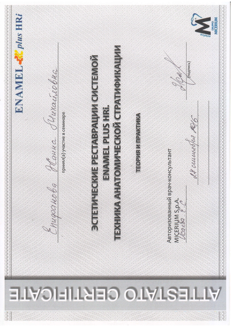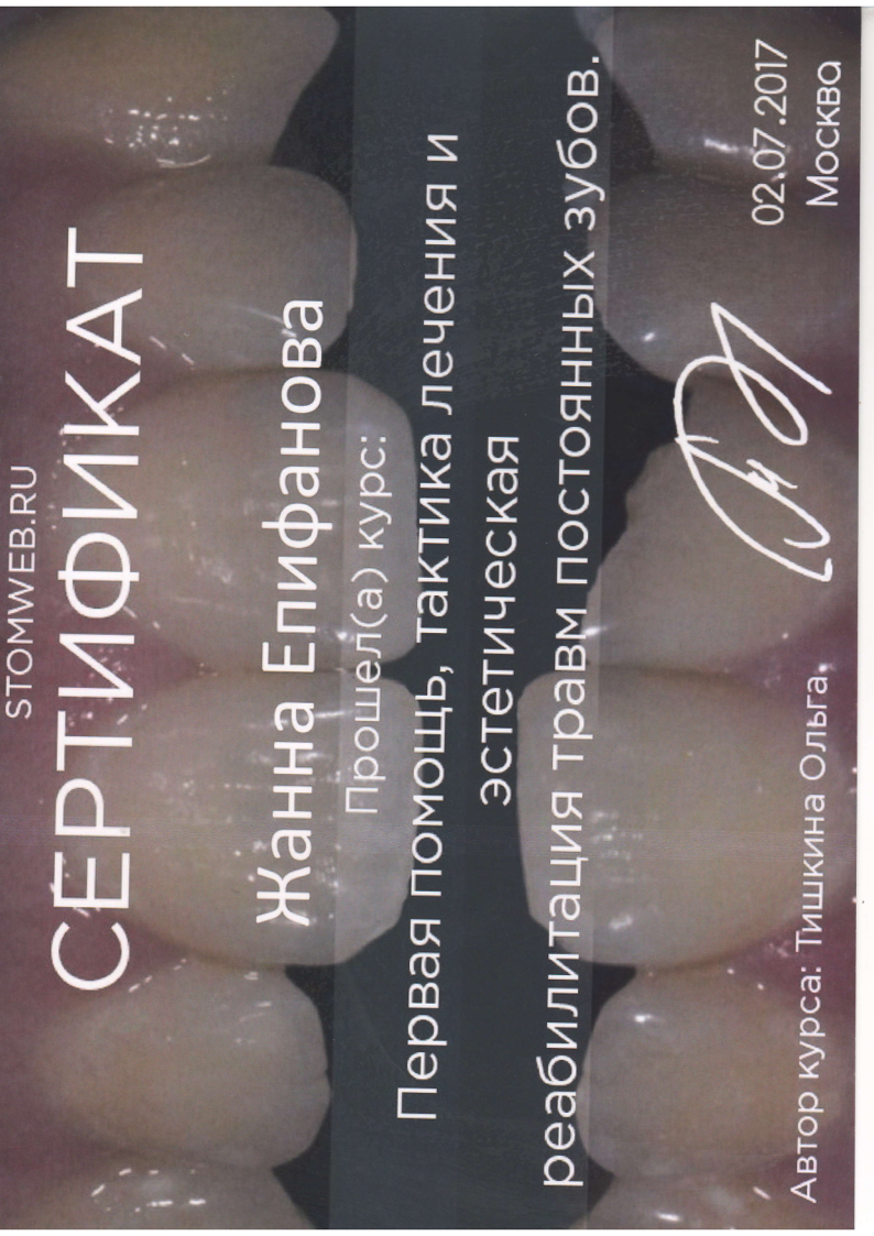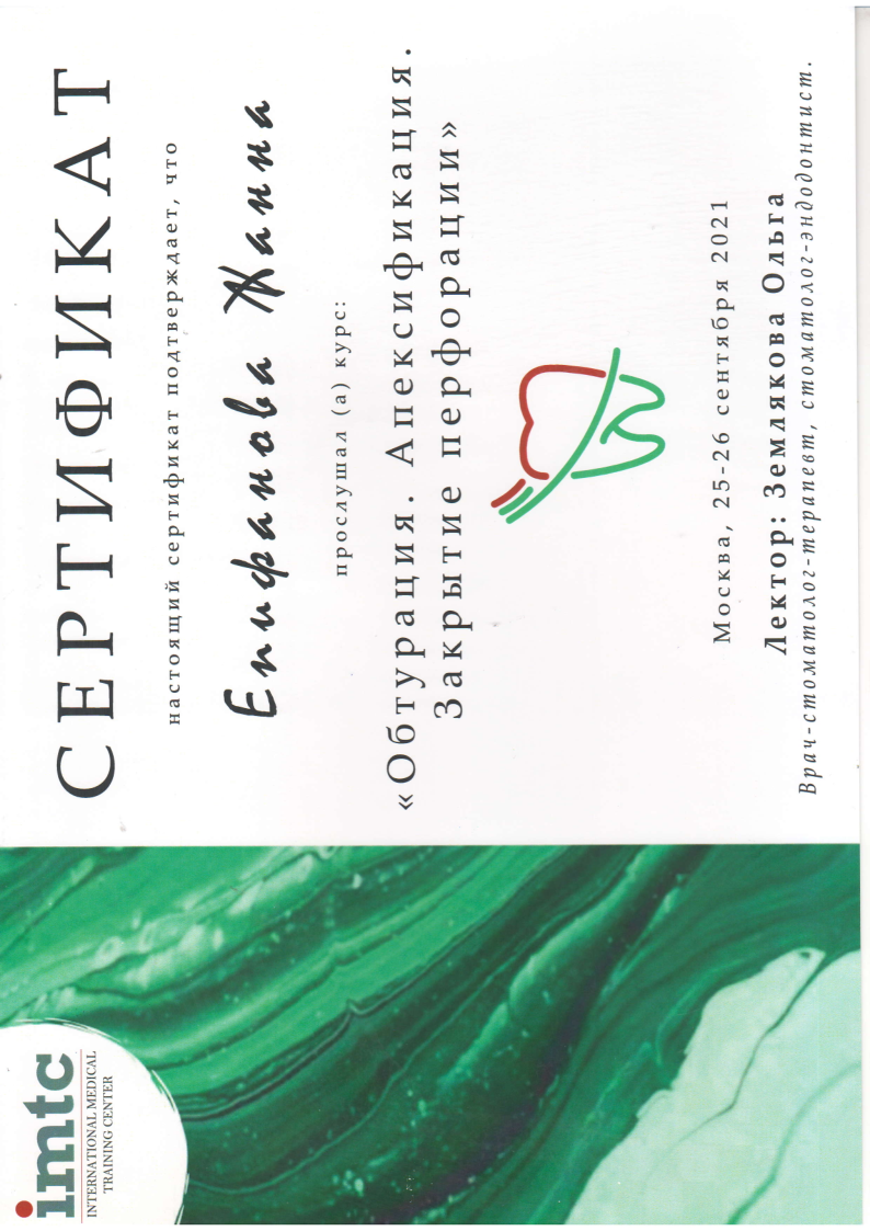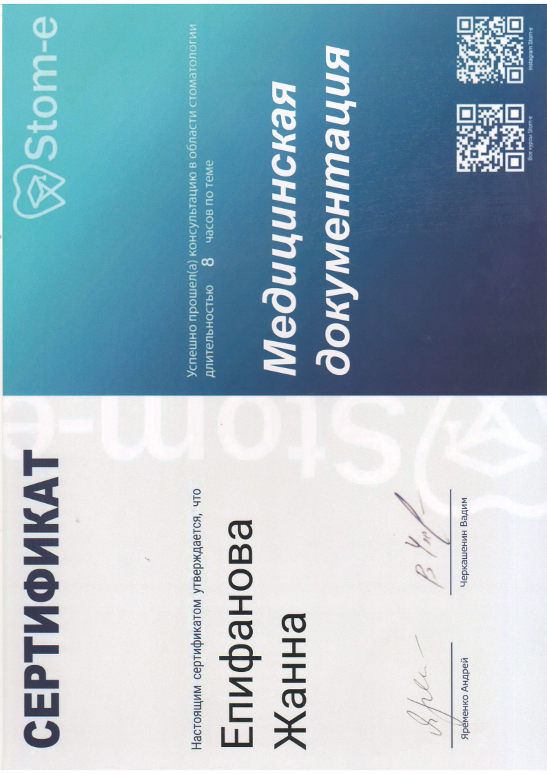 Высшее медицинское образование. Удостоверение о повышении квалификации №670400018477 рег.номер 2301 выдано 14.04.2020 г. «Стоматология общей практики» Сведения о прохождении аккредитации специалиста: № 7725 032896836 от 27.05.2025 года «Стоматолог общей практики» 1. Практический семинар «Клинико-топографическая анатомия в адгезивных реставрациях зубов», 2016 год, А.В. Ветчинкин 2. Грамота «За многолетний добросовестный труд, высокопрофессиональное исполнение служебных обязанностей и в связи с днём медицинского работника», 18 июня, 2012 года 3. Учебный курс «Реставрация временных зубов. Острая боль. На детском стоматологическом приеме», 19 сентября 2015 года, Небольсина Е.В. 4. Мастер класс «Малоинвазивная эстетическая реабилитация фронтальных зубов», 30 октября 2016 года, Василиадис Р. 5. Полный курс «Косметология в практике врача стоматолога», 14-15 ноября 2015 года 6. Диплом за 2-е место в Чемпионате стоматологического мастерства в номинации «Художественная реставрация зубов», 2012 год 7. Семинар «Эстетические реставрации системой ENAMEL PLUS HRi. Техника анатомической стратификации», 27 сентября 2016 года, Исаева Е.С. 8. Учебный курс Марины Приямпольской «Хирургическая эндодонтия», 4-5 июня 2015 года, Приямпольская М.Б. 9. Авторский курс Максима Белограда «Эндодонтия по правилам», 6-7 сентября 2014 года, М. Белоград 10. Курс на тему «Повторное эндодонтическое лечение. Консервативные и хирургические методы», 14-15 декабря 2024 года, Вьючнов И. 11. Курс «Первая помощь, тактика лечения и эстетическая реабилитация травм постоянных зубов», 2 июля 2017 года, Тишкина О. 12. Курс на тему «Реставрация жевательных зубов», В. Щербаков 13. Курс «Эндодонтия», 22 августа – 14 ноября 2017 года, И. Ноенко 14. Обучение по курсу «Интенсивный обучающий практический курс по моделированию и реставрации дистальной группы зубов», 9 декабря 2017 года, Бурдина Г.А. 15. Курс «Обтурация. Апексификация. Закрытие перфорации», 25-26 сентября 2021 года, Землякова О. 16. Обучение на тему «Реставрация фронтальных зубов», 14 ноября 2019 года, Мурашкин А. 17. Консультация в области стоматологии «Медицинская документация», Яременко А., Черкашенин В. 18. Обучение по курсу «Коммуникация врач-пациент, врач-врач. Психологические аспекты (блок 1). Самые главные ошибки», 3 марта 2023 года, Турецкая В.А. 19. Курс на тему «Курс по реставрациям фронтальной группы», 3-4 декабря 2022 года, Погосян А.