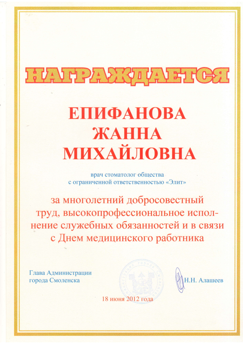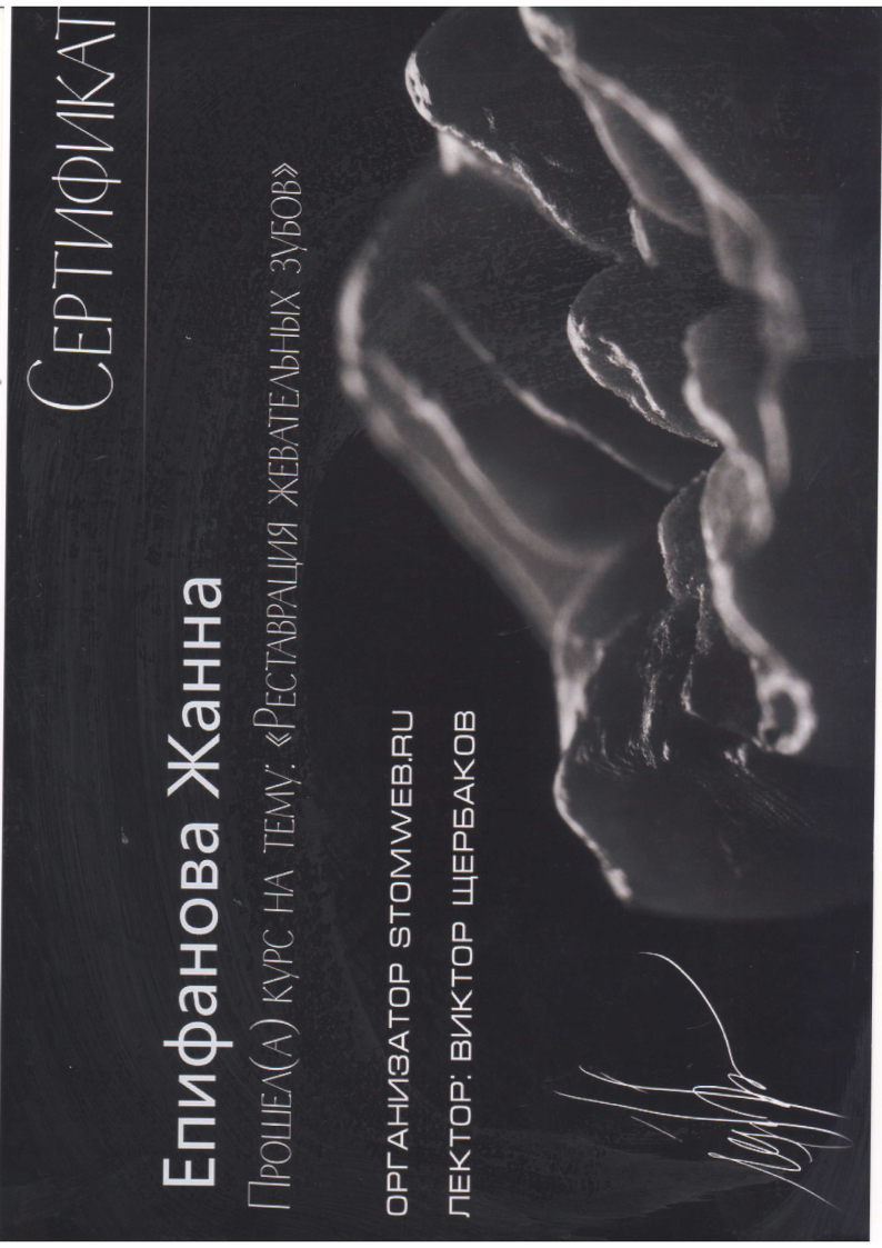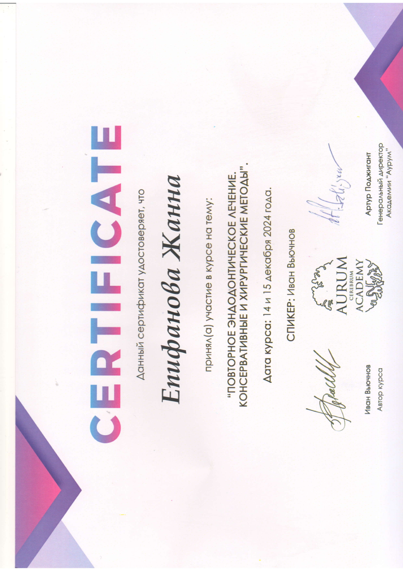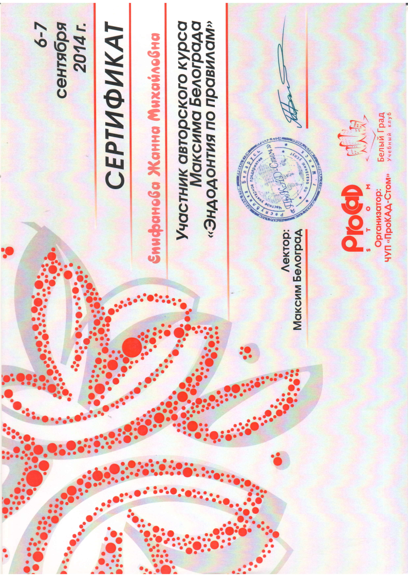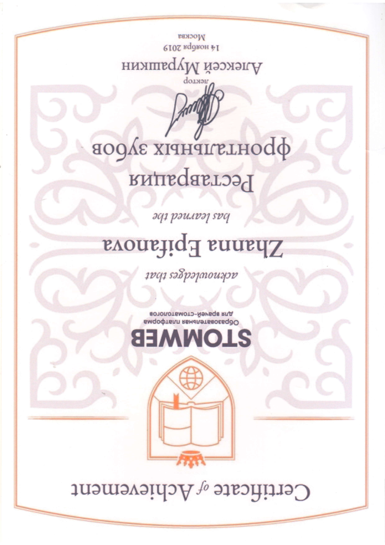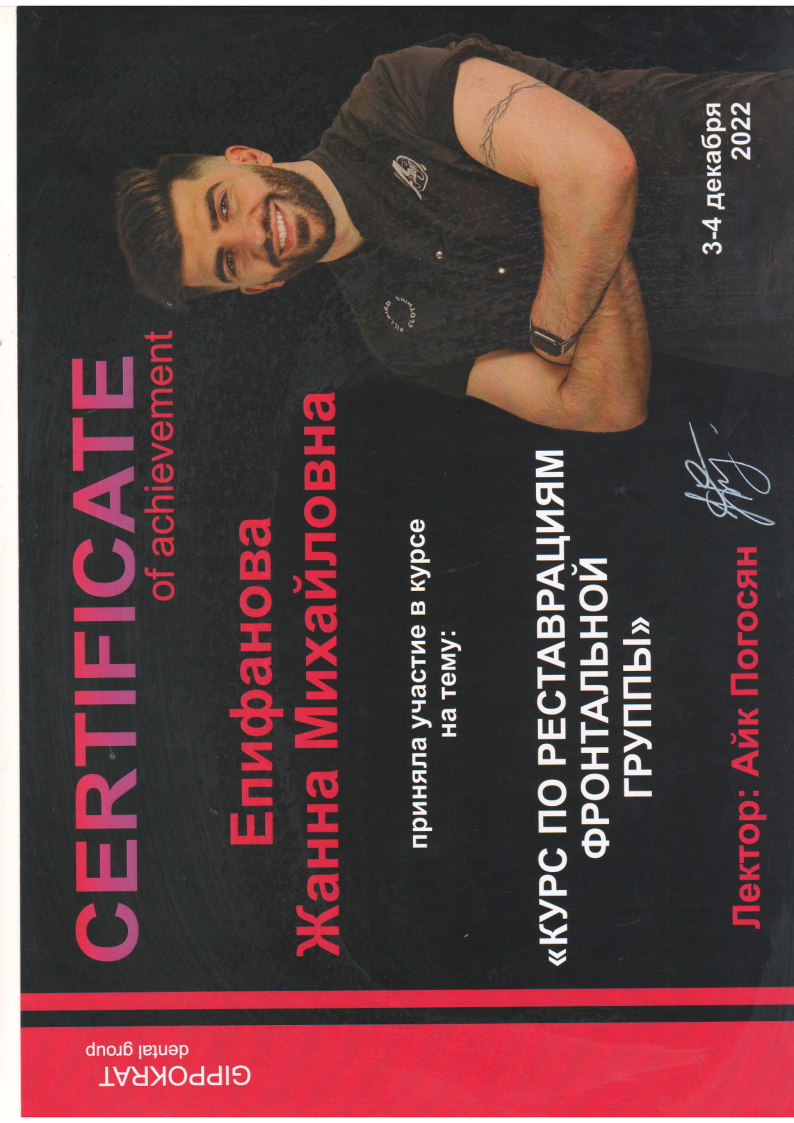 Высшее медицинское образование. Удостоверение о повышении квалификации №670400018477 рег.номер 2301 выдано 14.04.2020 г. «Стоматология общей практики» Сведения о прохождении аккредитации специалиста: № 7725 032896836 от 27.05.2025 года «Стоматолог общей практики» 1. Практический семинар «Клинико-топографическая анатомия в адгезивных реставрациях зубов», 2016 год, А.В. Ветчинкин 2. Грамота «За многолетний добросовестный труд, высокопрофессиональное исполнение служебных обязанностей и в связи с днём медицинского работника», 18 июня, 2012 года 3. Учебный курс «Реставрация временных зубов. Острая боль. На детском стоматологическом приеме», 19 сентября 2015 года, Небольсина Е.В. 4. Мастер класс «Малоинвазивная эстетическая реабилитация фронтальных зубов», 30 октября 2016 года, Василиадис Р. 5. Полный курс «Косметология в практике врача стоматолога», 14-15 ноября 2015 года 6. Диплом за 2-е место в Чемпионате стоматологического мастерства в номинации «Художественная реставрация зубов», 2012 год 7. Семинар «Эстетические реставрации системой ENAMEL PLUS HRi. Техника анатомической стратификации», 27 сентября 2016 года, Исаева Е.С. 8. Учебный курс Марины Приямпольской «Хирургическая эндодонтия», 4-5 июня 2015 года, Приямпольская М.Б. 9. Авторский курс Максима Белограда «Эндодонтия по правилам», 6-7 сентября 2014 года, М. Белоград 10. Курс на тему «Повторное эндодонтическое лечение. Консервативные и хирургические методы», 14-15 декабря 2024 года, Вьючнов И. 11. Курс «Первая помощь, тактика лечения и эстетическая реабилитация травм постоянных зубов», 2 июля 2017 года, Тишкина О. 12. Курс на тему «Реставрация жевательных зубов», В. Щербаков 13. Курс «Эндодонтия», 22 августа – 14 ноября 2017 года, И. Ноенко 14. Обучение по курсу «Интенсивный обучающий практический курс по моделированию и реставрации дистальной группы зубов», 9 декабря 2017 года, Бурдина Г.А. 15. Курс «Обтурация. Апексификация. Закрытие перфорации», 25-26 сентября 2021 года, Землякова О. 16. Обучение на тему «Реставрация фронтальных зубов», 14 ноября 2019 года, Мурашкин А. 17. Консультация в области стоматологии «Медицинская документация», Яременко А., Черкашенин В. 18. Обучение по курсу «Коммуникация врач-пациент, врач-врач. Психологические аспекты (блок 1). Самые главные ошибки», 3 марта 2023 года, Турецкая В.А. 19. Курс на тему «Курс по реставрациям фронтальной группы», 3-4 декабря 2022 года, Погосян А.