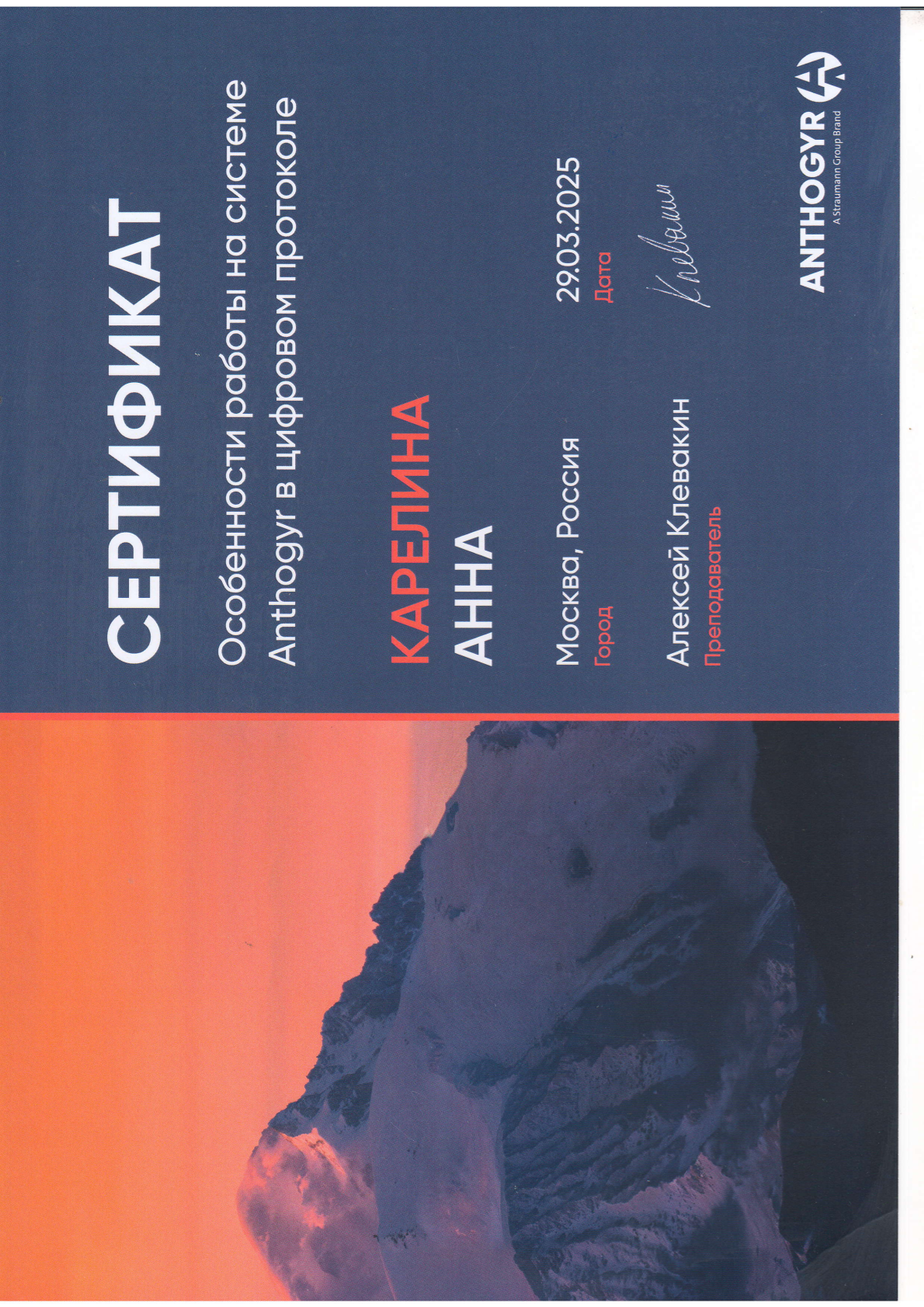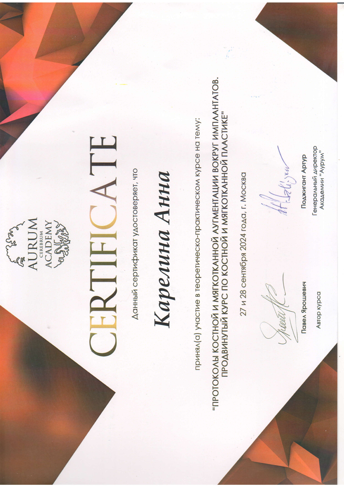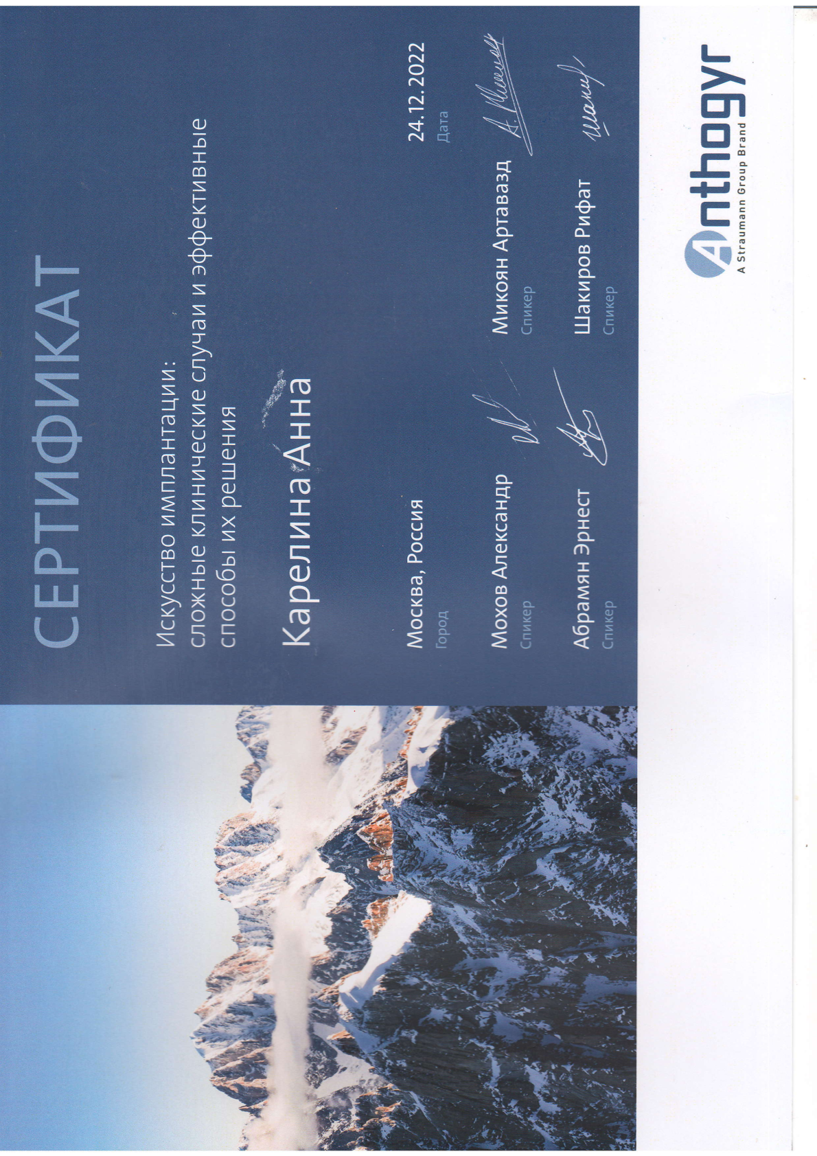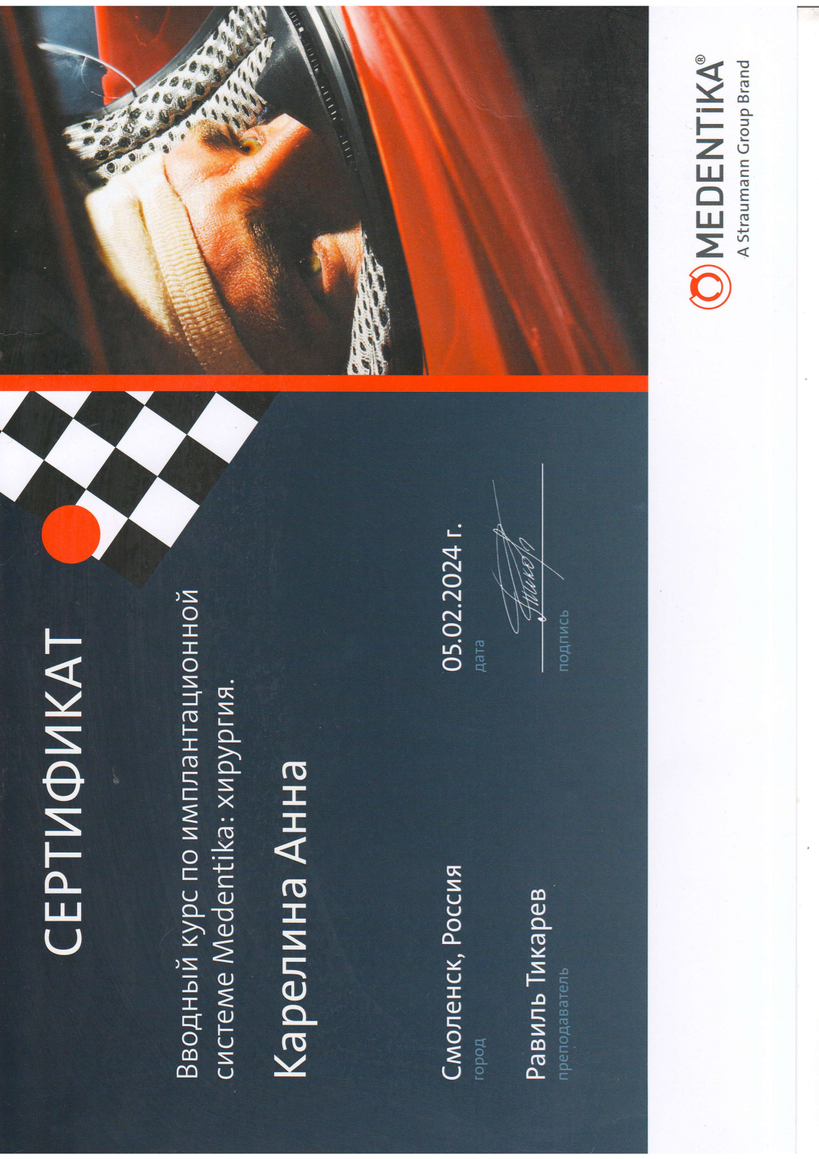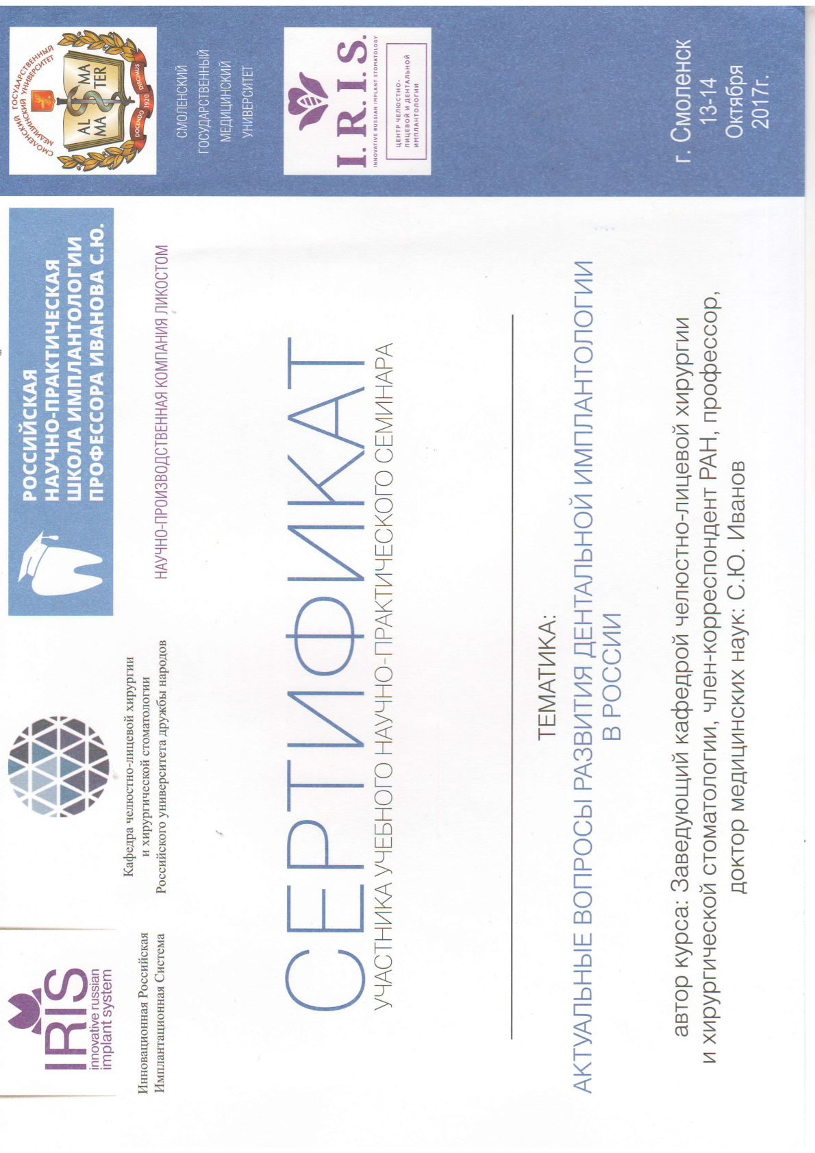 Диплом ИВС № 0104406 СГМУ, 2005 г. - Стоматология. Сертификат: № 0167040019240 2020 г. - «Стоматология хирургическая» №0167040018677 от 14.04.2020 г. - «Стоматология детская» Сведения о прохождении аккредитации специалиста: № 7725 033178595 от 29.07.2025 года «Стоматология хирургическая». Удостоверение о повышении квалификации № 670400063151 от 07.04.2025 г. - «Стоматология детская» • Курс теоретического и практического обучения «JALUPRO — БИОРЕВИТАЛИЗАЦИЯ НОВОГО ПОКОЛЕНИЯ», 25 сентября 2014 года • Специалист имеет право применять препарат «Lantox» (Botulinum Toxin Type A) в клинической практике • Курс: «Базовая хирургическая техника». Теория и практика, 9-10 декабря 2017 года (Е. Шастин) • Курс на тему «Объёмное моделирование мягких тканей лица» (Михайлов Е.А.) • Курс теоретического и практического обучения по мезотерапии (применение препаратов Aesthetic Dermal), 21 сентября 2014 года • Семинар на тему: "Управление кариозным процессом: от теории к практике", 7 марта 2020 года (Ф. Швендике) • Сертификационный курс «Теория и практика применения препарата Диспорт (ботулинический токсин типа А) в неврологии» с правом использования данного препарата в клинической практике, 30 мая 2012 года (Орлова О.Р.) • Курс Restylane, Restylane Perlane, restylane ital, Restylane Vital Light, Rastylane Lip Volume, 23 сентября 2014 года (Кодиева М.Х.) • Обучение по теме: «Современные инъекционные методики в эстетической медицине», 22 сентября – 3 октября 2014 года • КУРС «ЭСТЕТИЧЕСКАЯ КОРРЕКЦИЯ ПРЕПАРАТАМИ BELLCONTOUR» • Сертификационный курс «Теория и практика применения препарата Диспорт (ботулинический токсин типа А) в эстетической медицине» с правом использования данного препарата в клинической практике, 22 сентября 2014 года • Теоретическо-демонстрационный курс на тему: "КОНЦЕПЦИИ ALL-ON-4", 26 - 27 апреля 2025 года (Т. Юров, А. Бикбаев) • Вводный курс по имплантационной системе Medentika: хирургия, 5 февраля 2024 года (Р. Тикарев) • Третий Международный Форум по Детской Стоматологии, 6 марта 2020 года (Мария Сарапульцева, Вэнди Беллис, Хуан Даниэль Флорес, Никола Мейснер, Хубертус Ван Вэс) • Искусство имплантации: сложные клинические случаи и эффективные способы их решения, 24 декабря 2022 года (А. Мохов, А. Эрнест, М. Автавазд, Р. Шакиров) • Seminar entitled «Implantology with the Axiom system», 4-5 февраля 2014 года (Gilles CHAUMANET) • Семинаре "МУКОГИНГИВАЛЬНАЯ ХИРУРГИЯ", 11-12 апреля 2015 года (Февралева А.Ю.) • Курс обучения по системе имплантатов anthogyr Основы имплантации. Хирургический этал, 7 апреля 2009 года (Жданов Е. В) • Курс по программе Долговременный успех имплантации. Преимущества системы ІСХ. Достижения имплантации в стоматологии. Фундаментальные основы остеоинтеграции и долговременного сохранения объема переимплантатных тканей. Диагностика. Планирование и выбор ортопедической конструкции. Хирургические аспекты имплантации. Профилактика осложнений. Профессиональная коммуникация врача-имплантолога. Клинический практикум на фантомах, 3 марта 2018 года (Олесова В.Н., Микрюков В.В., Олесов А.Е.) • Особенности работы на системе Anthogyr в цифровом протоколе, 29 марта 2025 года (А. Клевакин) • Теоретическо-практический курс на тему: "ПРОТОКОЛЫ КОСТНОЙ И МЯГКОТКАННОЙ АУГМЕНТАЦИИ ВОКРУГ ИМПЛАНТАТОВ. • ПРОДВИНУТЫЙ КУРС ПО КОСТНОЙ И МЯГКОТКАННОЙ ПЛАСТИКЕ", 27 - 28 сентября 2024 года (П. Ярошевич)