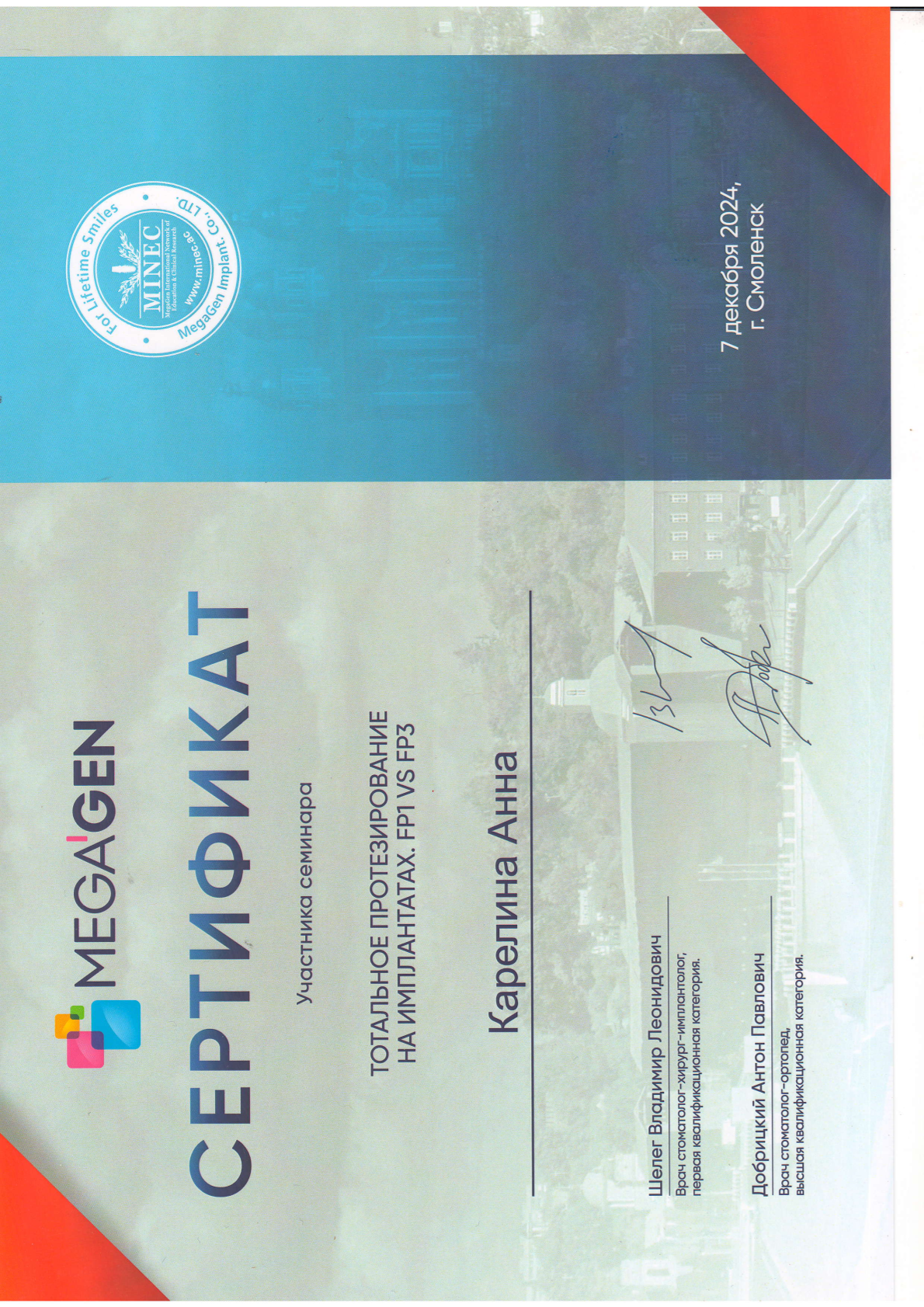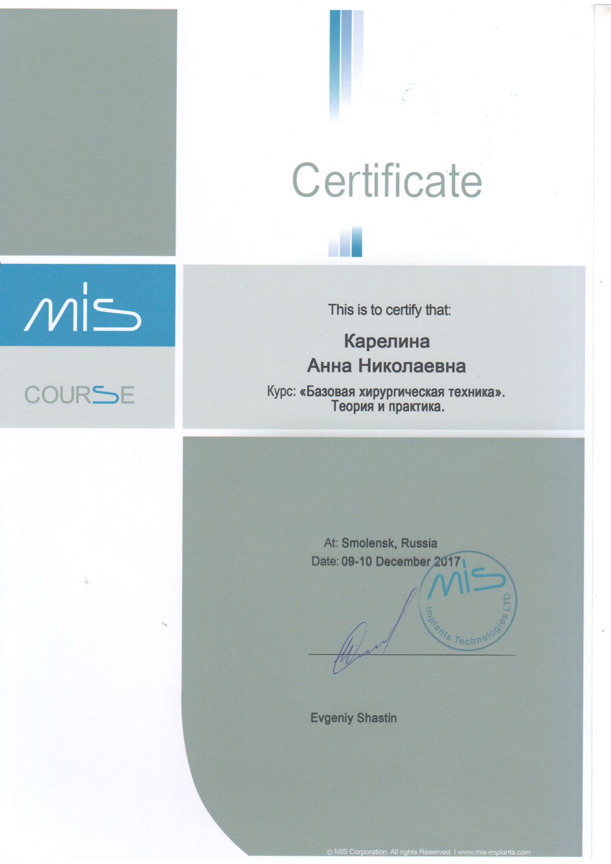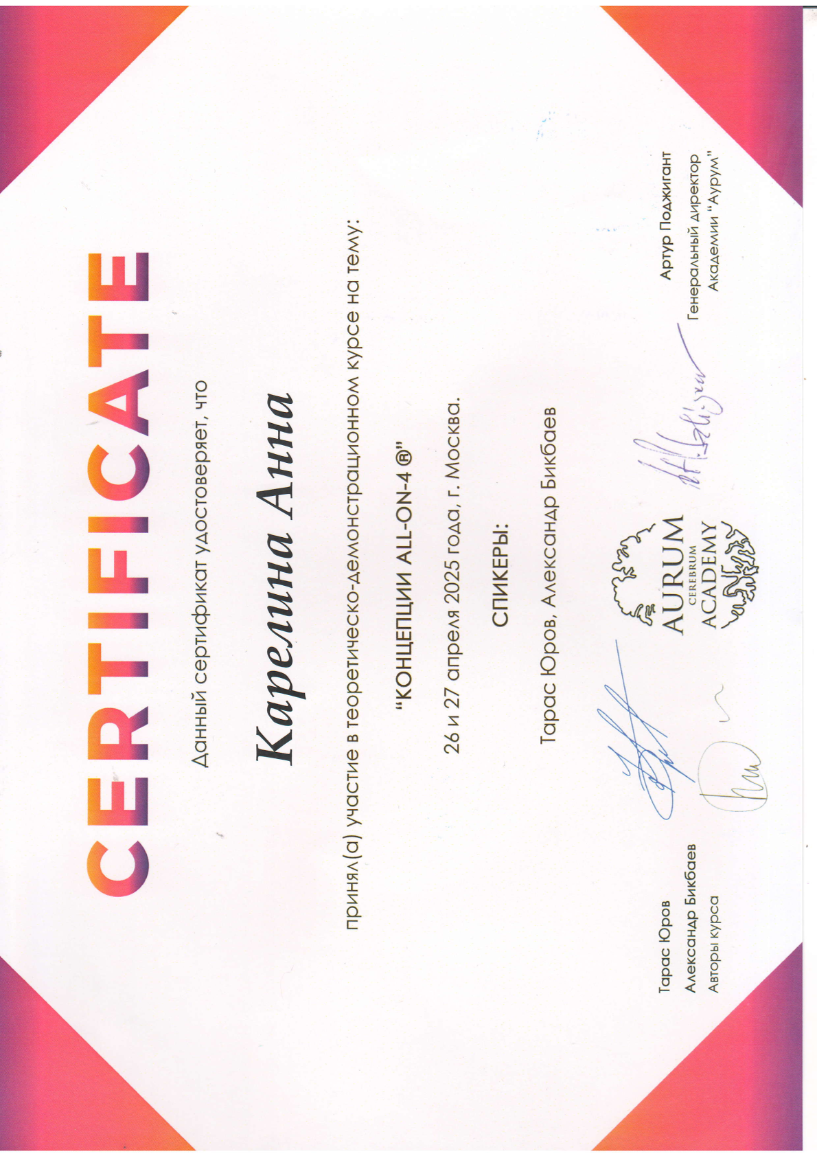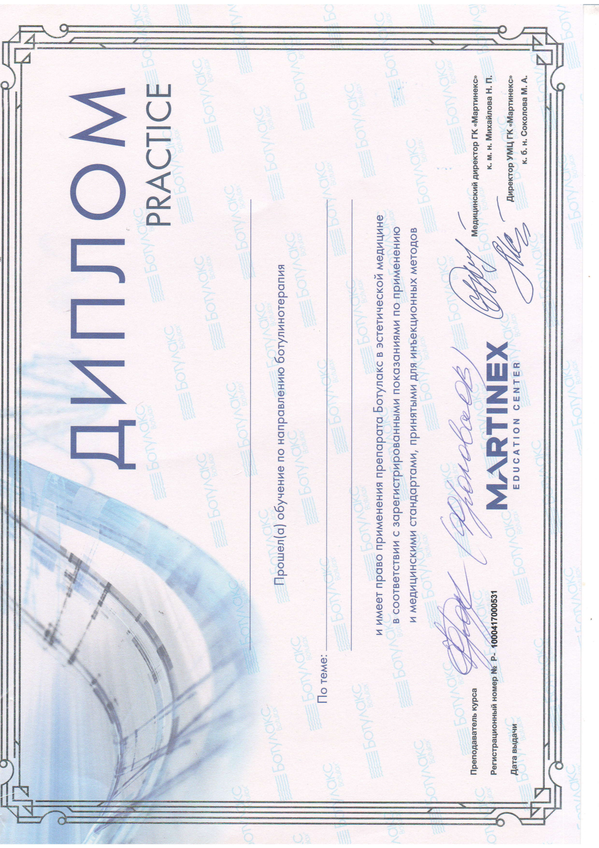 Диплом ИВС № 0104406 СГМУ, 2005 г. - Стоматология. Сертификат: № 0167040019240 2020 г. - «Стоматология хирургическая» №0167040018677 от 14.04.2020 г. - «Стоматология детская» Сведения о прохождении аккредитации специалиста: № 7725 033178595 от 29.07.2025 года «Стоматология хирургическая». Удостоверение о повышении квалификации № 670400063151 от 07.04.2025 г. - «Стоматология детская» • Курс теоретического и практического обучения «JALUPRO — БИОРЕВИТАЛИЗАЦИЯ НОВОГО ПОКОЛЕНИЯ», 25 сентября 2014 года • Специалист имеет право применять препарат «Lantox» (Botulinum Toxin Type A) в клинической практике • Курс: «Базовая хирургическая техника». Теория и практика, 9-10 декабря 2017 года (Е. Шастин) • Курс на тему «Объёмное моделирование мягких тканей лица» (Михайлов Е.А.) • Курс теоретического и практического обучения по мезотерапии (применение препаратов Aesthetic Dermal), 21 сентября 2014 года • Семинар на тему: "Управление кариозным процессом: от теории к практике", 7 марта 2020 года (Ф. Швендике) • Сертификационный курс «Теория и практика применения препарата Диспорт (ботулинический токсин типа А) в неврологии» с правом использования данного препарата в клинической практике, 30 мая 2012 года (Орлова О.Р.) • Курс Restylane, Restylane Perlane, restylane ital, Restylane Vital Light, Rastylane Lip Volume, 23 сентября 2014 года (Кодиева М.Х.) • Обучение по теме: «Современные инъекционные методики в эстетической медицине», 22 сентября – 3 октября 2014 года • КУРС «ЭСТЕТИЧЕСКАЯ КОРРЕКЦИЯ ПРЕПАРАТАМИ BELLCONTOUR» • Сертификационный курс «Теория и практика применения препарата Диспорт (ботулинический токсин типа А) в эстетической медицине» с правом использования данного препарата в клинической практике, 22 сентября 2014 года • Теоретическо-демонстрационный курс на тему: "КОНЦЕПЦИИ ALL-ON-4", 26 - 27 апреля 2025 года (Т. Юров, А. Бикбаев) • Вводный курс по имплантационной системе Medentika: хирургия, 5 февраля 2024 года (Р. Тикарев) • Третий Международный Форум по Детской Стоматологии, 6 марта 2020 года (Мария Сарапульцева, Вэнди Беллис, Хуан Даниэль Флорес, Никола Мейснер, Хубертус Ван Вэс) • Искусство имплантации: сложные клинические случаи и эффективные способы их решения, 24 декабря 2022 года (А. Мохов, А. Эрнест, М. Автавазд, Р. Шакиров) • Seminar entitled «Implantology with the Axiom system», 4-5 февраля 2014 года (Gilles CHAUMANET) • Семинаре "МУКОГИНГИВАЛЬНАЯ ХИРУРГИЯ", 11-12 апреля 2015 года (Февралева А.Ю.) • Курс обучения по системе имплантатов anthogyr Основы имплантации. Хирургический этал, 7 апреля 2009 года (Жданов Е. В) • Курс по программе Долговременный успех имплантации. Преимущества системы ІСХ. Достижения имплантации в стоматологии. Фундаментальные основы остеоинтеграции и долговременного сохранения объема переимплантатных тканей. Диагностика. Планирование и выбор ортопедической конструкции. Хирургические аспекты имплантации. Профилактика осложнений. Профессиональная коммуникация врача-имплантолога. Клинический практикум на фантомах, 3 марта 2018 года (Олесова В.Н., Микрюков В.В., Олесов А.Е.) • Особенности работы на системе Anthogyr в цифровом протоколе, 29 марта 2025 года (А. Клевакин) • Теоретическо-практический курс на тему: "ПРОТОКОЛЫ КОСТНОЙ И МЯГКОТКАННОЙ АУГМЕНТАЦИИ ВОКРУГ ИМПЛАНТАТОВ. • ПРОДВИНУТЫЙ КУРС ПО КОСТНОЙ И МЯГКОТКАННОЙ ПЛАСТИКЕ", 27 - 28 сентября 2024 года (П. Ярошевич)