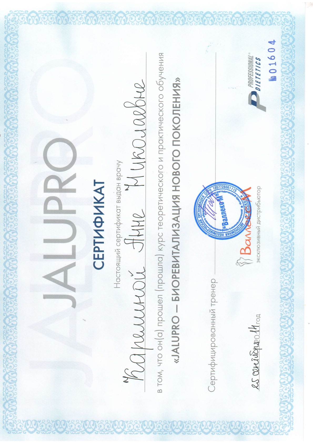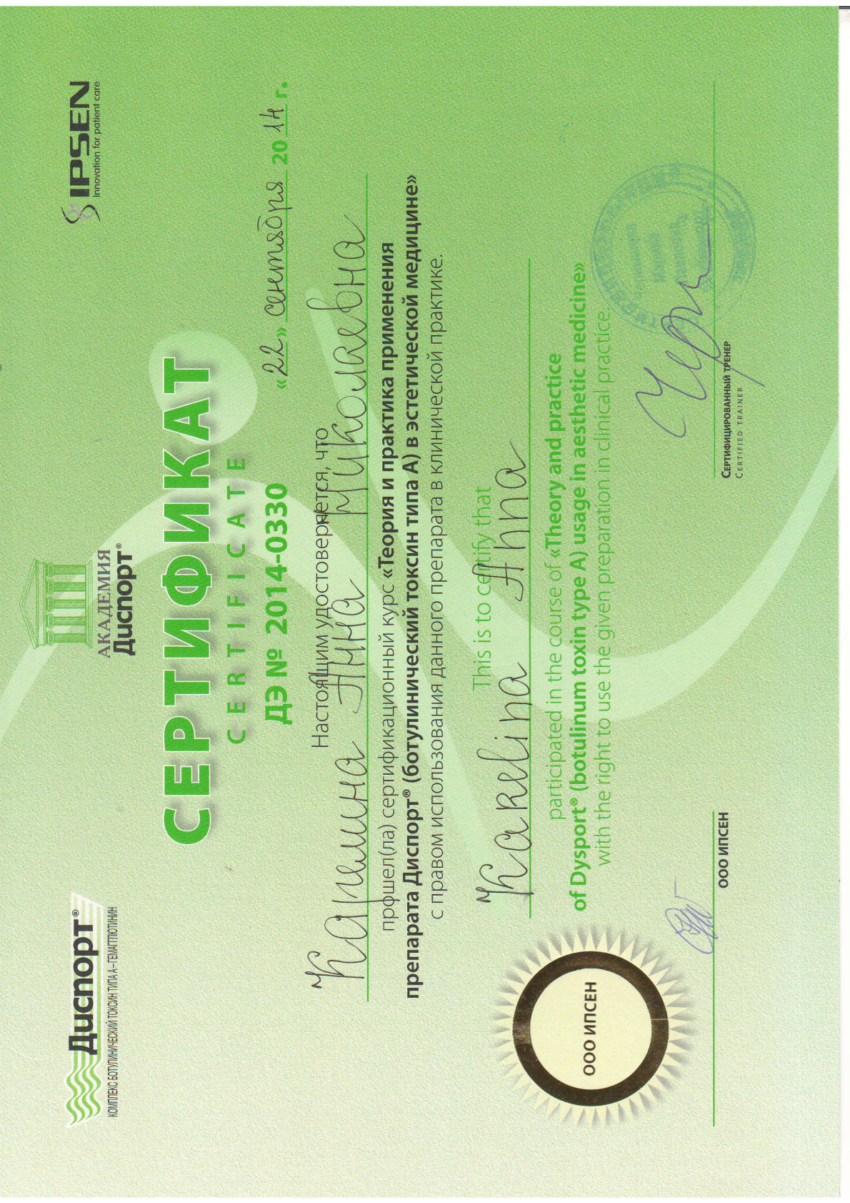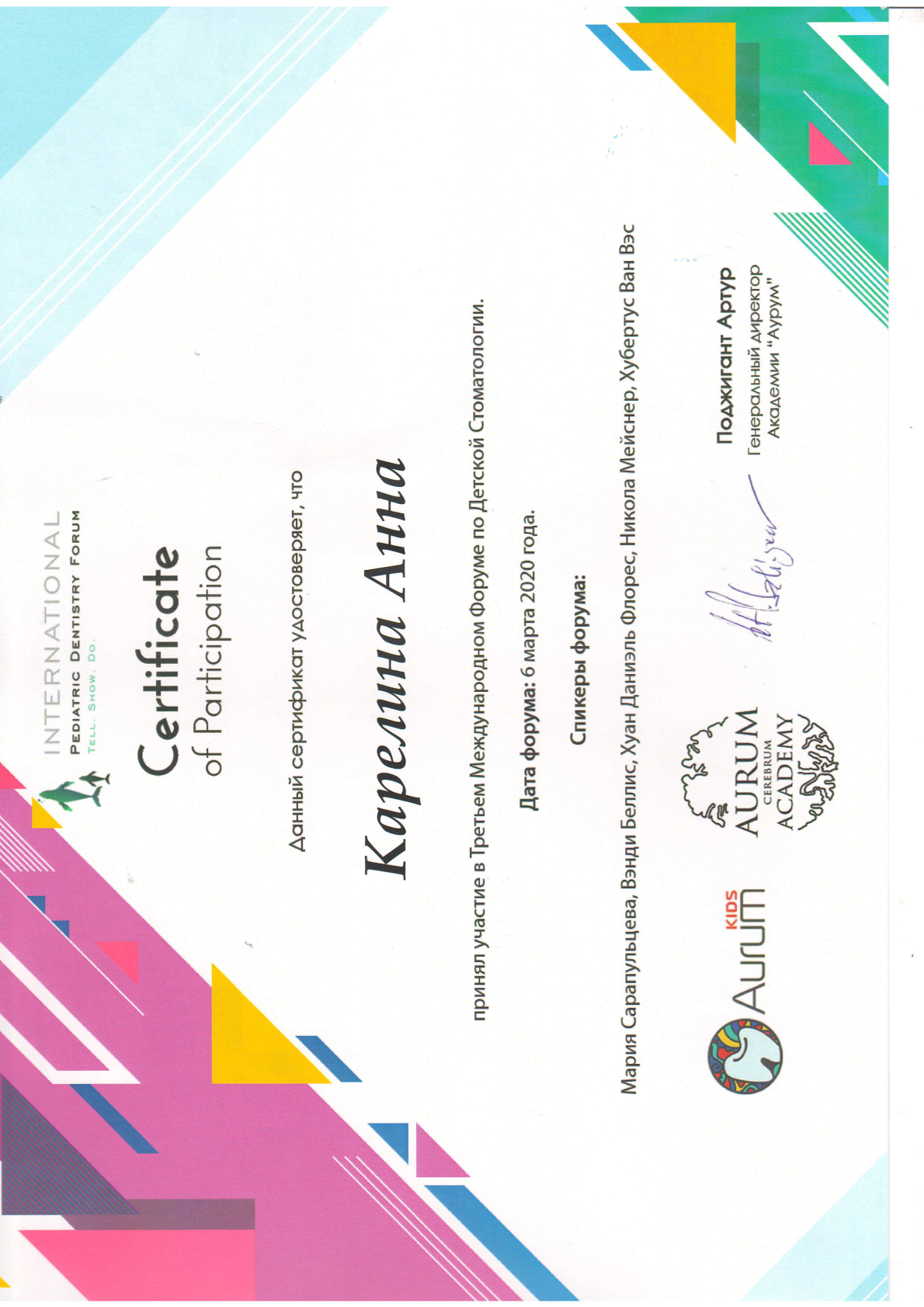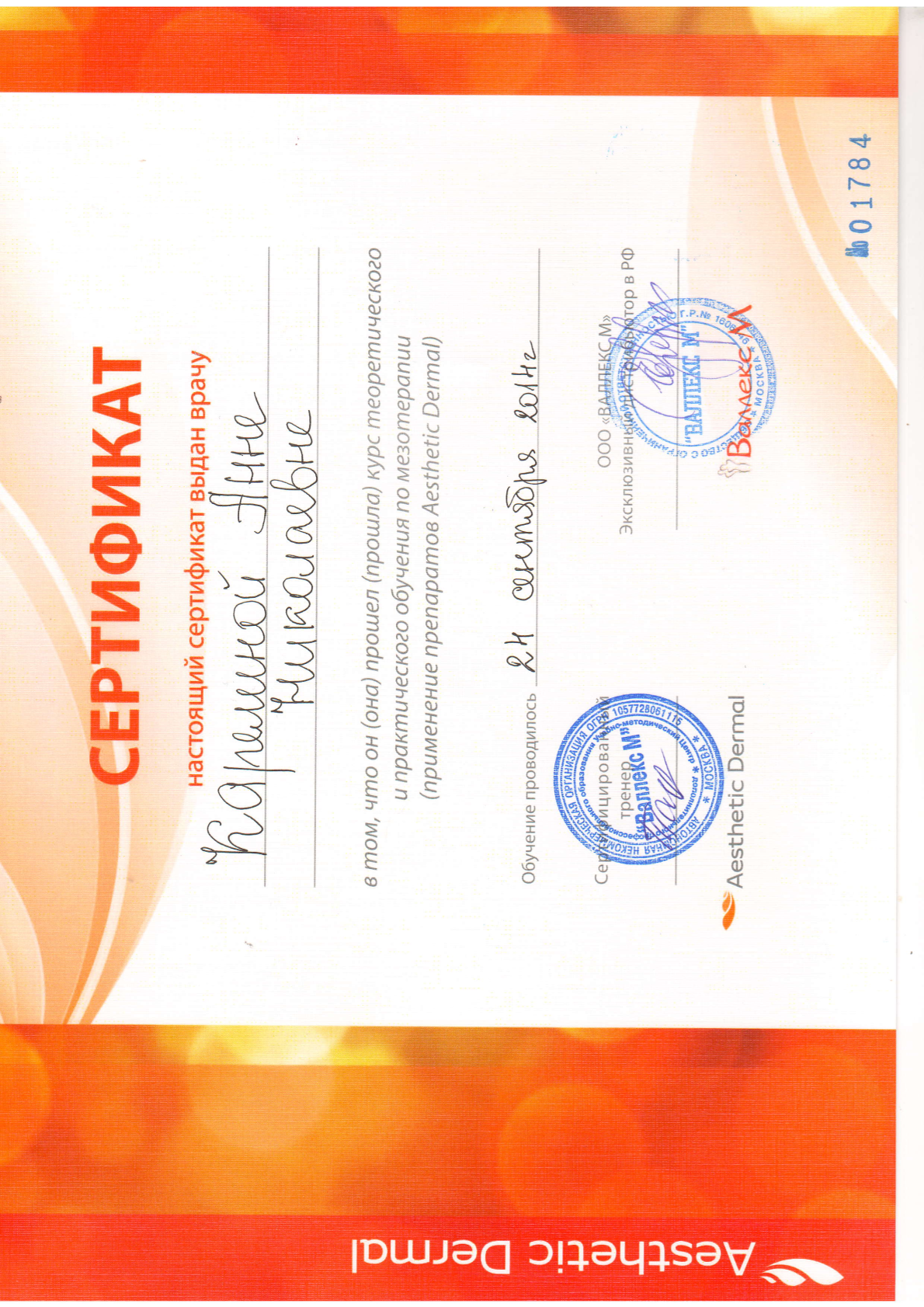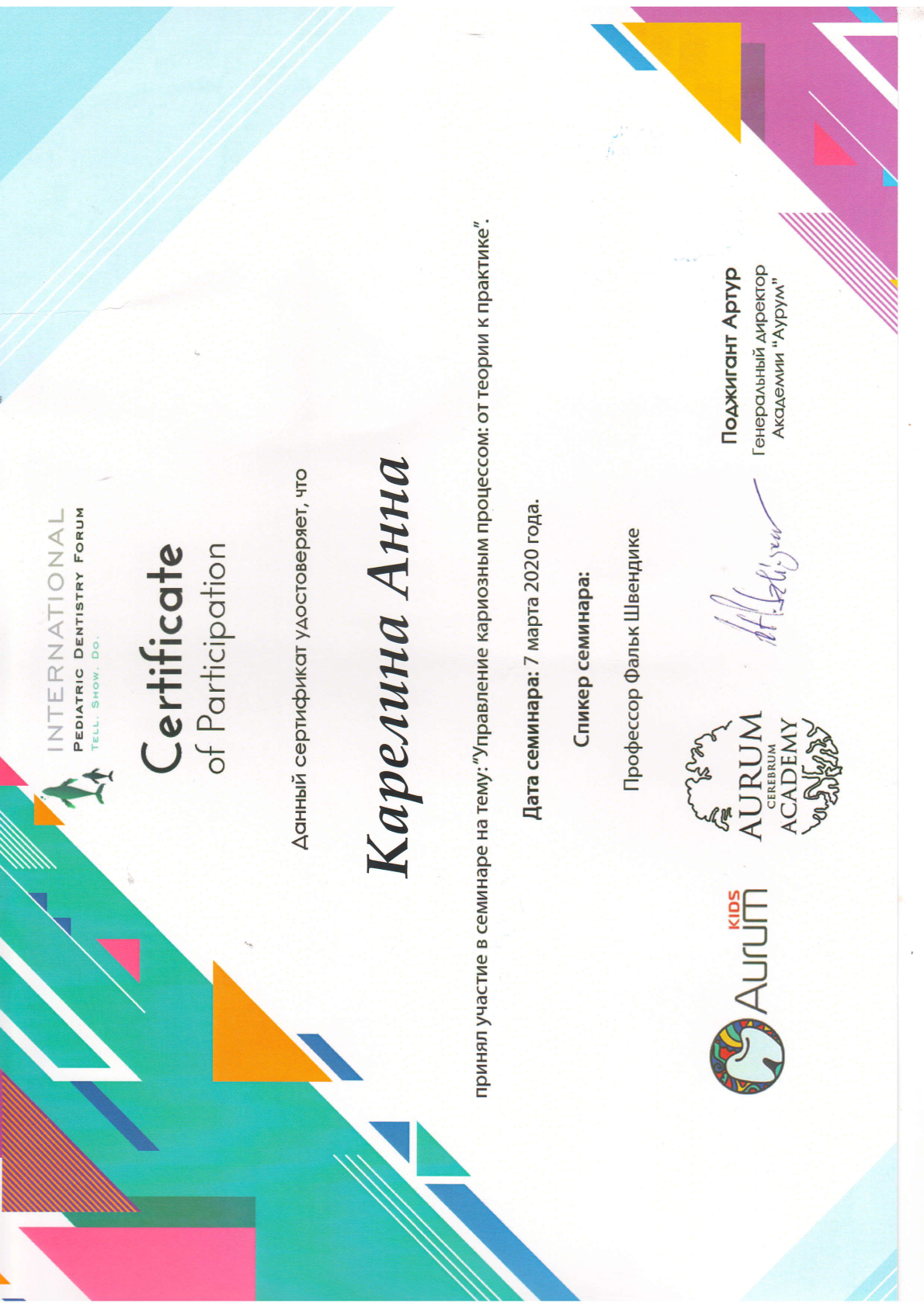 Диплом ИВС № 0104406 СГМУ, 2005 г. - Стоматология. Сертификат: № 0167040019240 2020 г. - «Стоматология хирургическая» №0167040018677 от 14.04.2020 г. - «Стоматология детская» Сведения о прохождении аккредитации специалиста: № 7725 033178595 от 29.07.2025 года «Стоматология хирургическая». Удостоверение о повышении квалификации № 670400063151 от 07.04.2025 г. - «Стоматология детская» • Курс теоретического и практического обучения «JALUPRO — БИОРЕВИТАЛИЗАЦИЯ НОВОГО ПОКОЛЕНИЯ», 25 сентября 2014 года • Специалист имеет право применять препарат «Lantox» (Botulinum Toxin Type A) в клинической практике • Курс: «Базовая хирургическая техника». Теория и практика, 9-10 декабря 2017 года (Е. Шастин) • Курс на тему «Объёмное моделирование мягких тканей лица» (Михайлов Е.А.) • Курс теоретического и практического обучения по мезотерапии (применение препаратов Aesthetic Dermal), 21 сентября 2014 года • Семинар на тему: "Управление кариозным процессом: от теории к практике", 7 марта 2020 года (Ф. Швендике) • Сертификационный курс «Теория и практика применения препарата Диспорт (ботулинический токсин типа А) в неврологии» с правом использования данного препарата в клинической практике, 30 мая 2012 года (Орлова О.Р.) • Курс Restylane, Restylane Perlane, restylane ital, Restylane Vital Light, Rastylane Lip Volume, 23 сентября 2014 года (Кодиева М.Х.) • Обучение по теме: «Современные инъекционные методики в эстетической медицине», 22 сентября – 3 октября 2014 года • КУРС «ЭСТЕТИЧЕСКАЯ КОРРЕКЦИЯ ПРЕПАРАТАМИ BELLCONTOUR» • Сертификационный курс «Теория и практика применения препарата Диспорт (ботулинический токсин типа А) в эстетической медицине» с правом использования данного препарата в клинической практике, 22 сентября 2014 года • Теоретическо-демонстрационный курс на тему: "КОНЦЕПЦИИ ALL-ON-4", 26 - 27 апреля 2025 года (Т. Юров, А. Бикбаев) • Вводный курс по имплантационной системе Medentika: хирургия, 5 февраля 2024 года (Р. Тикарев) • Третий Международный Форум по Детской Стоматологии, 6 марта 2020 года (Мария Сарапульцева, Вэнди Беллис, Хуан Даниэль Флорес, Никола Мейснер, Хубертус Ван Вэс) • Искусство имплантации: сложные клинические случаи и эффективные способы их решения, 24 декабря 2022 года (А. Мохов, А. Эрнест, М. Автавазд, Р. Шакиров) • Seminar entitled «Implantology with the Axiom system», 4-5 февраля 2014 года (Gilles CHAUMANET) • Семинаре "МУКОГИНГИВАЛЬНАЯ ХИРУРГИЯ", 11-12 апреля 2015 года (Февралева А.Ю.) • Курс обучения по системе имплантатов anthogyr Основы имплантации. Хирургический этал, 7 апреля 2009 года (Жданов Е. В) • Курс по программе Долговременный успех имплантации. Преимущества системы ІСХ. Достижения имплантации в стоматологии. Фундаментальные основы остеоинтеграции и долговременного сохранения объема переимплантатных тканей. Диагностика. Планирование и выбор ортопедической конструкции. Хирургические аспекты имплантации. Профилактика осложнений. Профессиональная коммуникация врача-имплантолога. Клинический практикум на фантомах, 3 марта 2018 года (Олесова В.Н., Микрюков В.В., Олесов А.Е.) • Особенности работы на системе Anthogyr в цифровом протоколе, 29 марта 2025 года (А. Клевакин) • Теоретическо-практический курс на тему: "ПРОТОКОЛЫ КОСТНОЙ И МЯГКОТКАННОЙ АУГМЕНТАЦИИ ВОКРУГ ИМПЛАНТАТОВ. • ПРОДВИНУТЫЙ КУРС ПО КОСТНОЙ И МЯГКОТКАННОЙ ПЛАСТИКЕ", 27 - 28 сентября 2024 года (П. Ярошевич)