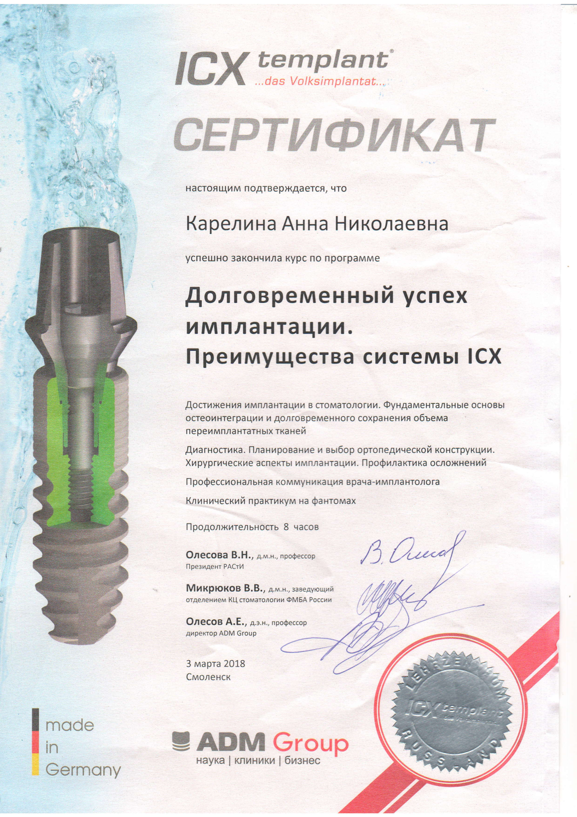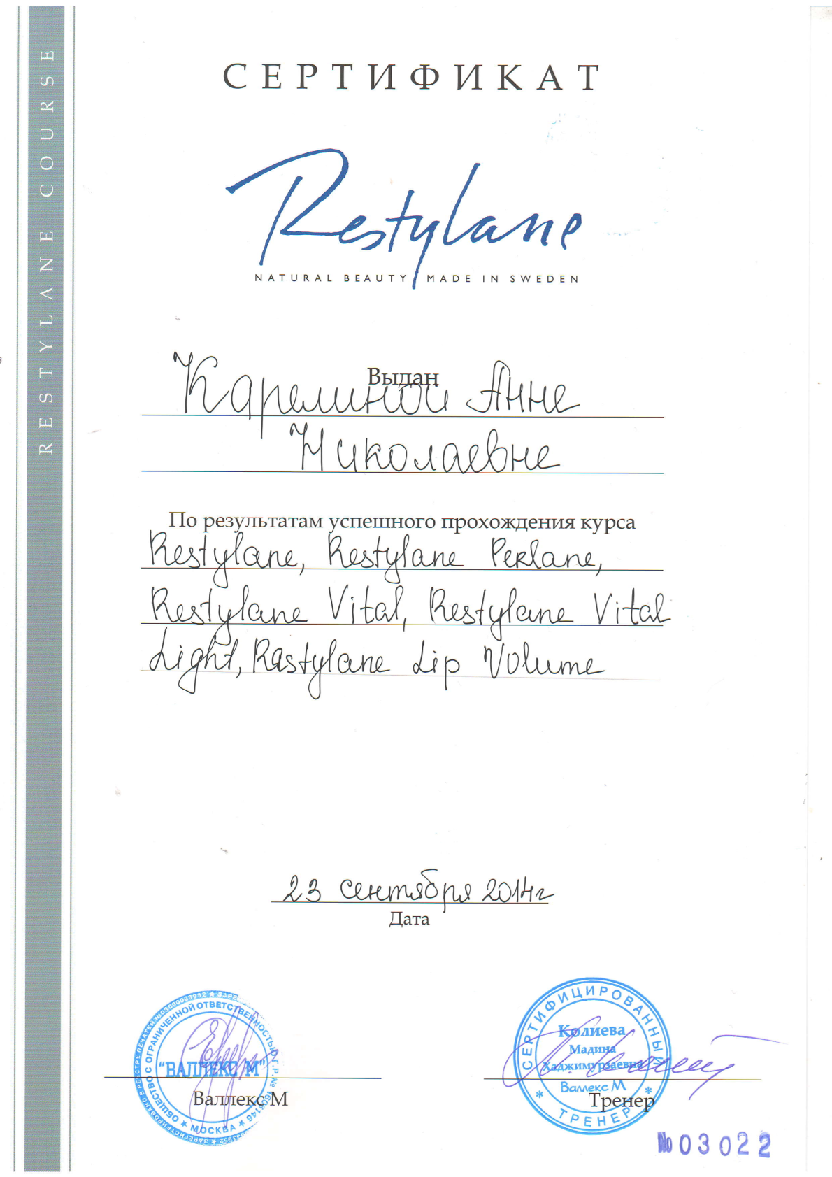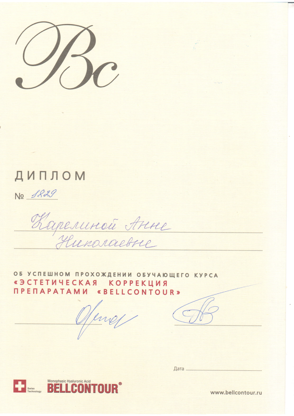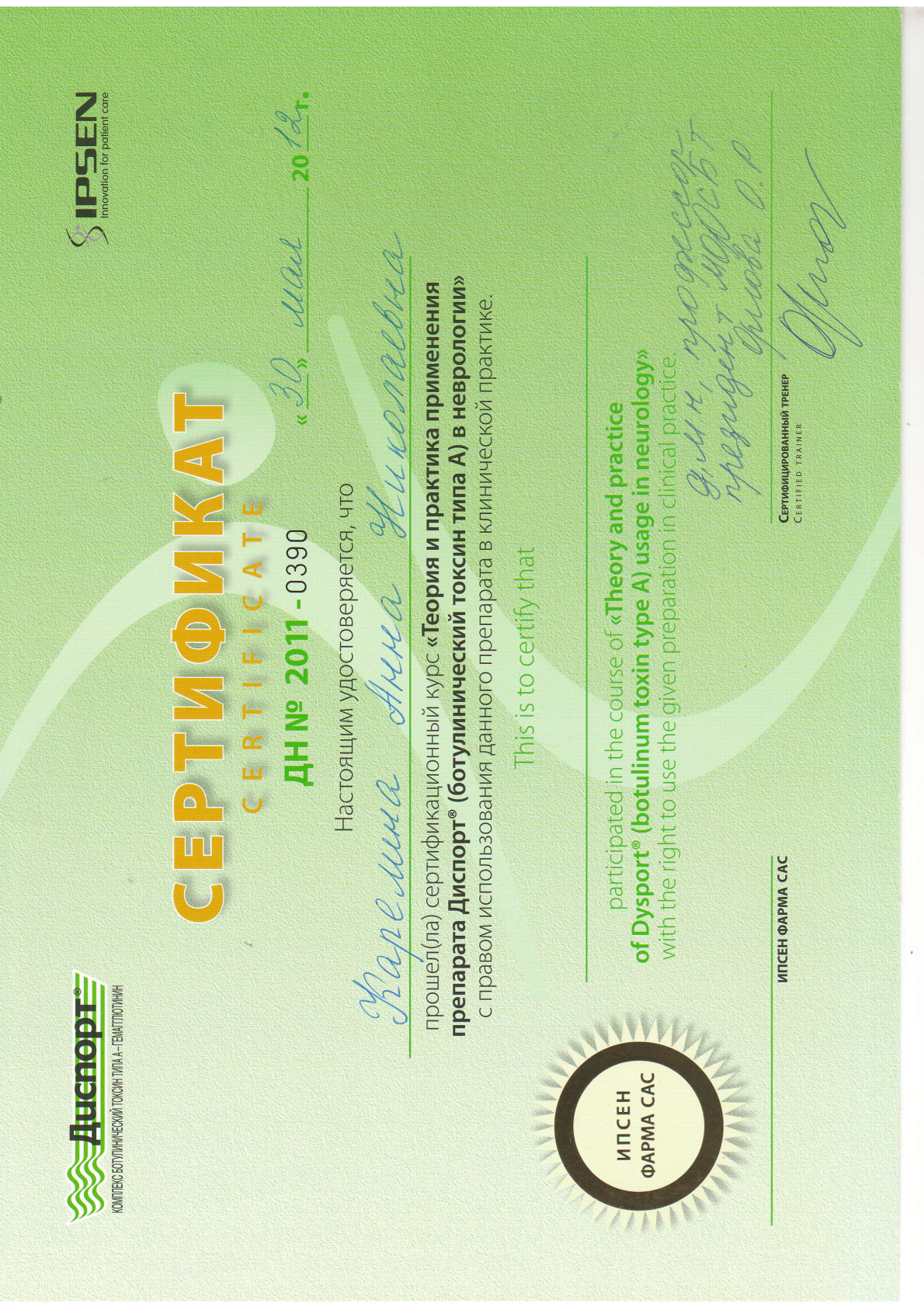 Диплом ИВС № 0104406 СГМУ, 2005 г. - Стоматология. Сертификат: № 0167040019240 2020 г. - «Стоматология хирургическая» №0167040018677 от 14.04.2020 г. - «Стоматология детская» Сведения о прохождении аккредитации специалиста: № 7725 033178595 от 29.07.2025 года «Стоматология хирургическая». Удостоверение о повышении квалификации № 670400063151 от 07.04.2025 г. - «Стоматология детская» • Курс теоретического и практического обучения «JALUPRO — БИОРЕВИТАЛИЗАЦИЯ НОВОГО ПОКОЛЕНИЯ», 25 сентября 2014 года • Специалист имеет право применять препарат «Lantox» (Botulinum Toxin Type A) в клинической практике • Курс: «Базовая хирургическая техника». Теория и практика, 9-10 декабря 2017 года (Е. Шастин) • Курс на тему «Объёмное моделирование мягких тканей лица» (Михайлов Е.А.) • Курс теоретического и практического обучения по мезотерапии (применение препаратов Aesthetic Dermal), 21 сентября 2014 года • Семинар на тему: "Управление кариозным процессом: от теории к практике", 7 марта 2020 года (Ф. Швендике) • Сертификационный курс «Теория и практика применения препарата Диспорт (ботулинический токсин типа А) в неврологии» с правом использования данного препарата в клинической практике, 30 мая 2012 года (Орлова О.Р.) • Курс Restylane, Restylane Perlane, restylane ital, Restylane Vital Light, Rastylane Lip Volume, 23 сентября 2014 года (Кодиева М.Х.) • Обучение по теме: «Современные инъекционные методики в эстетической медицине», 22 сентября – 3 октября 2014 года • КУРС «ЭСТЕТИЧЕСКАЯ КОРРЕКЦИЯ ПРЕПАРАТАМИ BELLCONTOUR» • Сертификационный курс «Теория и практика применения препарата Диспорт (ботулинический токсин типа А) в эстетической медицине» с правом использования данного препарата в клинической практике, 22 сентября 2014 года • Теоретическо-демонстрационный курс на тему: "КОНЦЕПЦИИ ALL-ON-4", 26 - 27 апреля 2025 года (Т. Юров, А. Бикбаев) • Вводный курс по имплантационной системе Medentika: хирургия, 5 февраля 2024 года (Р. Тикарев) • Третий Международный Форум по Детской Стоматологии, 6 марта 2020 года (Мария Сарапульцева, Вэнди Беллис, Хуан Даниэль Флорес, Никола Мейснер, Хубертус Ван Вэс) • Искусство имплантации: сложные клинические случаи и эффективные способы их решения, 24 декабря 2022 года (А. Мохов, А. Эрнест, М. Автавазд, Р. Шакиров) • Seminar entitled «Implantology with the Axiom system», 4-5 февраля 2014 года (Gilles CHAUMANET) • Семинаре "МУКОГИНГИВАЛЬНАЯ ХИРУРГИЯ", 11-12 апреля 2015 года (Февралева А.Ю.) • Курс обучения по системе имплантатов anthogyr Основы имплантации. Хирургический этал, 7 апреля 2009 года (Жданов Е. В) • Курс по программе Долговременный успех имплантации. Преимущества системы ІСХ. Достижения имплантации в стоматологии. Фундаментальные основы остеоинтеграции и долговременного сохранения объема переимплантатных тканей. Диагностика. Планирование и выбор ортопедической конструкции. Хирургические аспекты имплантации. Профилактика осложнений. Профессиональная коммуникация врача-имплантолога. Клинический практикум на фантомах, 3 марта 2018 года (Олесова В.Н., Микрюков В.В., Олесов А.Е.) • Особенности работы на системе Anthogyr в цифровом протоколе, 29 марта 2025 года (А. Клевакин) • Теоретическо-практический курс на тему: "ПРОТОКОЛЫ КОСТНОЙ И МЯГКОТКАННОЙ АУГМЕНТАЦИИ ВОКРУГ ИМПЛАНТАТОВ. • ПРОДВИНУТЫЙ КУРС ПО КОСТНОЙ И МЯГКОТКАННОЙ ПЛАСТИКЕ", 27 - 28 сентября 2024 года (П. Ярошевич)