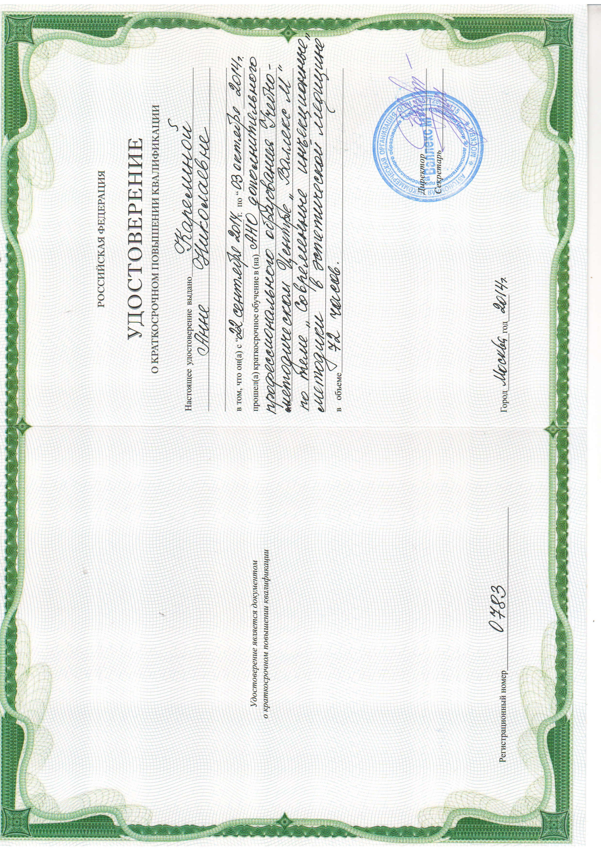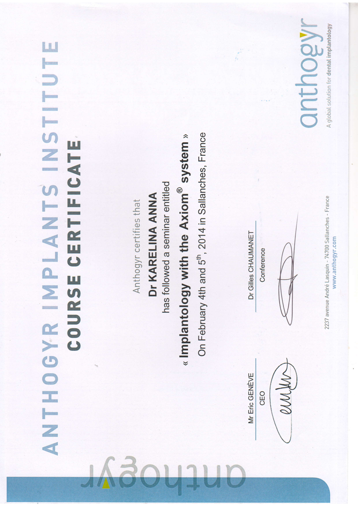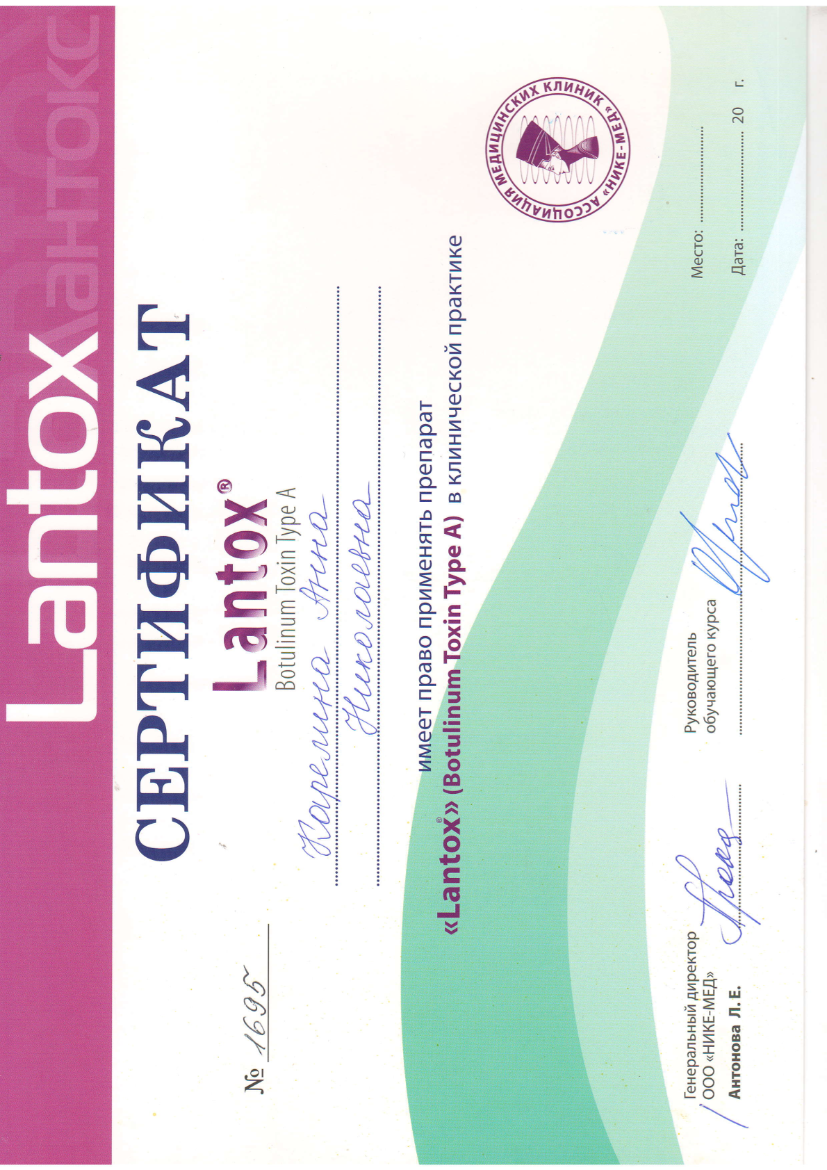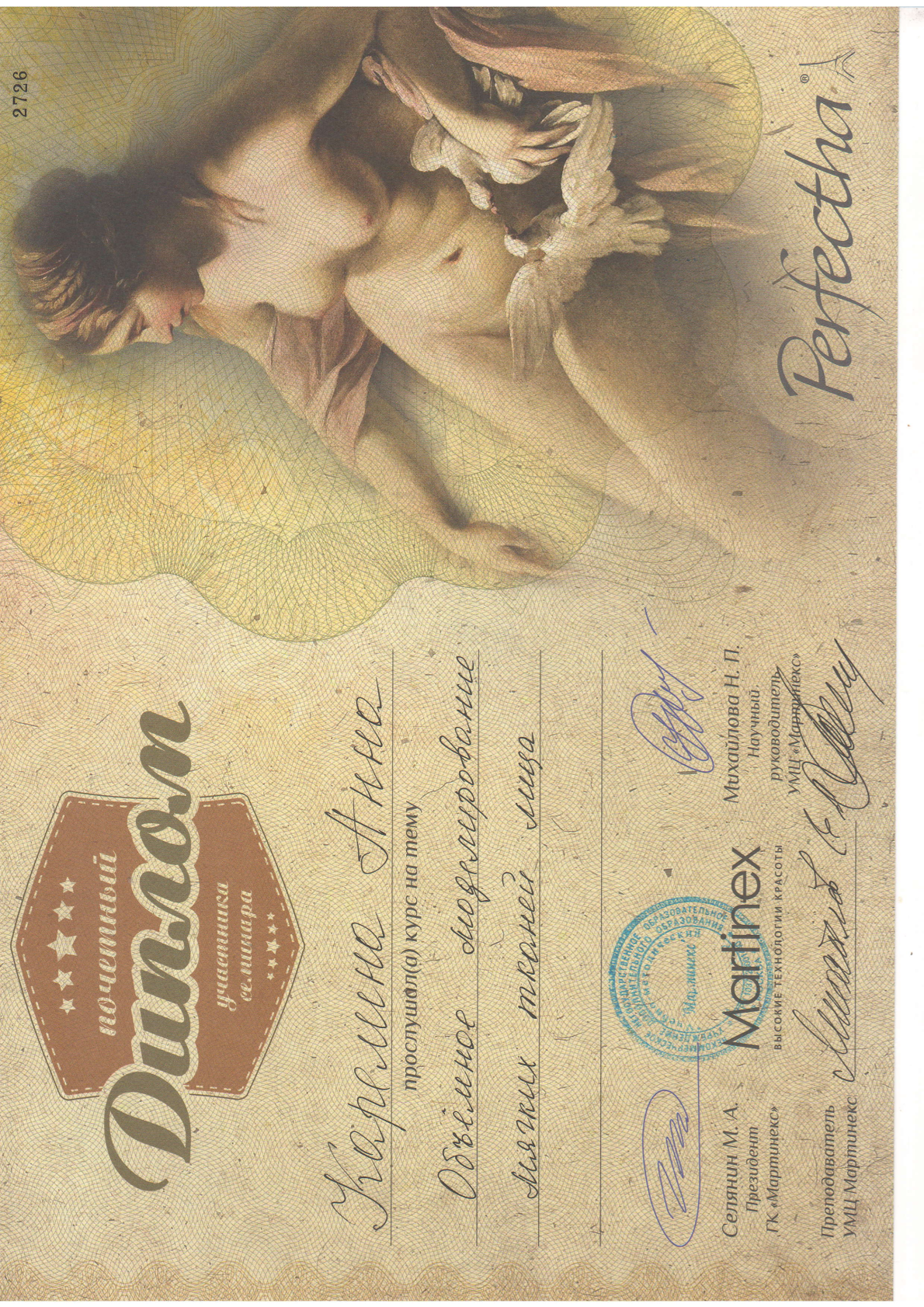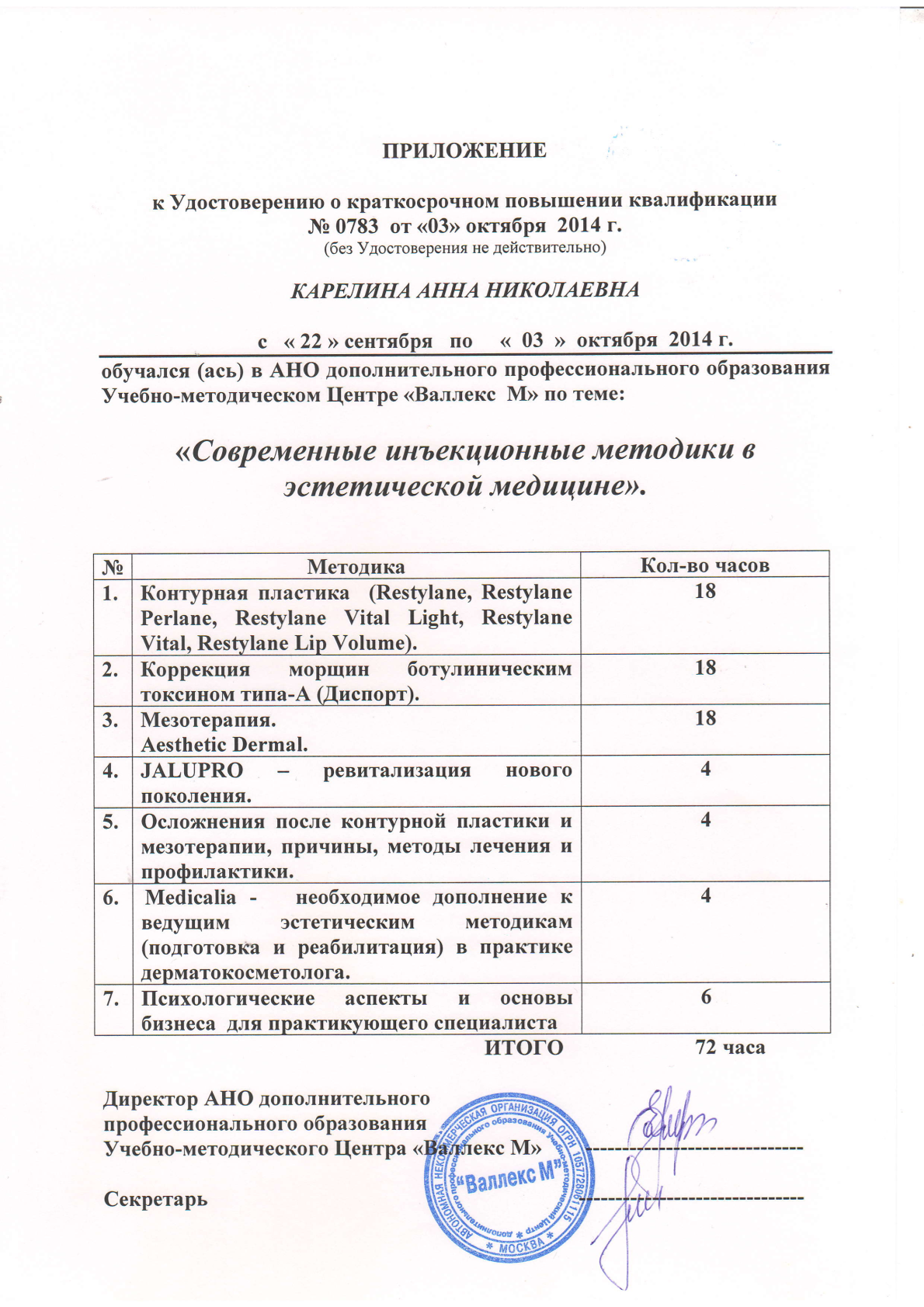 Диплом ИВС № 0104406 СГМУ, 2005 г. - Стоматология. Сертификат: № 0167040019240 2020 г. - «Стоматология хирургическая» №0167040018677 от 14.04.2020 г. - «Стоматология детская» Сведения о прохождении аккредитации специалиста: № 7725 033178595 от 29.07.2025 года «Стоматология хирургическая». Удостоверение о повышении квалификации № 670400063151 от 07.04.2025 г. - «Стоматология детская» • Курс теоретического и практического обучения «JALUPRO — БИОРЕВИТАЛИЗАЦИЯ НОВОГО ПОКОЛЕНИЯ», 25 сентября 2014 года • Специалист имеет право применять препарат «Lantox» (Botulinum Toxin Type A) в клинической практике • Курс: «Базовая хирургическая техника». Теория и практика, 9-10 декабря 2017 года (Е. Шастин) • Курс на тему «Объёмное моделирование мягких тканей лица» (Михайлов Е.А.) • Курс теоретического и практического обучения по мезотерапии (применение препаратов Aesthetic Dermal), 21 сентября 2014 года • Семинар на тему: "Управление кариозным процессом: от теории к практике", 7 марта 2020 года (Ф. Швендике) • Сертификационный курс «Теория и практика применения препарата Диспорт (ботулинический токсин типа А) в неврологии» с правом использования данного препарата в клинической практике, 30 мая 2012 года (Орлова О.Р.) • Курс Restylane, Restylane Perlane, restylane ital, Restylane Vital Light, Rastylane Lip Volume, 23 сентября 2014 года (Кодиева М.Х.) • Обучение по теме: «Современные инъекционные методики в эстетической медицине», 22 сентября – 3 октября 2014 года • КУРС «ЭСТЕТИЧЕСКАЯ КОРРЕКЦИЯ ПРЕПАРАТАМИ BELLCONTOUR» • Сертификационный курс «Теория и практика применения препарата Диспорт (ботулинический токсин типа А) в эстетической медицине» с правом использования данного препарата в клинической практике, 22 сентября 2014 года • Теоретическо-демонстрационный курс на тему: "КОНЦЕПЦИИ ALL-ON-4", 26 - 27 апреля 2025 года (Т. Юров, А. Бикбаев) • Вводный курс по имплантационной системе Medentika: хирургия, 5 февраля 2024 года (Р. Тикарев) • Третий Международный Форум по Детской Стоматологии, 6 марта 2020 года (Мария Сарапульцева, Вэнди Беллис, Хуан Даниэль Флорес, Никола Мейснер, Хубертус Ван Вэс) • Искусство имплантации: сложные клинические случаи и эффективные способы их решения, 24 декабря 2022 года (А. Мохов, А. Эрнест, М. Автавазд, Р. Шакиров) • Seminar entitled «Implantology with the Axiom system», 4-5 февраля 2014 года (Gilles CHAUMANET) • Семинаре "МУКОГИНГИВАЛЬНАЯ ХИРУРГИЯ", 11-12 апреля 2015 года (Февралева А.Ю.) • Курс обучения по системе имплантатов anthogyr Основы имплантации. Хирургический этал, 7 апреля 2009 года (Жданов Е. В) • Курс по программе Долговременный успех имплантации. Преимущества системы ІСХ. Достижения имплантации в стоматологии. Фундаментальные основы остеоинтеграции и долговременного сохранения объема переимплантатных тканей. Диагностика. Планирование и выбор ортопедической конструкции. Хирургические аспекты имплантации. Профилактика осложнений. Профессиональная коммуникация врача-имплантолога. Клинический практикум на фантомах, 3 марта 2018 года (Олесова В.Н., Микрюков В.В., Олесов А.Е.) • Особенности работы на системе Anthogyr в цифровом протоколе, 29 марта 2025 года (А. Клевакин) • Теоретическо-практический курс на тему: "ПРОТОКОЛЫ КОСТНОЙ И МЯГКОТКАННОЙ АУГМЕНТАЦИИ ВОКРУГ ИМПЛАНТАТОВ. • ПРОДВИНУТЫЙ КУРС ПО КОСТНОЙ И МЯГКОТКАННОЙ ПЛАСТИКЕ", 27 - 28 сентября 2024 года (П. Ярошевич)
