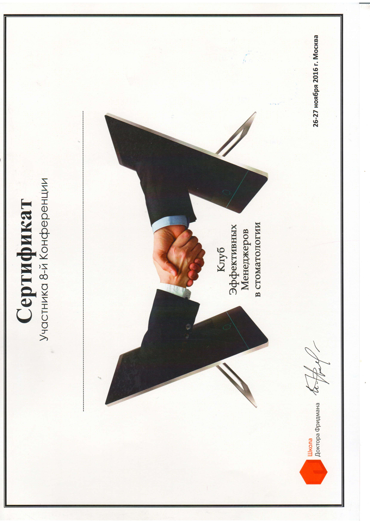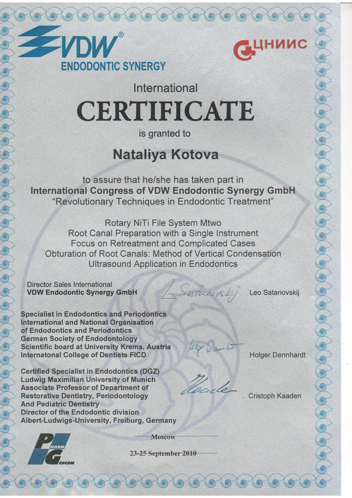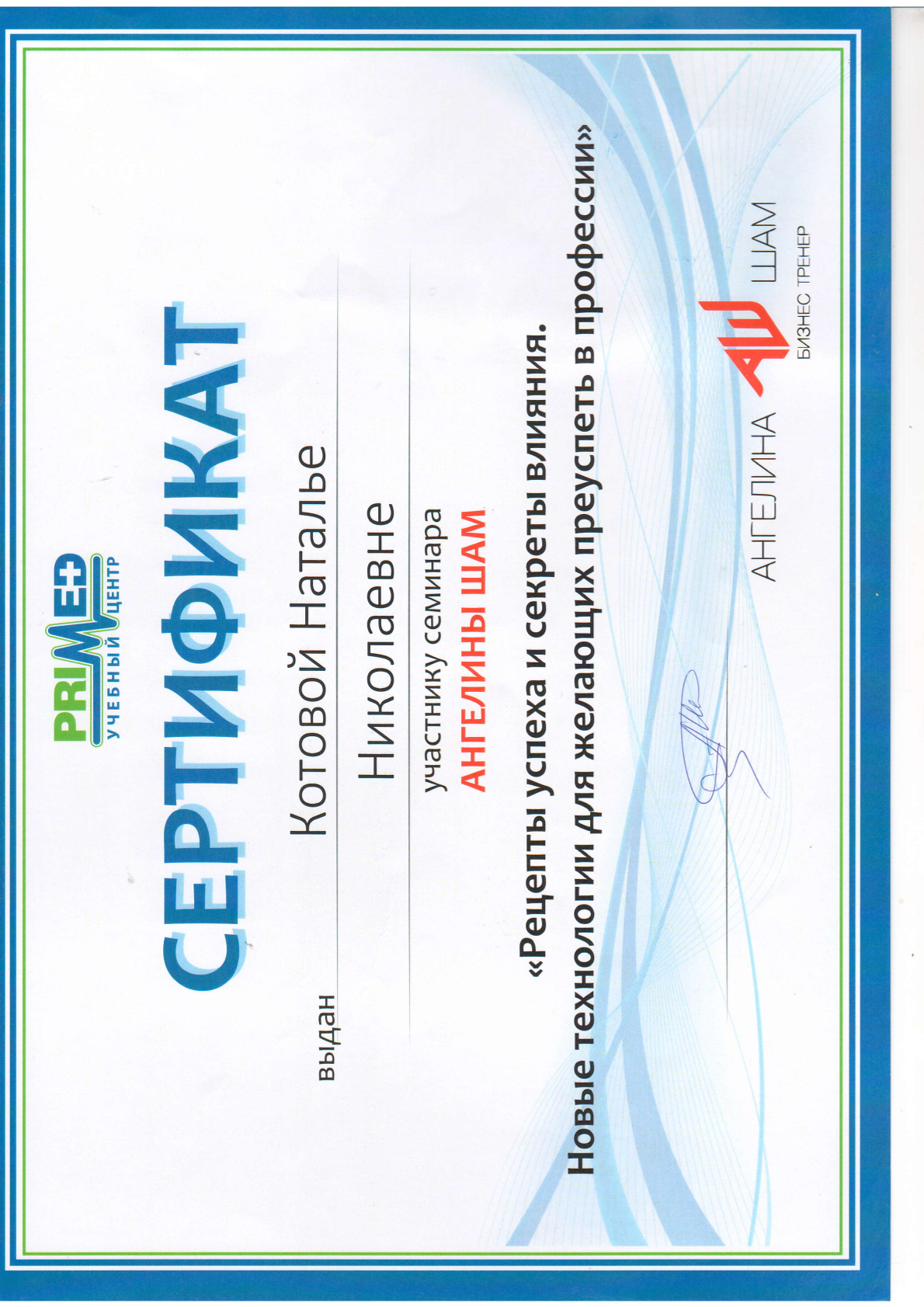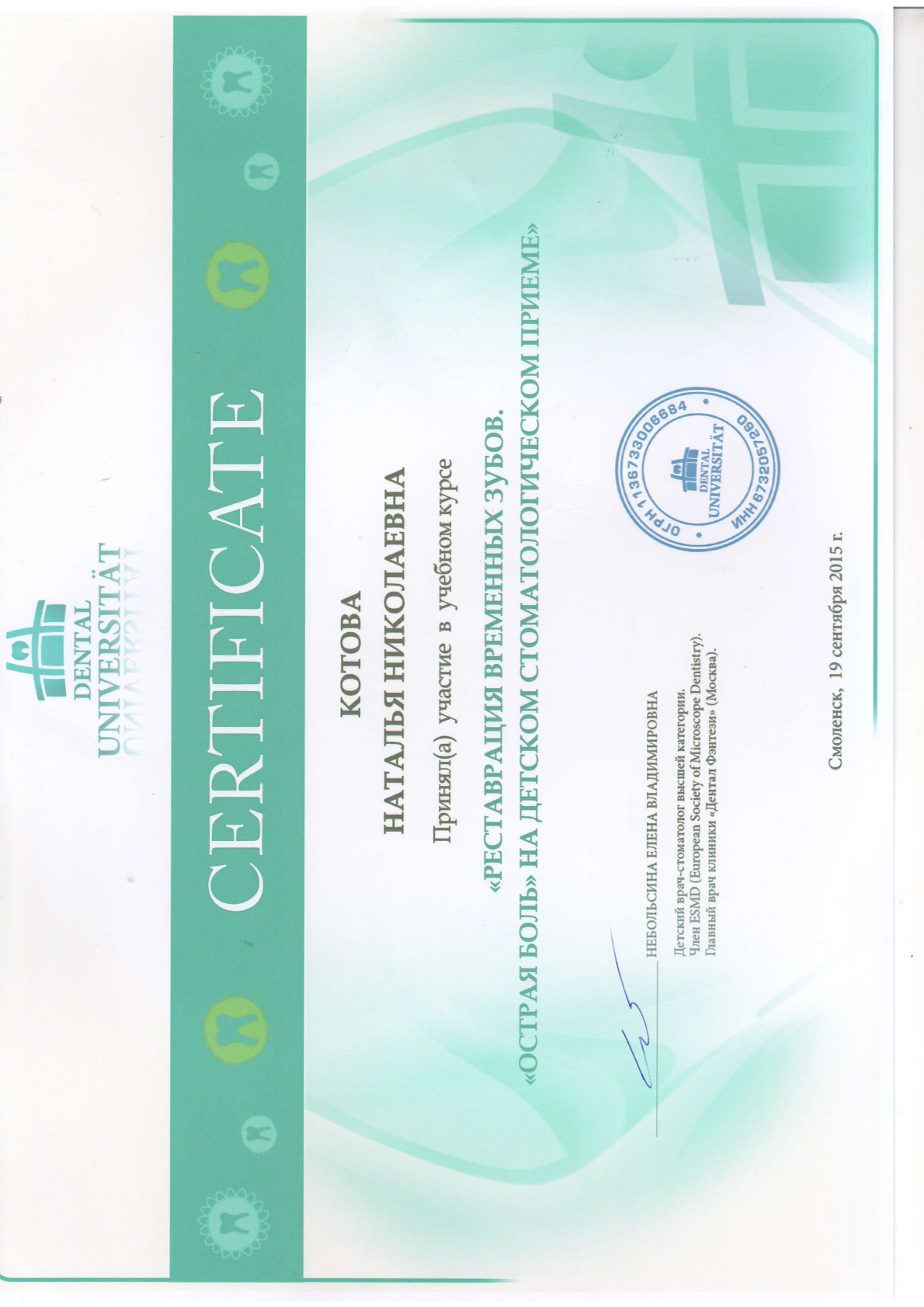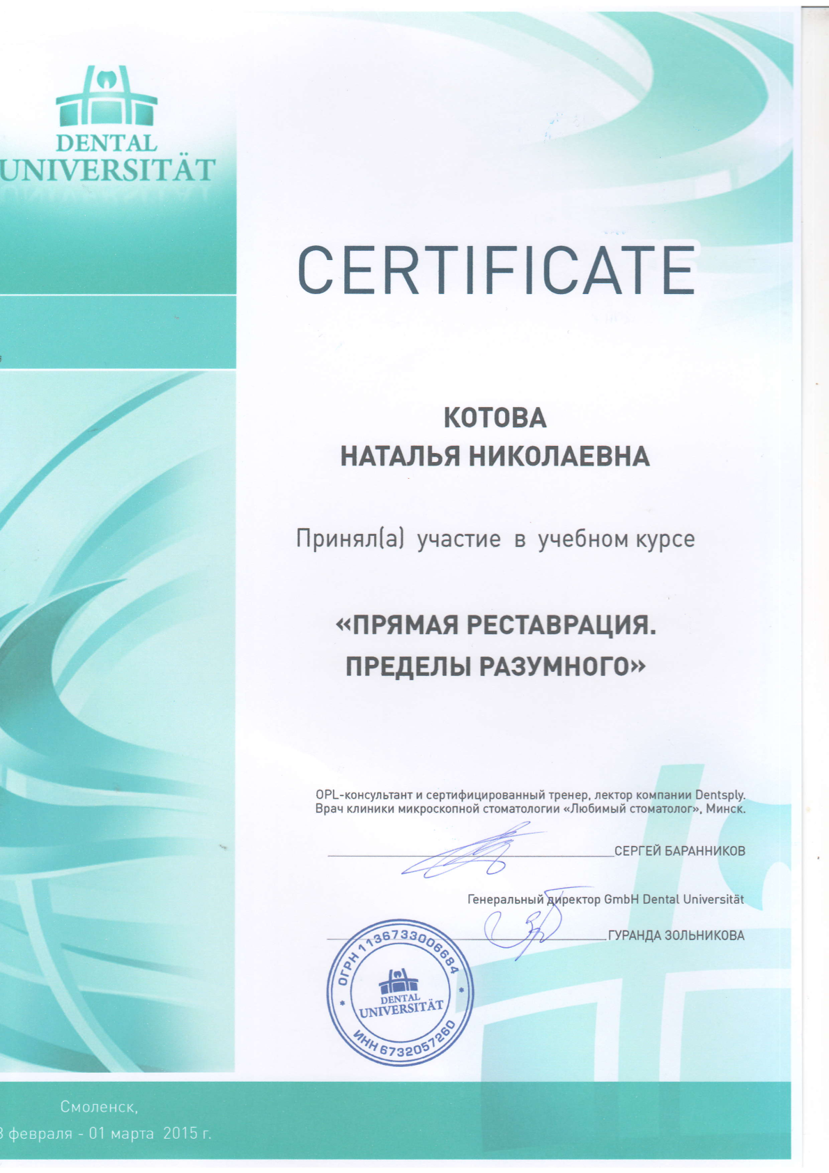 Военно-медицинский факультет при Самарском государственном медицинском университете, диплом ABC 0527354 выдан 18.06.1998 г., специальность «Стоматология». Сертификат специалиста 1162340011144 рег.№6/03/08-12/21-СС выдан 30.11.2020 г. «Стоматология общей практики». Удостоверение о повышении квалификации 340000295247 рег. №6/03/08-12/21-ПК выдан 30.11.2020 г. «Стоматология общей практики». Сведения о прохождении аккредитации специалиста: № 7725033183835 от 29.07.2025 года «Стоматология общей практики» • Обучение «Междисциплинарный подход к диагностике одонтогенных кист, синуситов», 6 октября 2016 года (Д.В. Рогацкин) • СЕМИНАР НА ТЕМУ "ПАРОДОНТОЛОГИЯ ДЛЯ "ЧАЙНИКОВ, 29 апреля 2017 года (ФЕВРАЛЕВА А.Ю.) • Учебный курс «ПРЯМАЯ РЕСТАВРАЦИЯ. ПРЕДЕЛЫ РАЗУМНОГО» (С.БАРАННИКОВ) • Учебный курс «РЕСТАВРАЦИЯ ВРЕМЕННЫХ ЗУБОВ. «ОСТРАЯ БОЛЬ» НА ДЕТСКОМ СТОМАТОЛОГИЧЕСКОМ ПРИЕМЕ», 19 сентября 2015 года (НЕБОЛЬСИНА Е.В.) • Семинар «Рецепты успеха и секреты влияния. Новые технологии для желающих преуспеть в профессии» (А. ШАМ) • International Congress of VDW Endodontic Synergy GmbH "Revolutionary Techniques in Endodontic Treatment", 23-25 сентября 2010 года (Holger Dennhardt, Cristoph Kaaden)