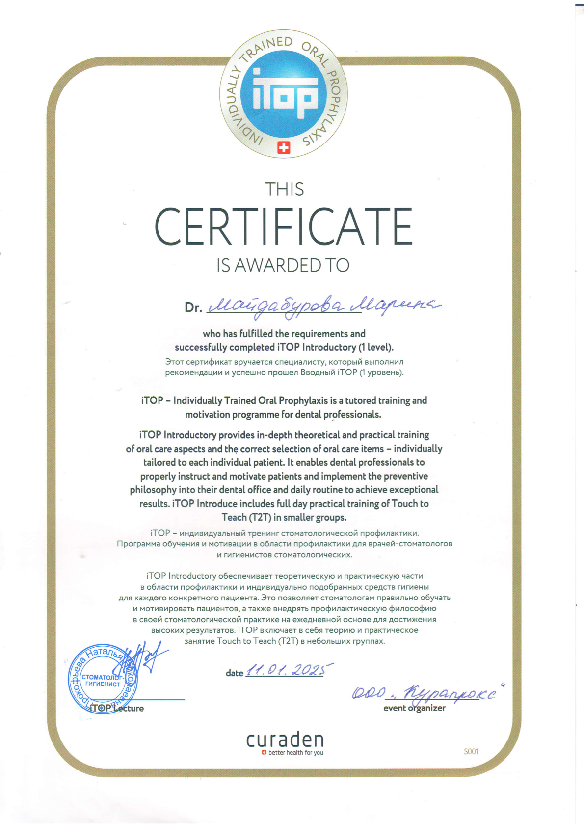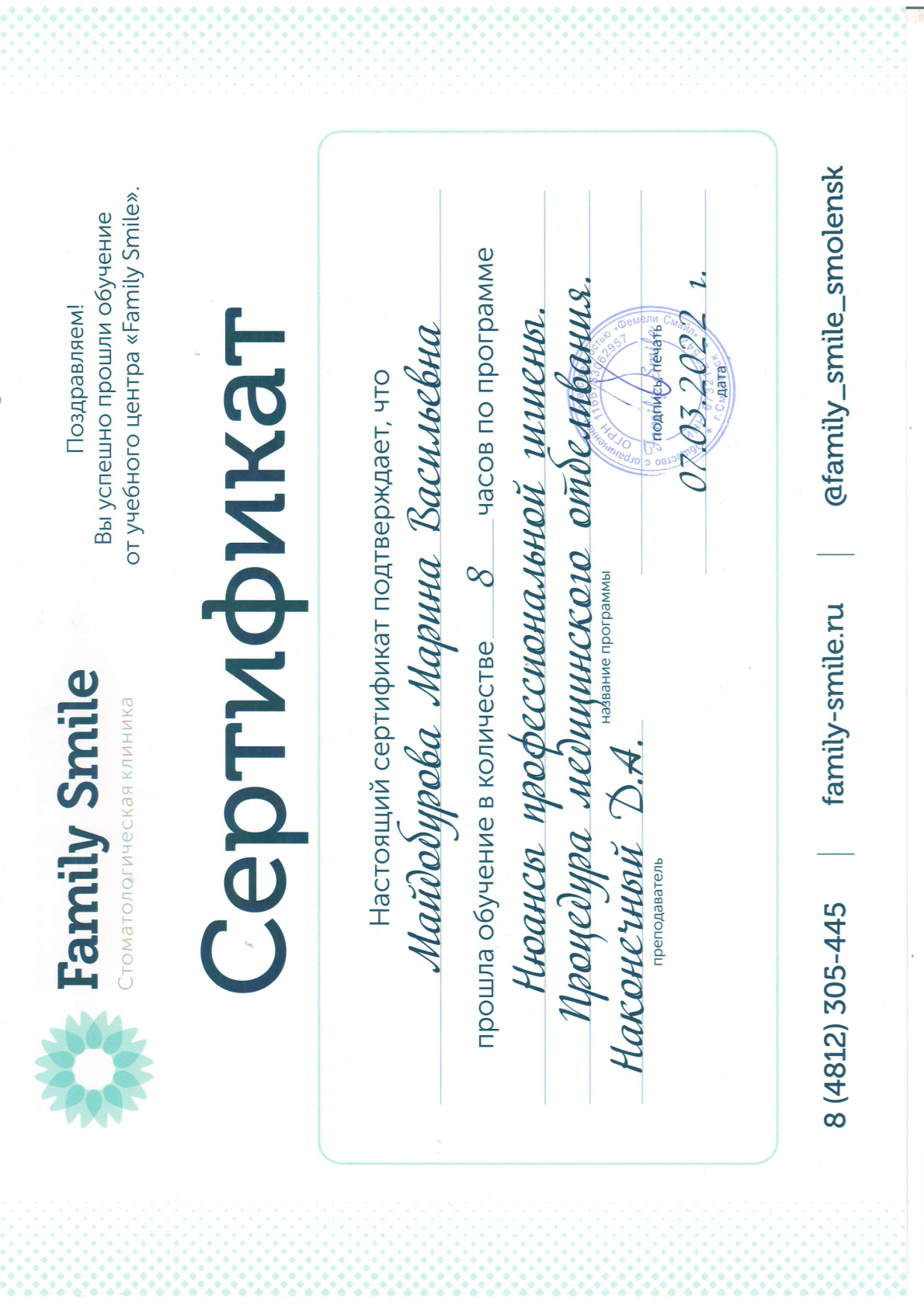 Областное государственное образовательное учреждение «Смоленский базовый медицинский колледж» Сведения о прохождении аккредитации специалиста: № 7725 032838565 от 22.04.2025 "Гигиенист стоматологический" Федеральное государственное бюджетное образовательное учреждение высшего образования «Московский государственный медико-стоматологический университет имени А.И. Евдокимова», 2016-2017 гг. квалификация «Гигиенист стоматологический». Сертификат специалиста №0177242016820 рег.№20217 от 20.10.2020 г. по специальности: «Стоматология профилактическая». • Вводный іТОР (1 уровень) - индивидуальный тренинг стоматологической профилактики. Программа обучения и мотивации в области профилактики для врачей-стоматологов и гигиенистов стоматологических, 11 января 2025 года • Обучение по программе «Нюансы профессиональной гигиены. Процедура медицинского отбеливания», 7 марта 2022 года (Наконечный Д.А.)6 гг.